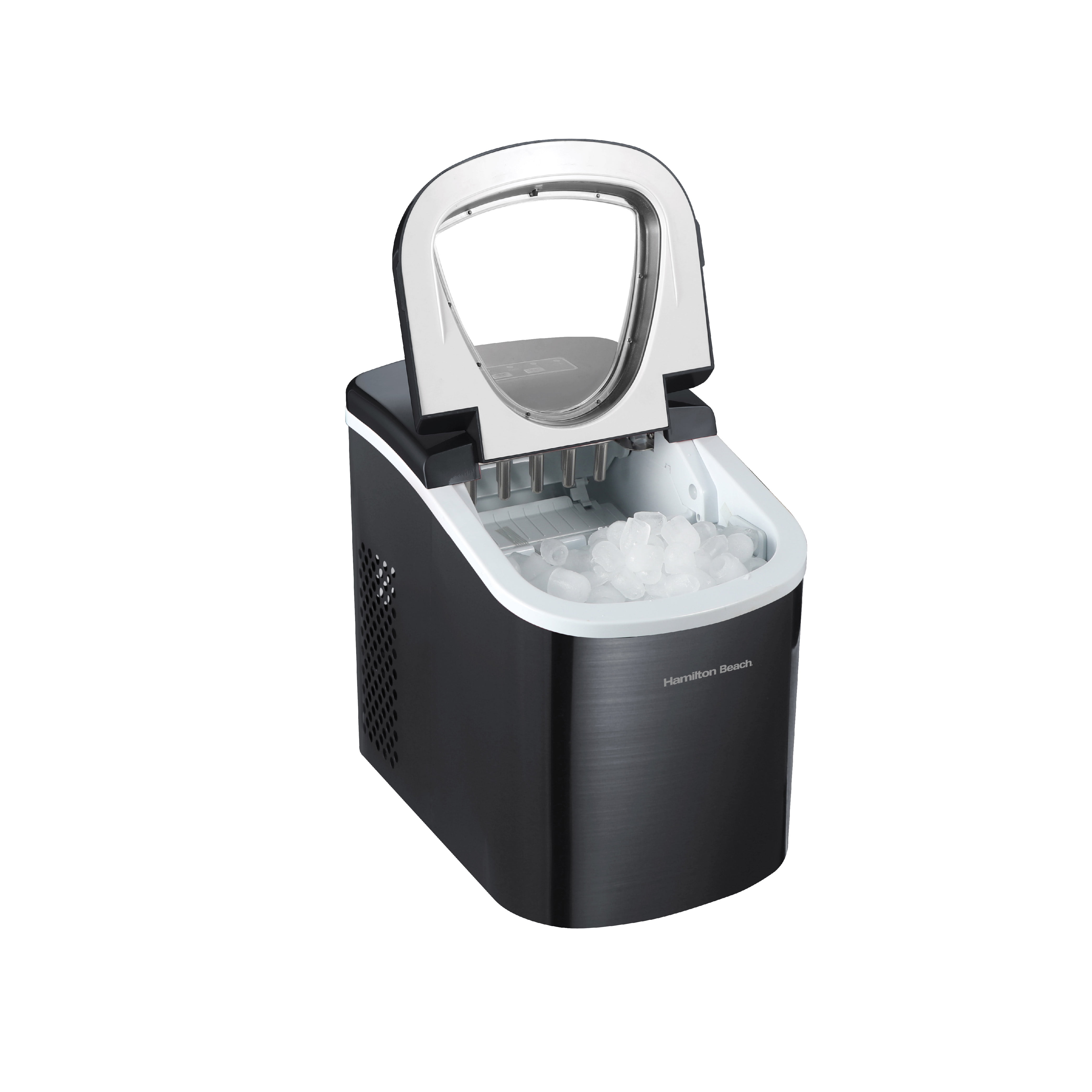 Hamilton Beach 26 lbs Capacity Portable Ice Maker Makes 26 lbs. of ice in 24 hours ensuring that you will always have ice available Extremely quiet design runs at less than 38 decibels, which means your party music will never be overshadowed by your ice maker Store up to 1.5 lb. of ice in the interior basket The inside reservoir holds 2.3 quarts of water LED display and simple-to-use electronic controls make operating your ice maker a breeze Fast ice produces 9 cubes of ice every 7-15 minutes so you will always have a cold drink ready to go A real stainless steel cabinet will complement any décor A large see-through window allows you to see inside the ice maker without opening the lid An ice shovel is included to easily remove the ice in a clean and sanitary manner