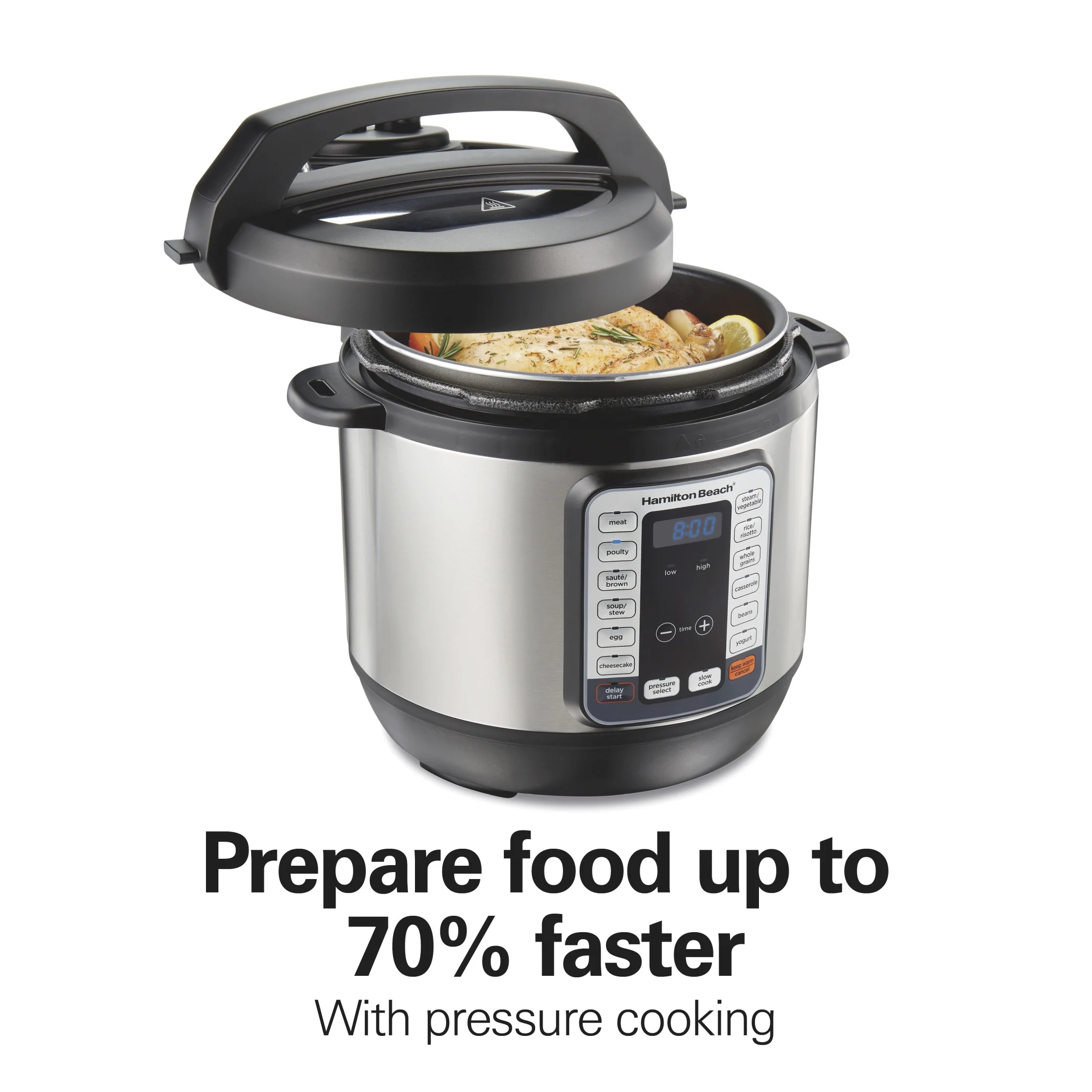 You’ll prepare food up to 70% faster when pressure cooking with the Hamilton Beach QuikCook Pressure Cooker, to get dinner on the table in less time than you ever thought possible. The True Slow technology raises the temperature gradually for classic slow cooking results without overcooking when using the Slow Cook setting. In addition to pressure-cooking and slow-cooking, this pressure cooker is also a rice cooker, steamer, and egg cooker, plus it saut s and browns. It has preset cooking programs for meat, poultry, rice, steamed vegetables, beans, whole grains, casseroles, eggs, soup, cheesecake and yogurt. The brown/saut button lets you add flavor to meals by browning and saut ing foods in the nonstick pot. You’ll find yourself using the Hamilton Beach QuikCook Pressure Cooker for practically everything you cook, from perfect eggs to hearty one-pot meals for the whole family. Includes accessories.