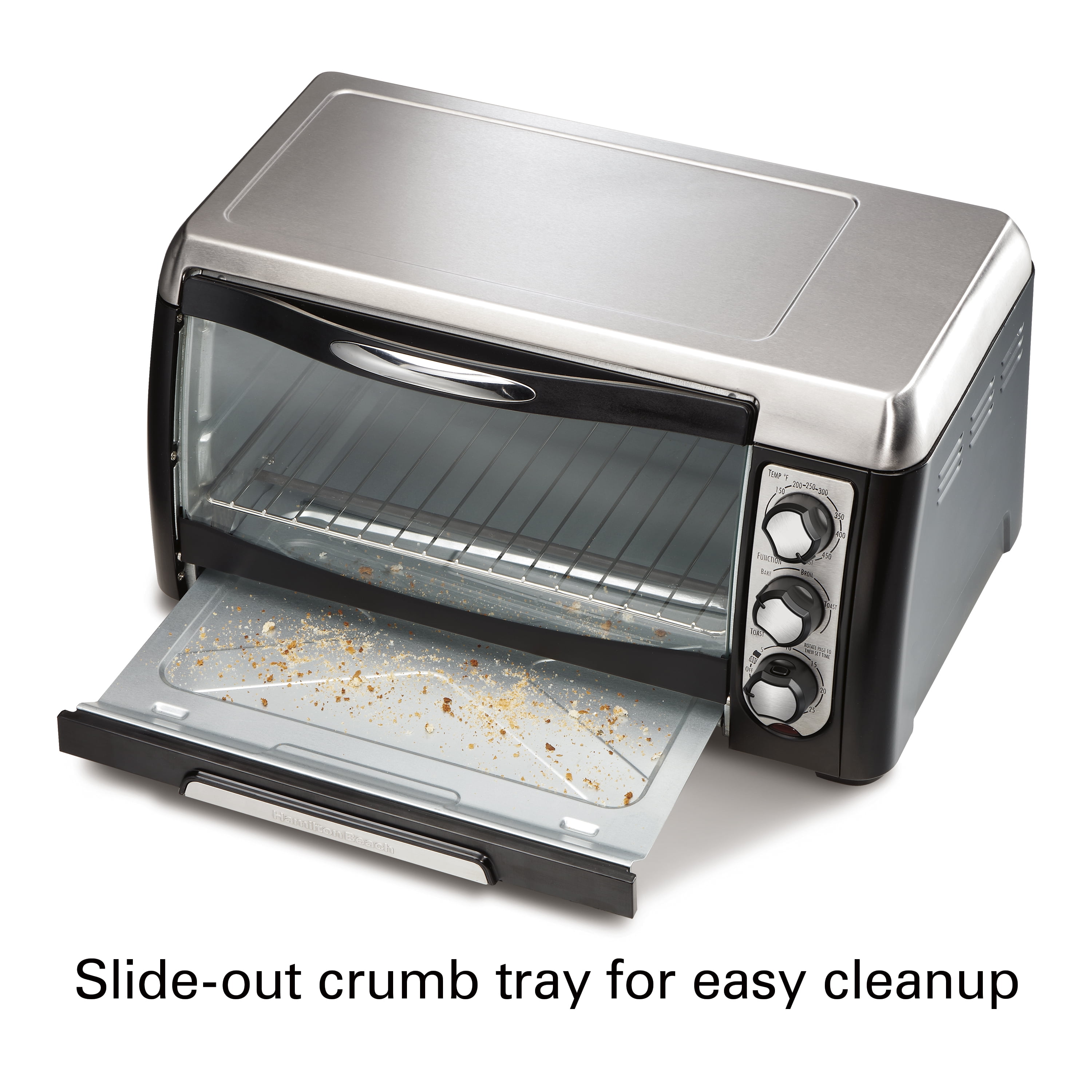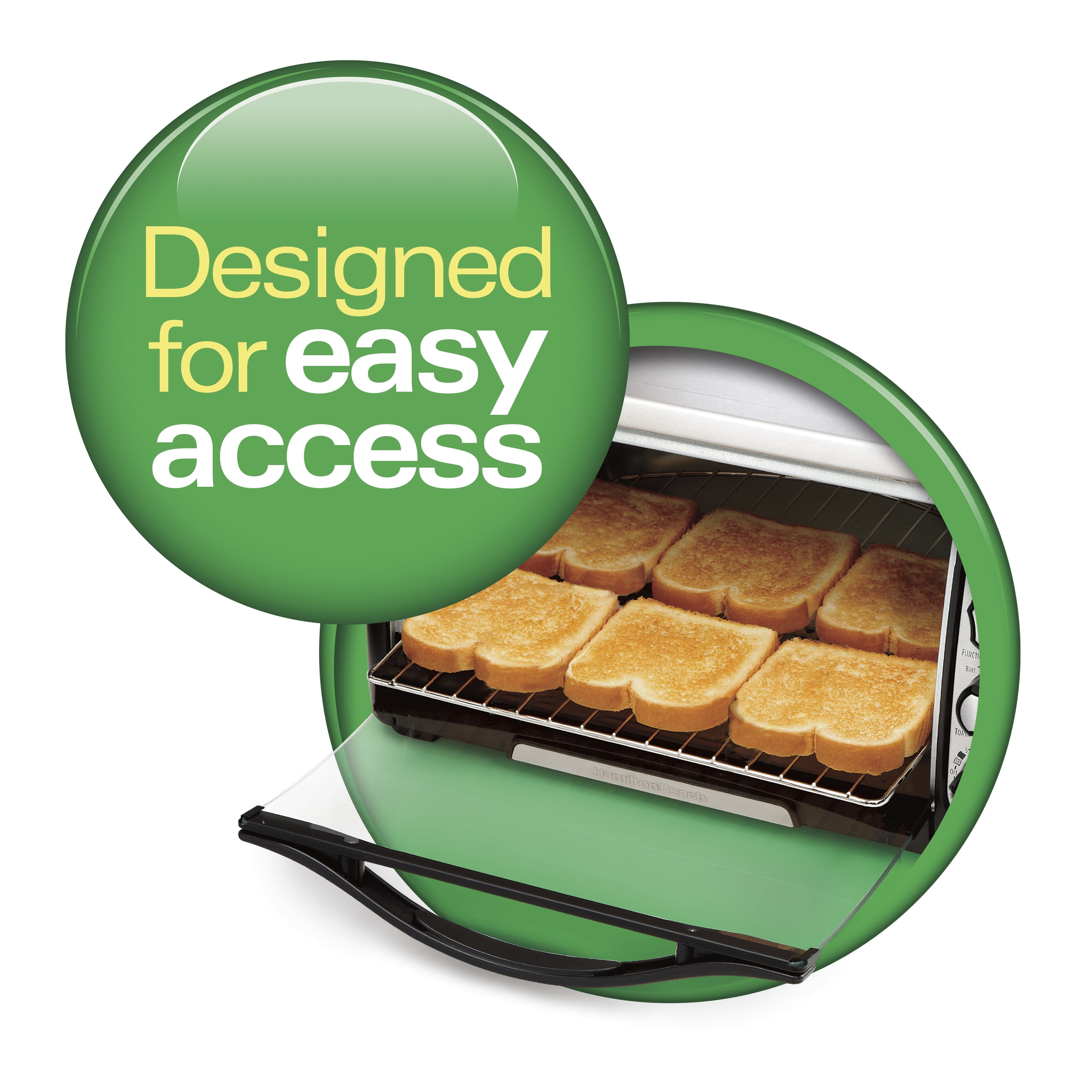 Designed for easy access Large, curved glass door improves access to food Toast, bake & broil settings Fits a large 12 inch pizza Saves time & energy: – Reheats food 28% faster* – Uses 71% less energy* Fits 6 slices of bread or a 12″ pizza 30 minute timer with ready bell Bake pan and broil rack included Removable slide-out crumb tray * Than a typical kitchen oven when reheating precooked frozen chicken nuggets