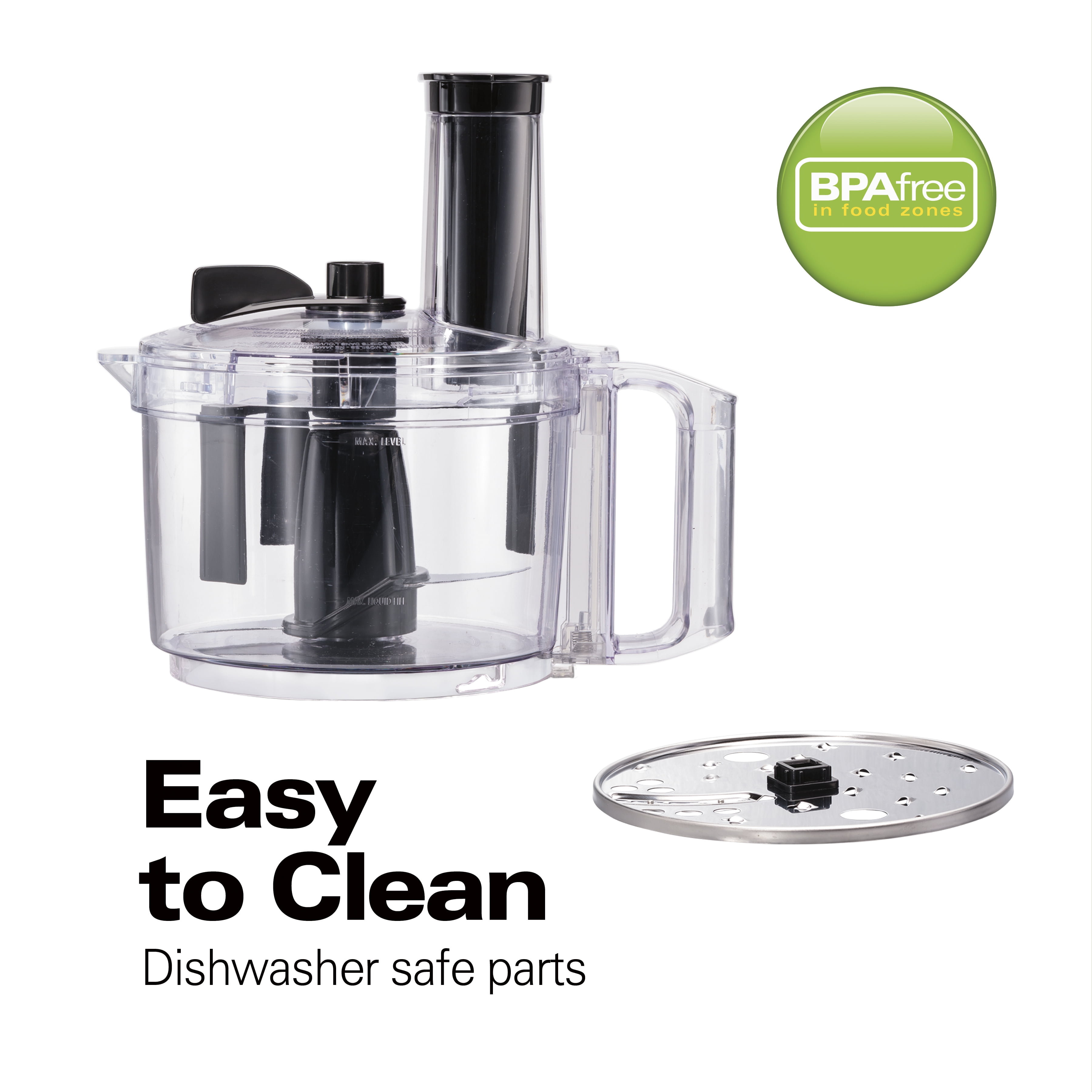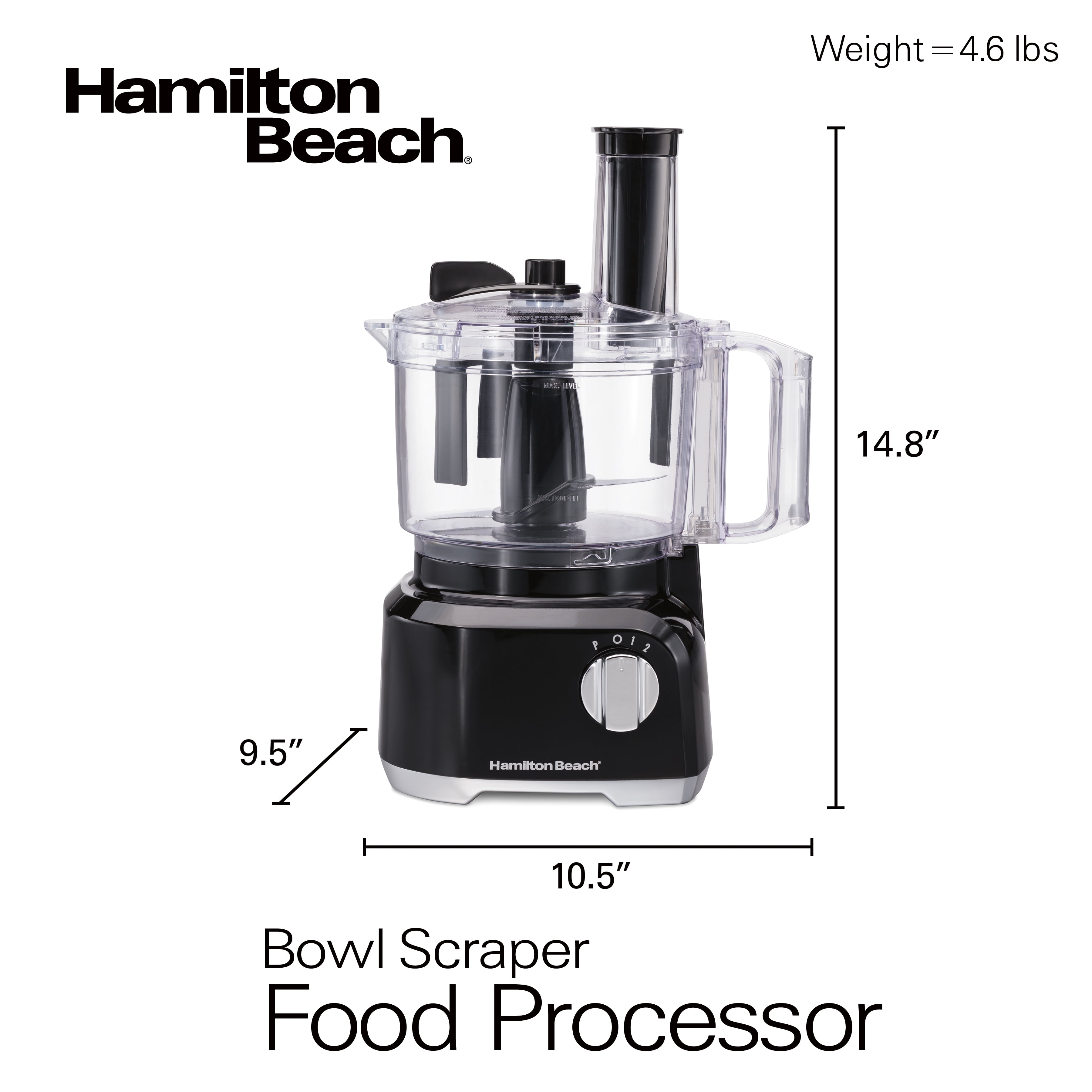 8 cup capacity Scrapes the sides of the bowl — no spatula needed! Chop salsa, puree guacamole, shred cheese & slice vegetables fast Built-in scraper saves time— no need to remove lid & use a spatula 2 speeds plus pulse control Stainless steel slice/shred disc and chopping blade Powerful 450 watt motor Dishwasher safe parts BPA-free in food zones Large feed chute fits a whole block of cheese to reduce pre-cutting Pour spout for mess-free pouring Convenient cord storage Hamilton Beach® Bowl Scraper Food Processor | Model# 707430