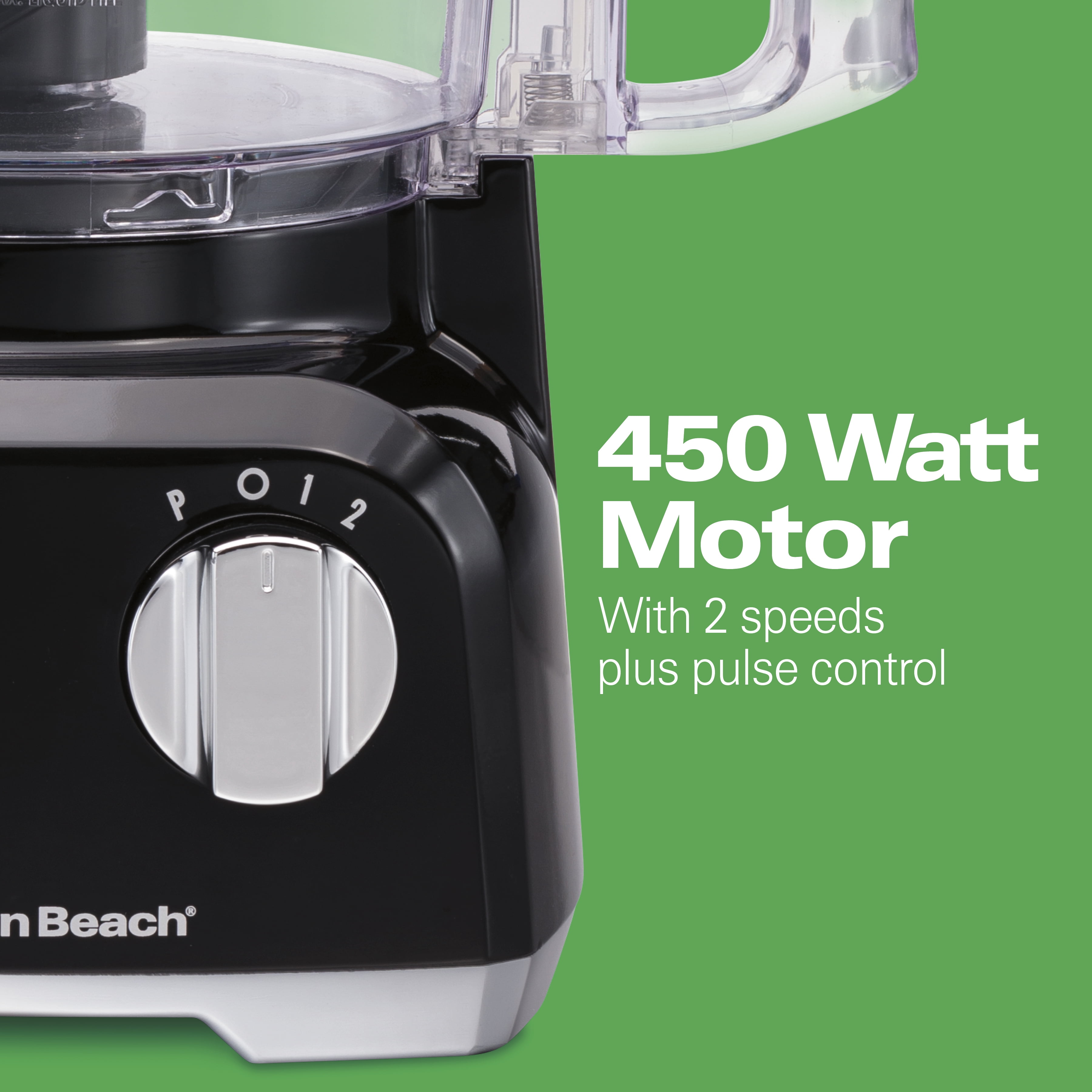The 450-watt motor makes it quick and easy to chop salsa, puree guacamole, shred cheese & slice vegetables fast. 2 speeds plus pulse gives you the control you need for a variety of recipes.