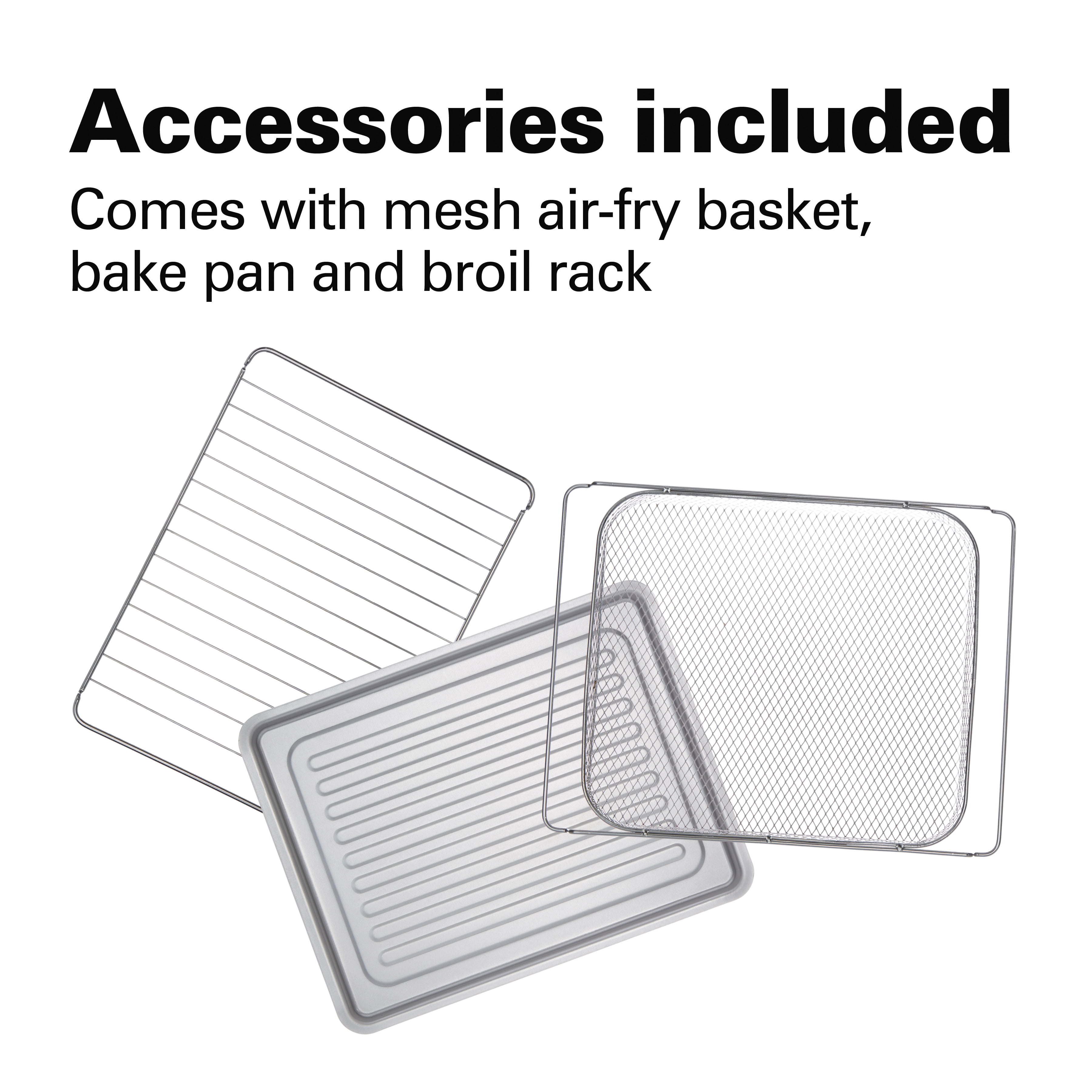 KEY FEATURES: AIR FRY FUNCTION: Circulates air powerfully around food for faster, even cooking with less oil. AIR FRYER OVEN WITH 1800 WATTS OF POWER TO CIRCULATE AIR AROUND FOOD: Higher wattage can result in faster cook times and a crispy finish on food with little to no oil. 6 FUNCTION SETTINGS PROVIDE MANY COOKING OPTIONS. This air fryer countertop oven is ideal to prepare meals using the 6 functions: Air fry, toast, bake, broil, convection bake, and stay-on. VERSATILE COUNTERTOP OVEN AND AIR FRYER IN ONE. This multi-functional air fryer toaster oven combo can bake and broil, plus air fry cooking for great taste with little to no oil. SPACIOUS AIR FRY OVEN. There’s plenty of space in the oven for preparing large family meals. The oven easily cooks a pound of chicken wings, a 12″ pizza, or a large number of snacks. INCLUDES METAL MESH BASKET FOR AIR FRYING, BAKE PAN, BROIL RACK, AND 2 RACK POSITIONS. The air fry oven comes with everything you need to start cooking right away.