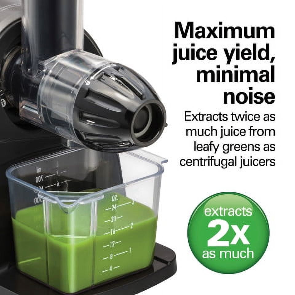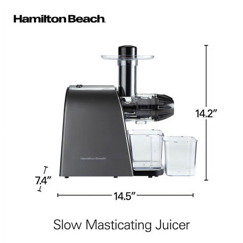Hamilton Beach Cold Press Juicer, Silver and Black, Model 67951: MAKE FRESH, HEALTHY COLD-PRESSED JUICE: Transform a wide variety of fruits and vegetables into nutritious juice with this versatile juice machine. Juicing is an easy way to get your daily recommended allowance of vitamins and minerals. Recipes included. EASY TO CLEAN: Cleaning up after you juice is easy. The parts on the masticating juicer easily rinse clean with no scrubbing required. The juicer comes with a convenient strainer cleaning brush and dishwasher safe pulp bin, juice bowl, lid and pusher. MAXIMUM JUICE YIELD, MINIMAL NOISE: The Tritan* auger driven by a 150 watt motor crushes and squeezes produce at a slow speed to extract the maximum juice with minimal noise. It extracts twice as much juice from leafy greens as centrifugal juicers. SMOOTHER JUICE: Slow masticating action on this fruit juicer and vegetable juicer creates smoother texture and less separation than centrifugal juicers for delicious, great tasting juice. FOAM-FREE JUICE WITH 24 OZ. JUICE CUP: The 24 oz. BPA-free juice cup with froth separator that comes with the juice extractor keeps juice neatly contained and strains off the froth when pouring juice. * Tritan copolyester is a trademark of Eastman Chemical Company. **Source: The NPD Group, Inc./Retail Tracking Service, 12 ME Feb. 2021, US unit sales.