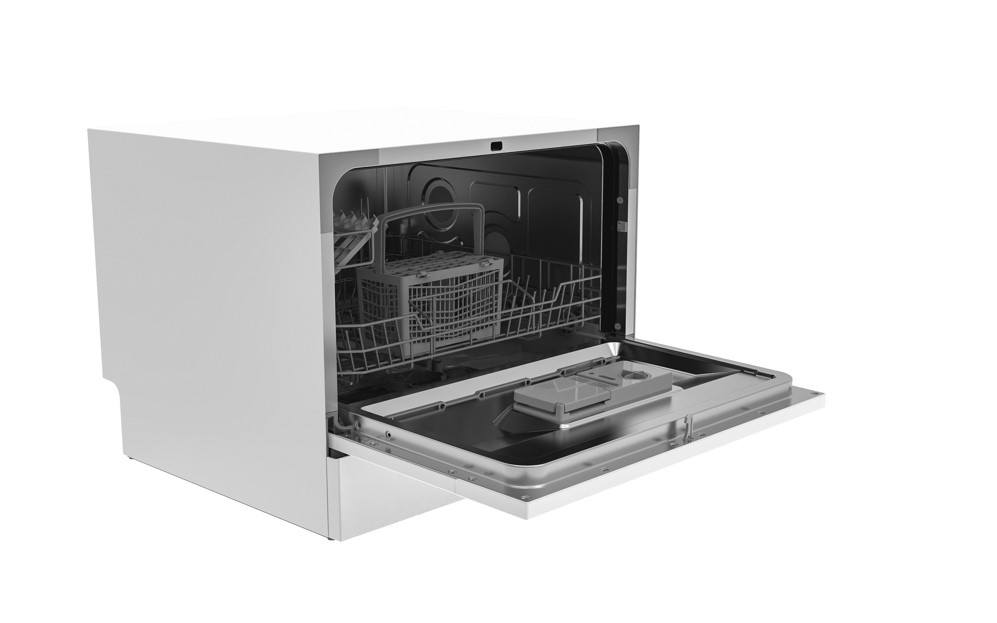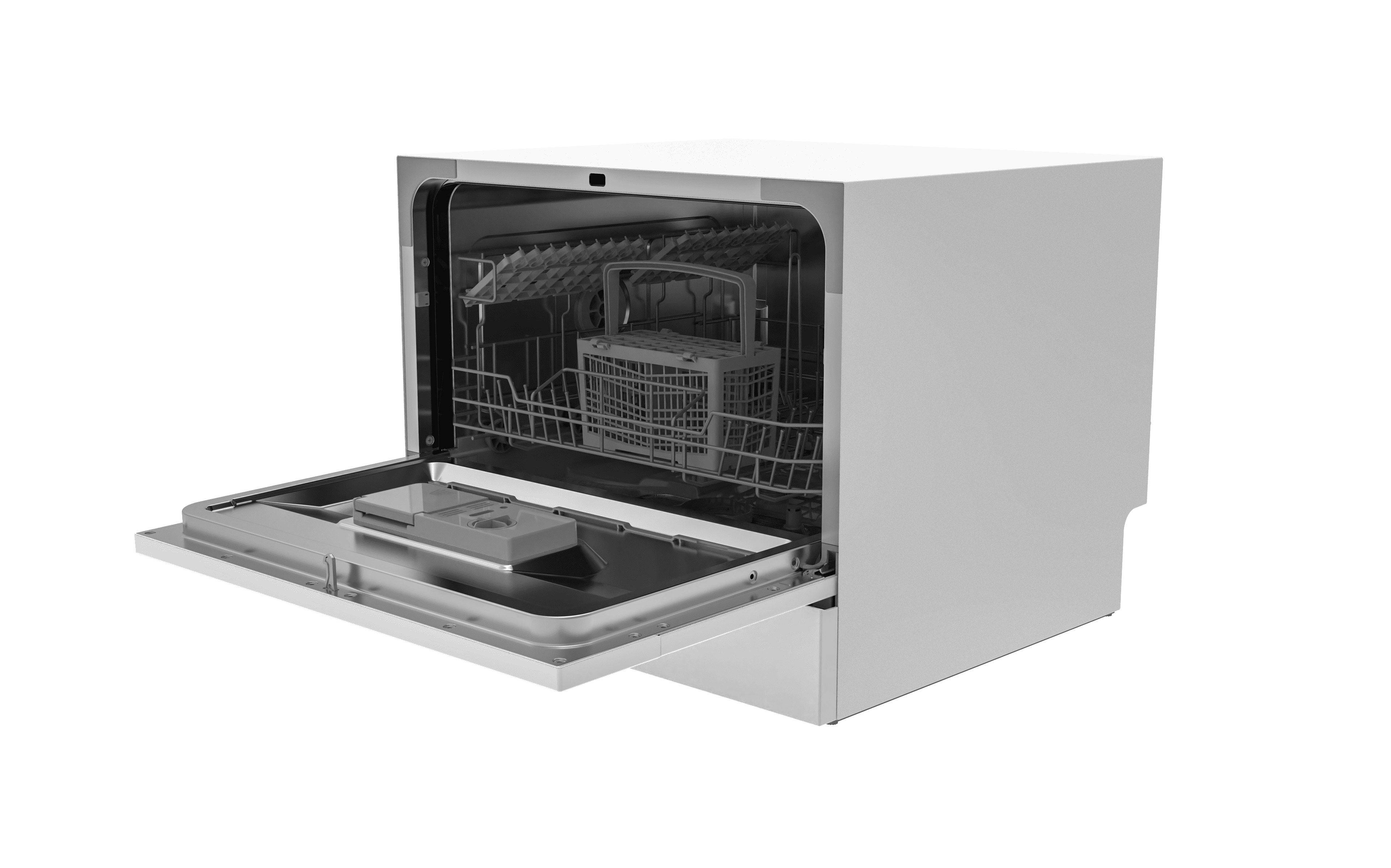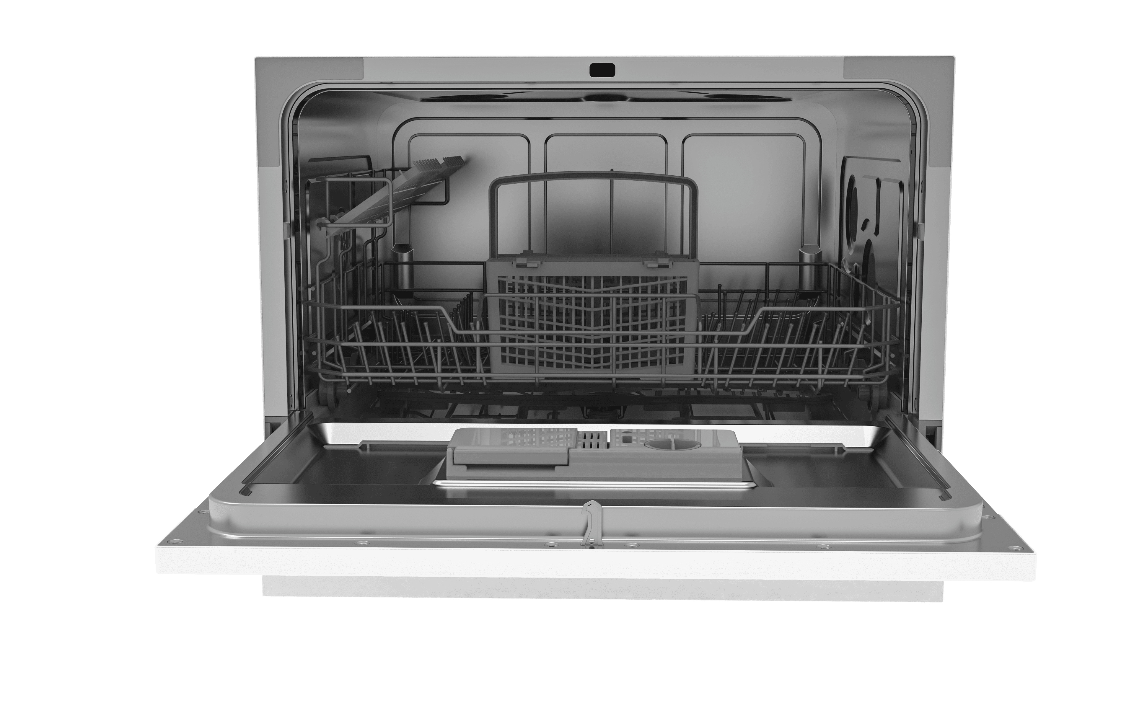 Compact countertop dishwasher helps you clean your dishes when you’re low on space; Measures 24 inches deep, 22 inches wide, and 20 inches tall Spacious interior features a 2-tier basket with room for 6 place settings Efficient cleaning with 2 programs (heavy and normal), 2 low spray arms, detergent dispenser, and rinse aid dispenser for a spotless clean Uses only 3 gallons of water on the normal setting, helping you use water efficiently for less water consumption and water bill savings Easy-to-clean white exterior and stainless steel interior tub Uses residual heat from hot water to dry your dishes in a hygienic and efficient way Fits on any kitchen countertop, great choice for small kitchens, apartments, and even RV kitchens Prevents water overflow with anti-flood floating switch devise that automatically turns off the dishwasher Visible, 600-volt heating elements Color: White Dimensions (L x W x H): 24 x 22 x 20 inches Manufacturer warranty: 1-year warranty
