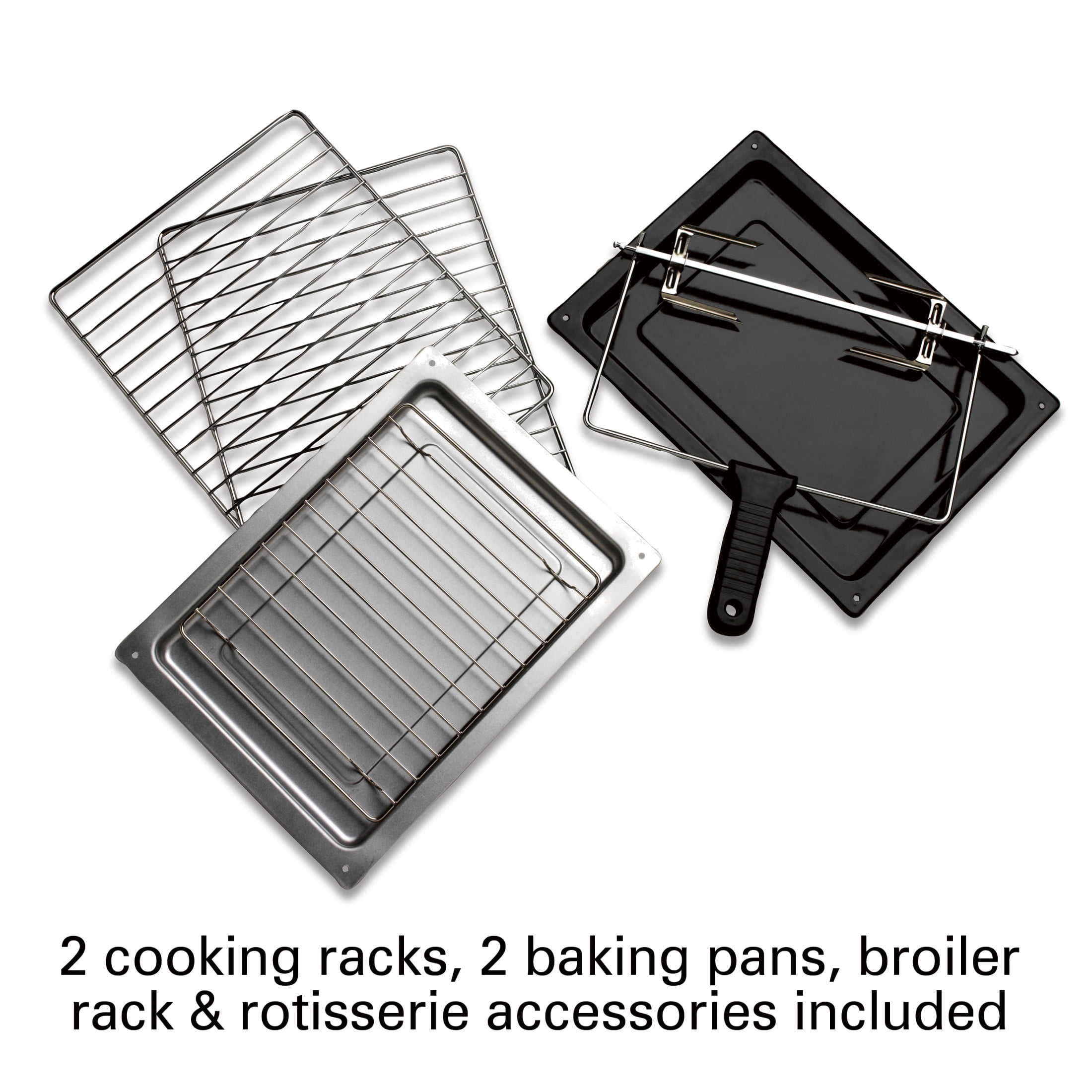 EXTRA-LARGE CAPACITY. Fit two 12” pizzas, two 9” x 13” casseroles, or two cake pans. REVOLVING ROTISSERIE. Self-basting rotisserie locks in your food’s flavor and juices, while turning the outside brown and crispy. Fits a 5 lb. chicken. CONVECTION. Bakes faster and more evenly than a traditional oven. BAKE BROIL SETTINGS WITH 2-HOUR AUTO SHUTOFF. Includes removable drip tray, rotisserie skewer and lifter, 2 racks, 2 baking pans, and broiler rack. EASY-TO-USE CONTOURED KNOBS. Not only is this new design easier to maneuver, but they’re safer too.