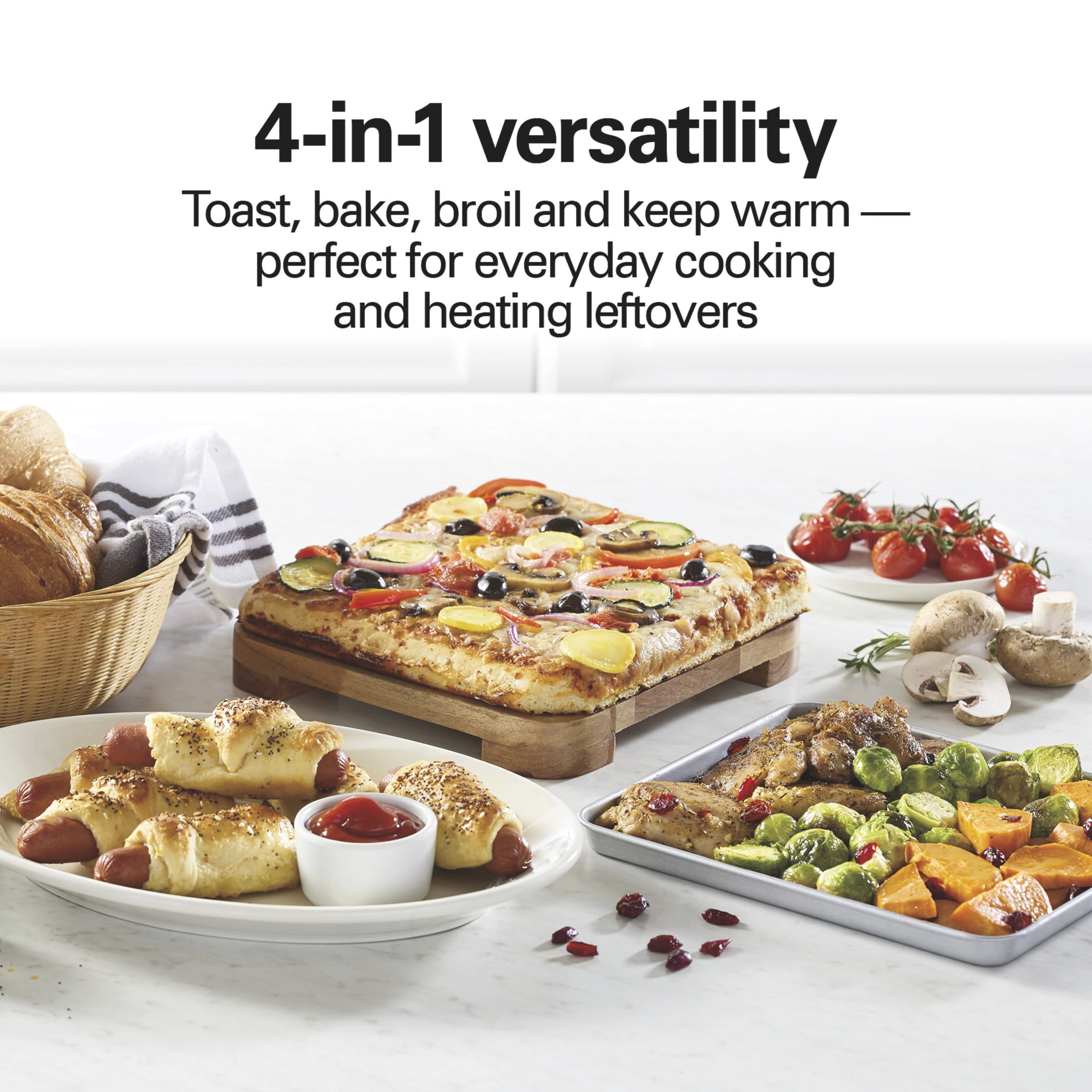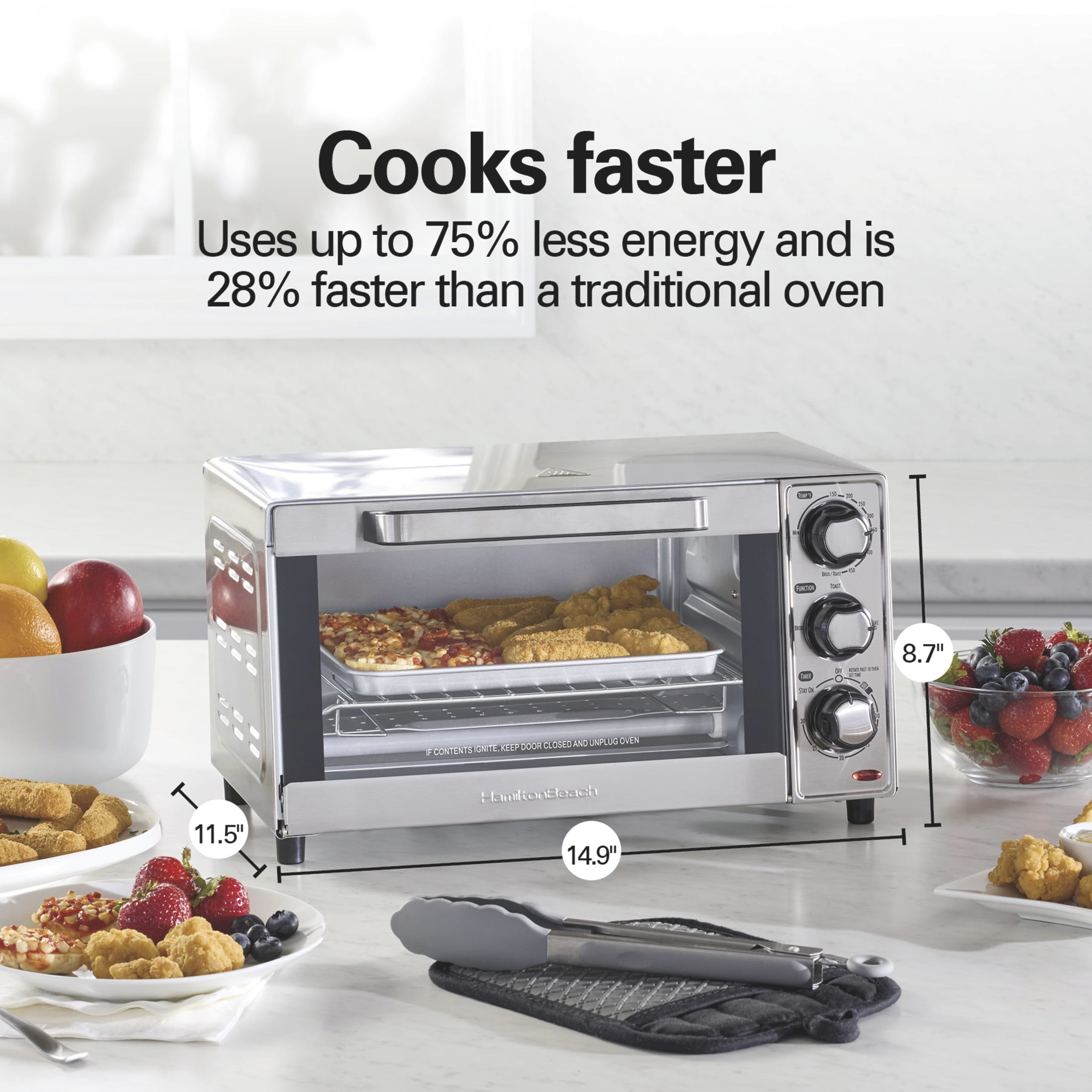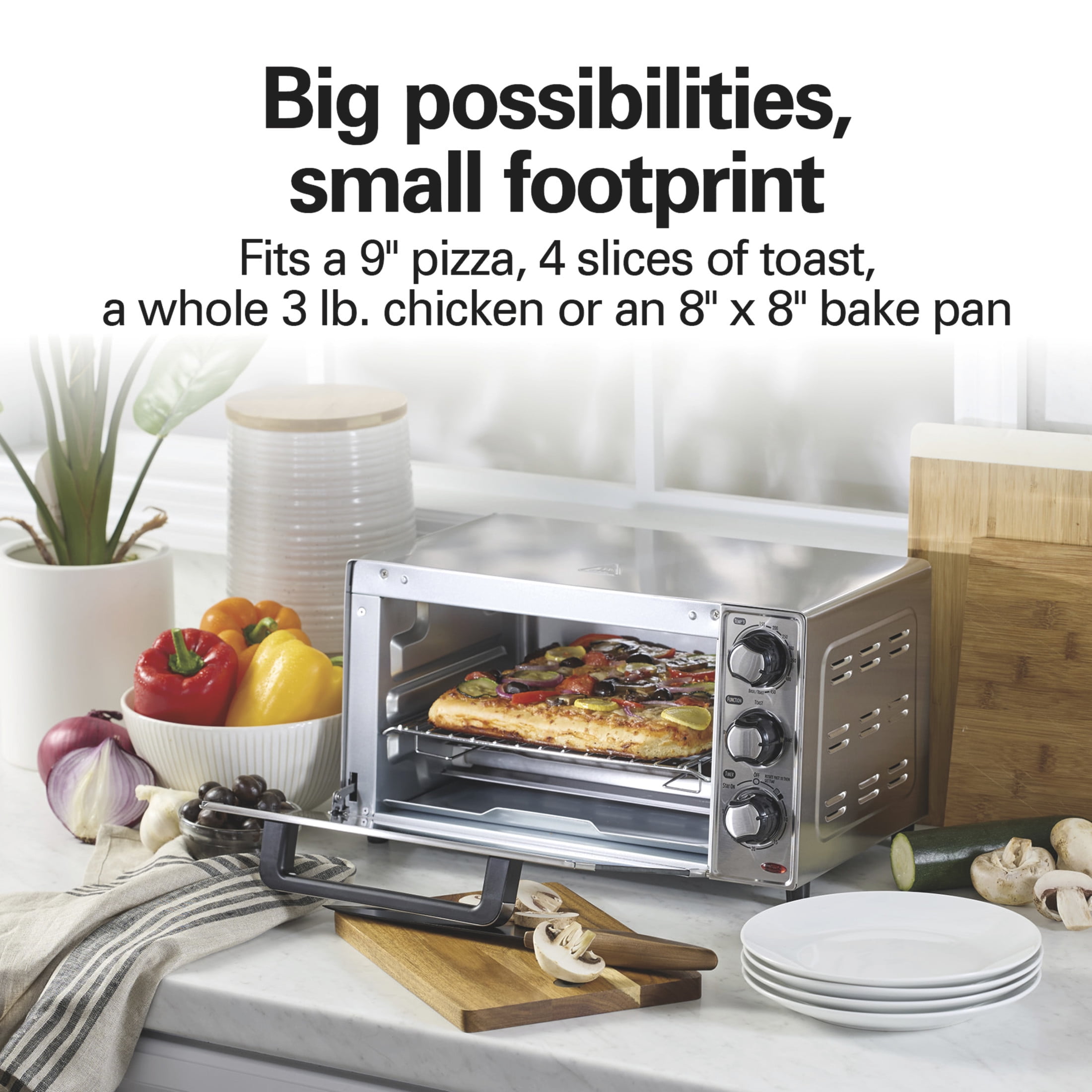 Level up your toasting game with the futuristic Hamilton Beach 4-Slice Toaster Oven This handy device can accommodate large items such as a 9” pizza or 4 slices of bread! Includes bake, broil and toast settings to allow you to get creative in the kitchen Comes in a brilliant silver design to suit any home decorating scheme This great alternative to a traditional toaster can serve up to 4 standard toast slices at once Designed with a timer with auto shutoff