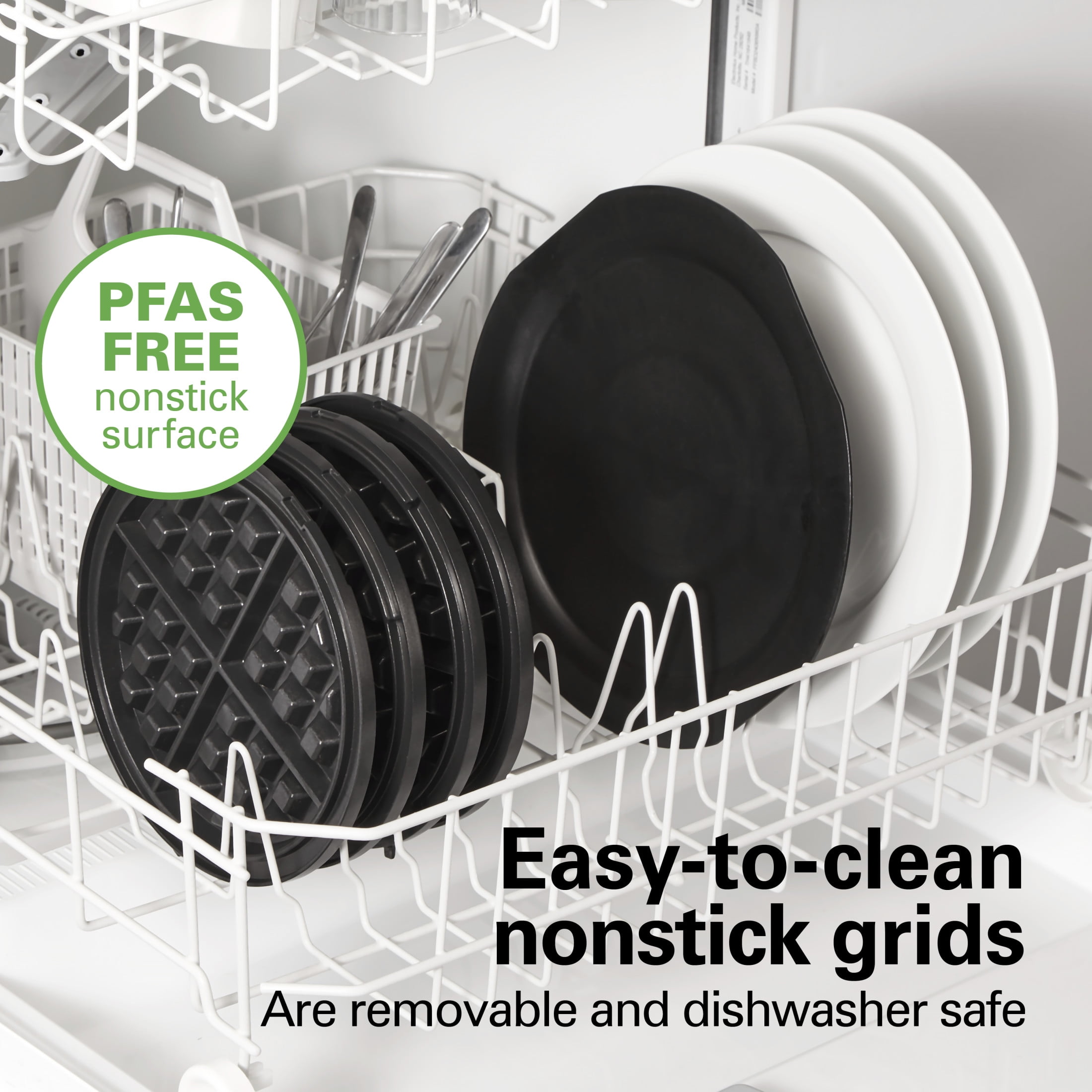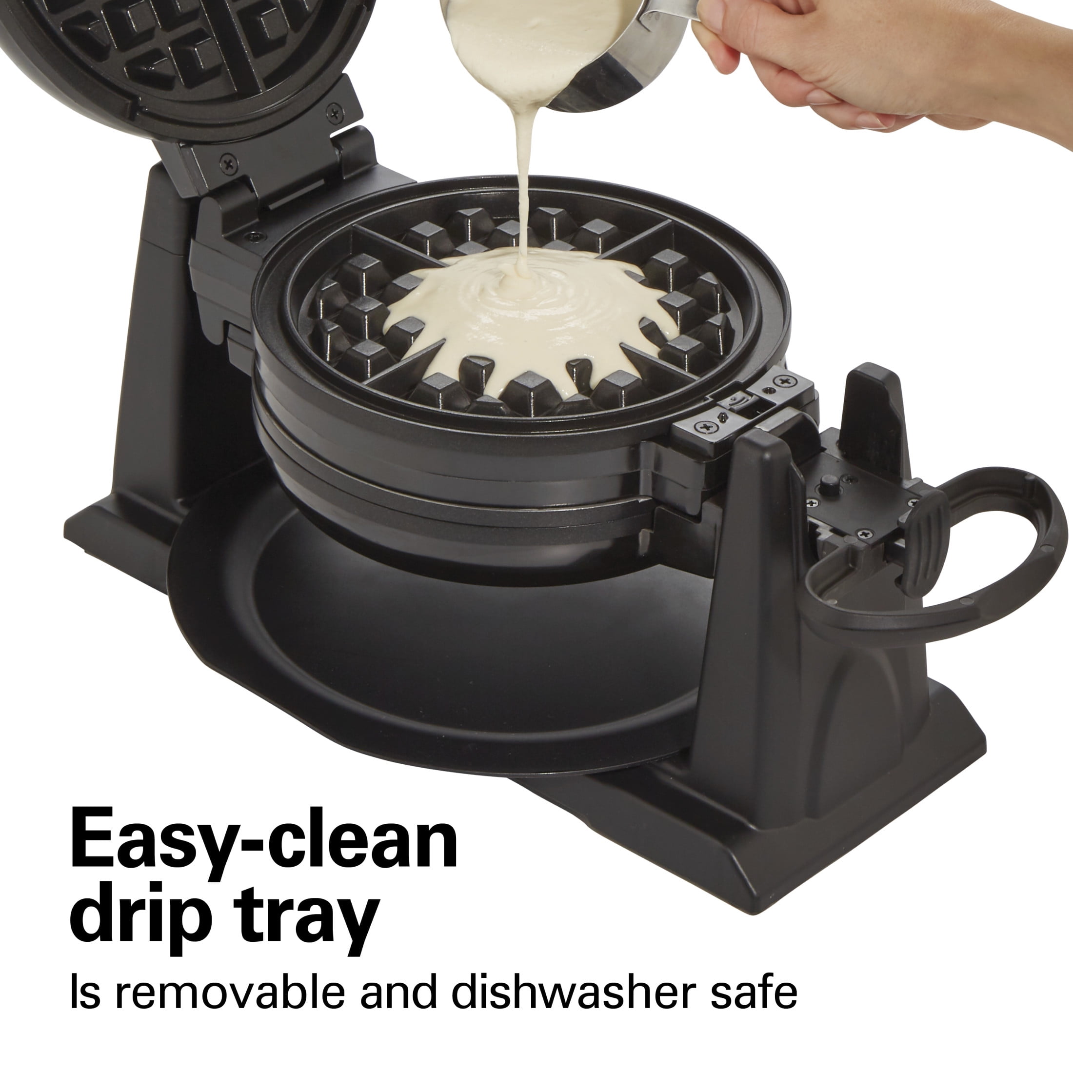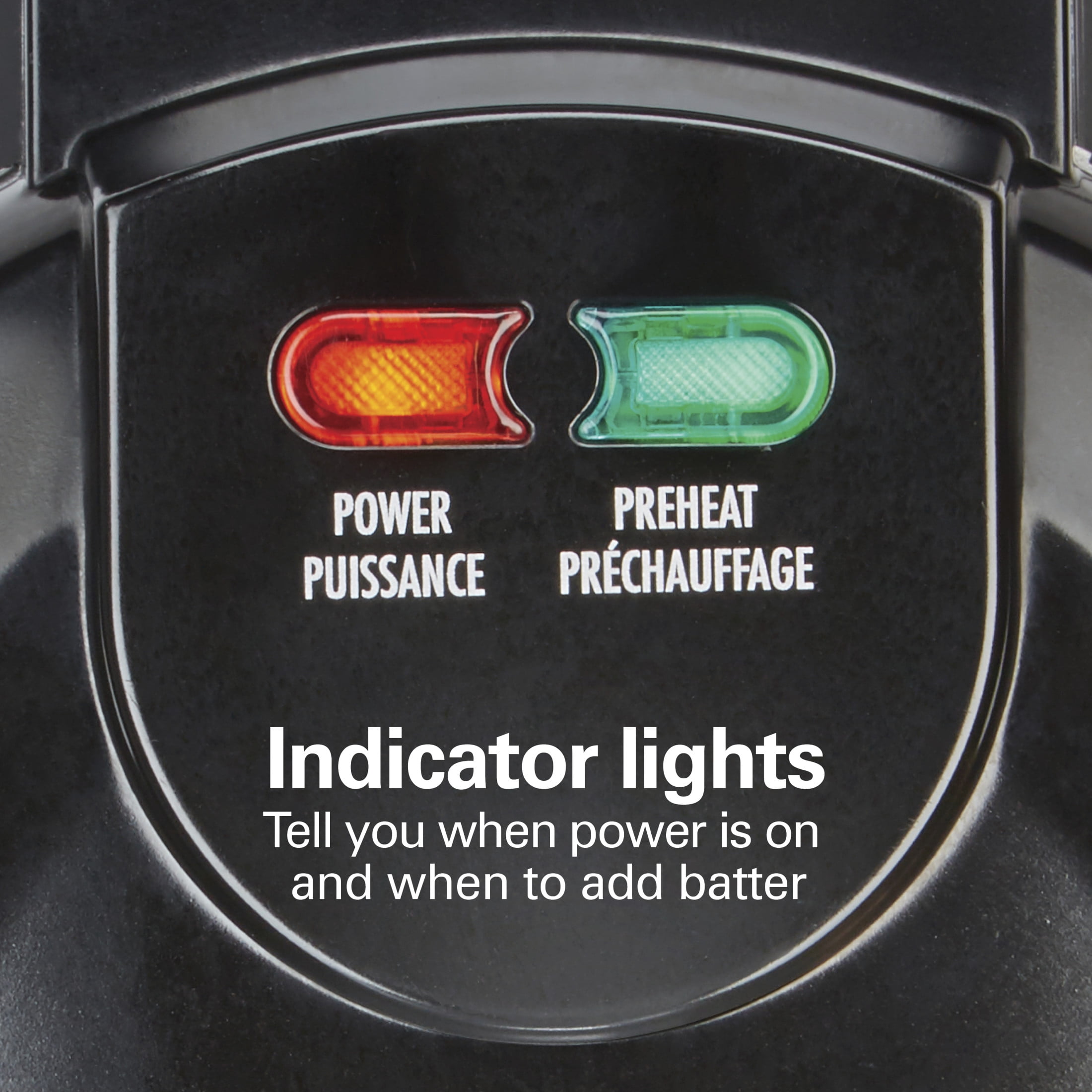 With the Hamilton Beach Double Belgian Waffle Maker, you can make two perfectly cooked Belgian waffles at the same time to feed a hungry family fast and get everyone out the door in the morning. Whether you cook one or two waffles at a time, your Belgian waffles will be golden brown and crisp on the outside and soft and fluffy on the inside, similar to the waffles you get in your favorite restaurants. The flipping action is what makes the waffles turn out so fluffy, evenly browned, and delicious. This versatile Belgian waffle maker is perfect for feeding yourself or a crowd, while letting everyone choose their favorite waffle flavors. Indicator lights show you when the power is on and when the waffle iron is hot enough to add the batter. The handle is easy to hold, while locking and flipping the waffle iron. The removable drip tray prevents messy spills. And the drip tray and removable nonstick coated grids are easy to clean, whether you prefer to wash them by hand or in the dishwasher.