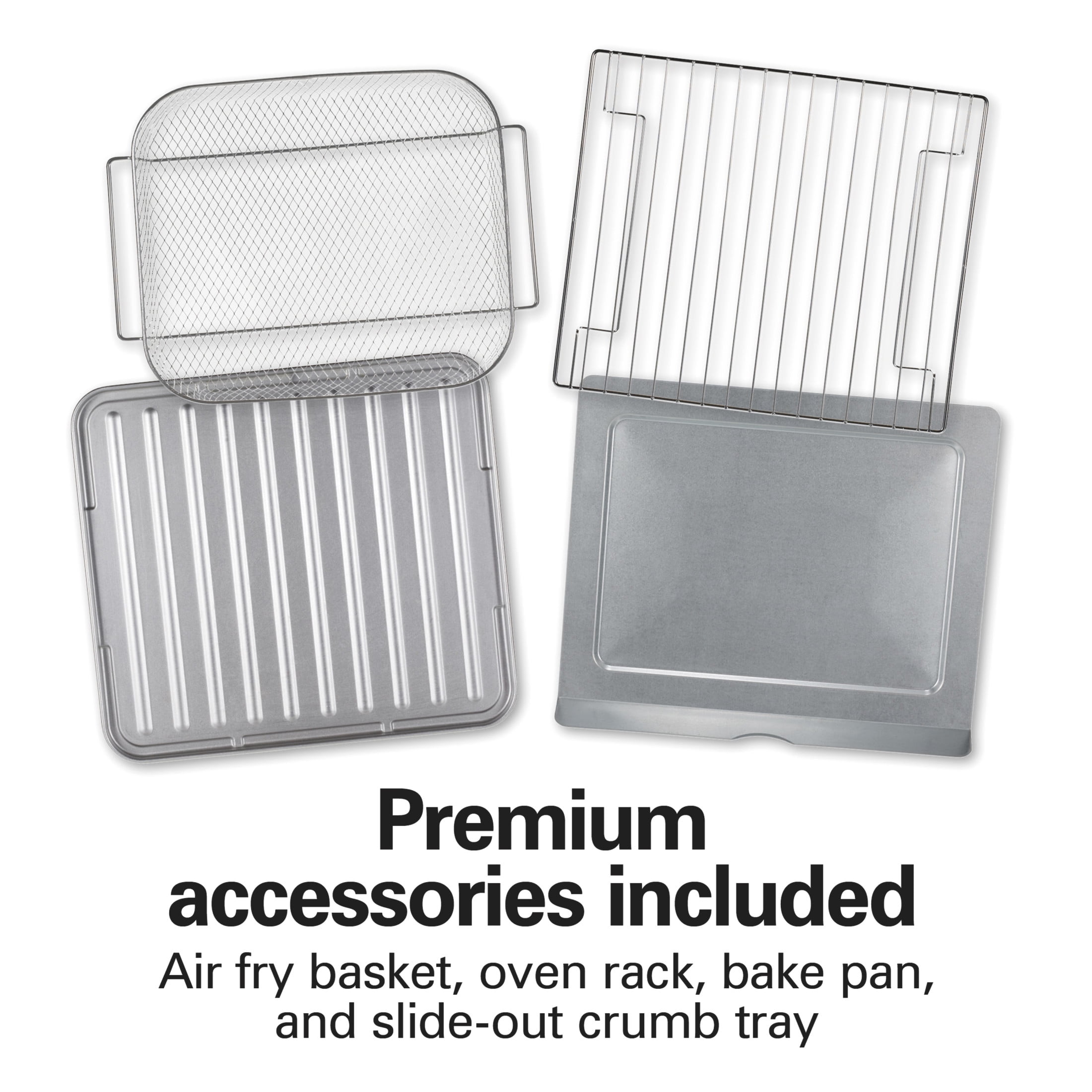 The Hamilton Beach Easy View XL Toaster Oven with Sure-Crisp Air Fry lets you clearly see food as it cooks, and the extra-large size fits all your favorite foods. Features 5-in-1 functionality with air fry, broil, convection bake, bake and toast. This Toaster Oven with Sure-Crisp Air Fry is the high-performance, stylish oven every family needs. No matter what you’re cooking, the large easy-view window lets you monitor your food at a glance without opening the door. The extra-large size is roomy enough to cook all your favorite dishes and easily fits an 8 lb. chicken, 12” pizza or 6 slices of toast. This versatile oven has 5-in-1 cooking functionality, so it’s an air fryer, broiler, convection oven, traditional oven and toaster all in one. You’ll love the variety of cooking settings that give you 5 different ways to cook. Air fry chicken or French fries with Sure-Crisp® air fry, broil fish fillets, make hot sandwiches, bake cookies, toast bread and much more. The easy-to-use controls include a 150°F to 450°F temperature control dial, 60 minute cooking timer with automatic shutoff and ready bell, stay-on setting and power indicator light. Includes mesh air fry basket, bake pan, oven rack and slide-out crumb tray. Condition: New