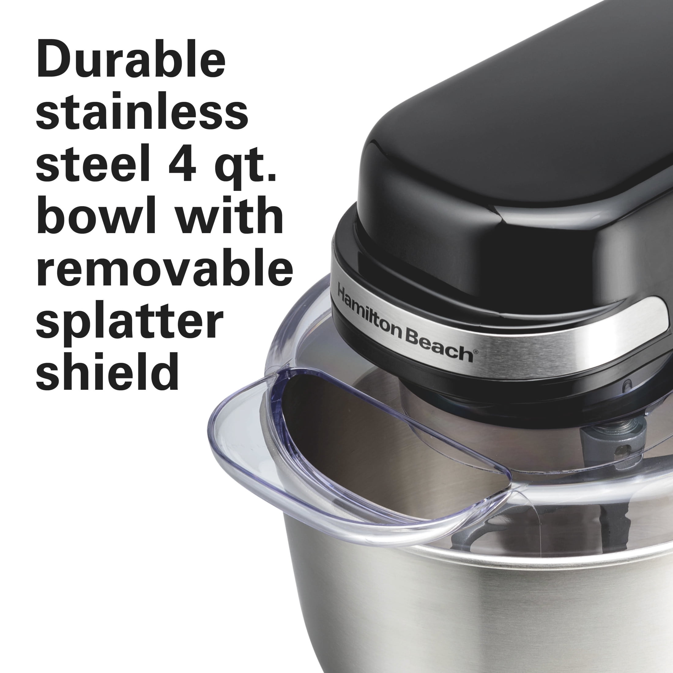 The Hamilton Beach® Stand Mixer easily handles every mixing task with 7 speeds and has the same mixing action as the higher-priced brands for complete bowl coverage. THOROUGH MIXING AND COMPLETE BOWL COVERAGE. As you mix, each attachment rotates around the entire bowl as it spins at your selected speed. This planetary mixing action ensures that ingredients are mixed thoroughly and provides complete bowl coverage. POWERS THROUGH THE THICKEST DOUGH AND MAINTAINS CONSTANT SPEED. No matter how thick or heavy your ingredients are, the powerful 300 watt motor of this kitchen stand mixer maintains constant speed. PROVIDES MIXING VERSATILITY — DOUGH HOOK, WHISK AND FLAT BEATER INCLUDED: 3 versatile attachments let you do everything from kneading pizza dough to mixing cookie dough and whipping cream.. DURABLE STAINLESS STEEL 4 QUART BOWL WITH REMOVABLE SPLATTER SHIELD. The stainless steel bowl is designed to withstand year after year of mixing and includes a removable splatter shield that fits on top when needed. Dishwasher safe for easy cleanup.