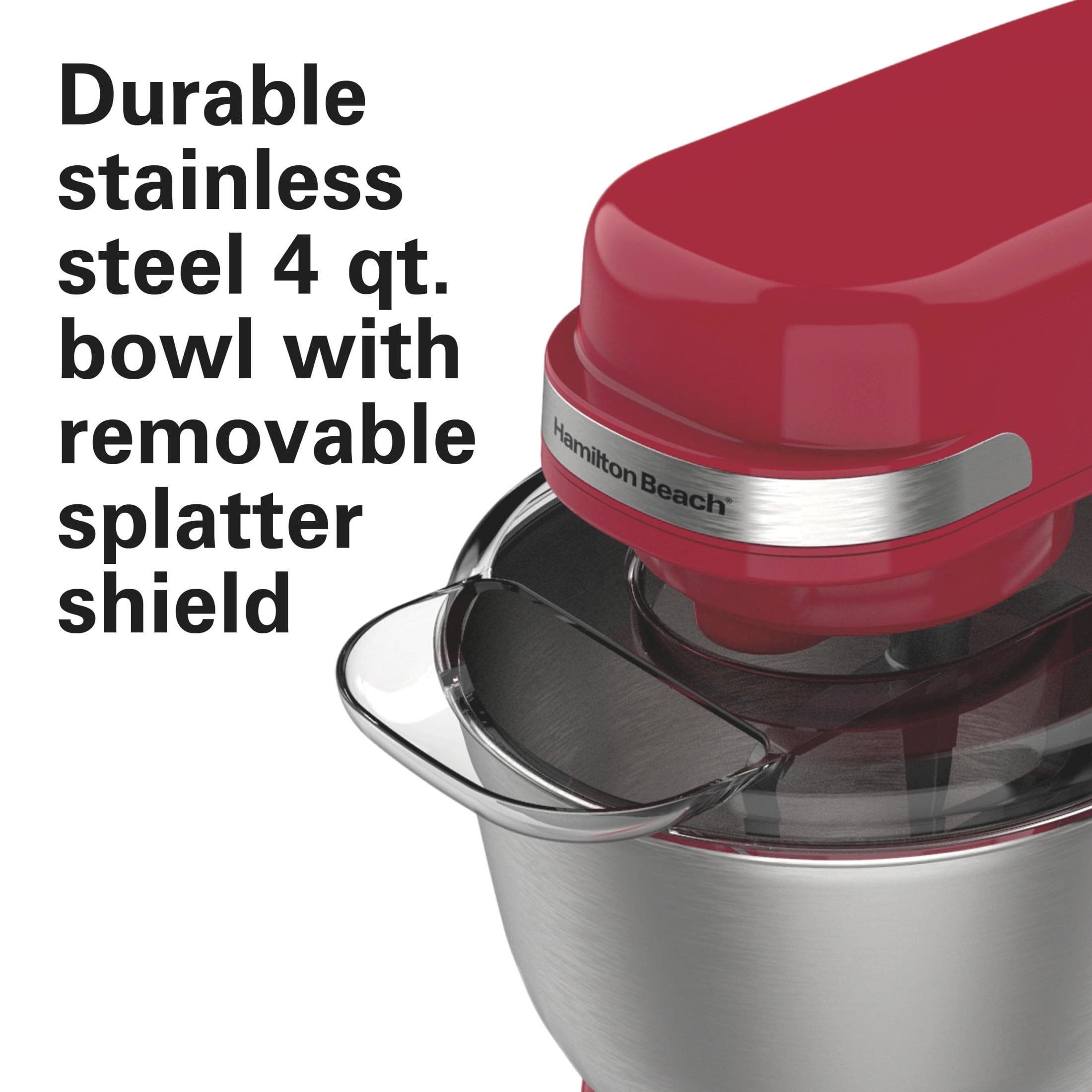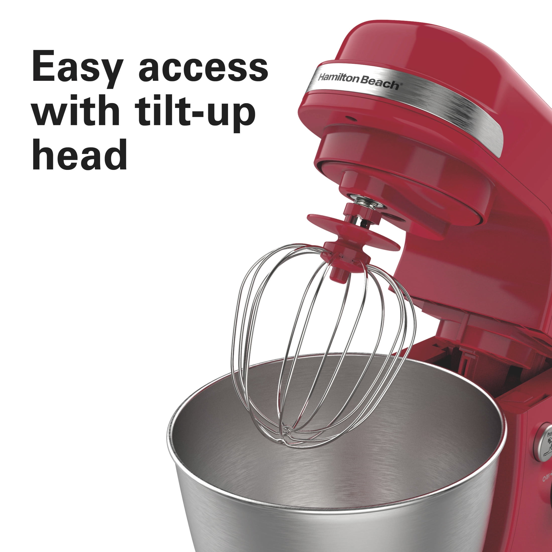 Hamilton Beach 4 Quart Stand Mixer for Kitchen, 7 Speeds, Tilt-Head, Dough Hook, Whisk & Flat Beater, Red