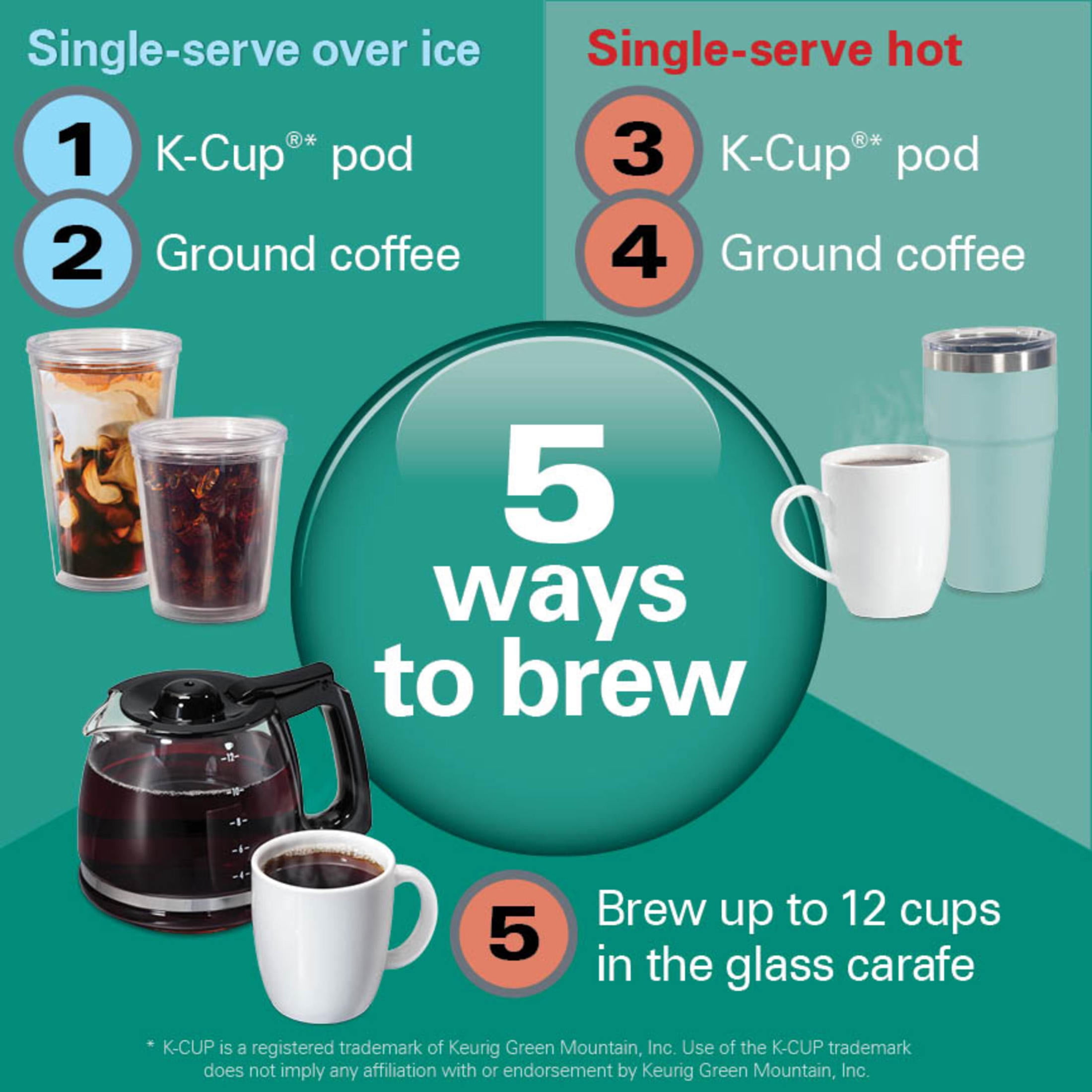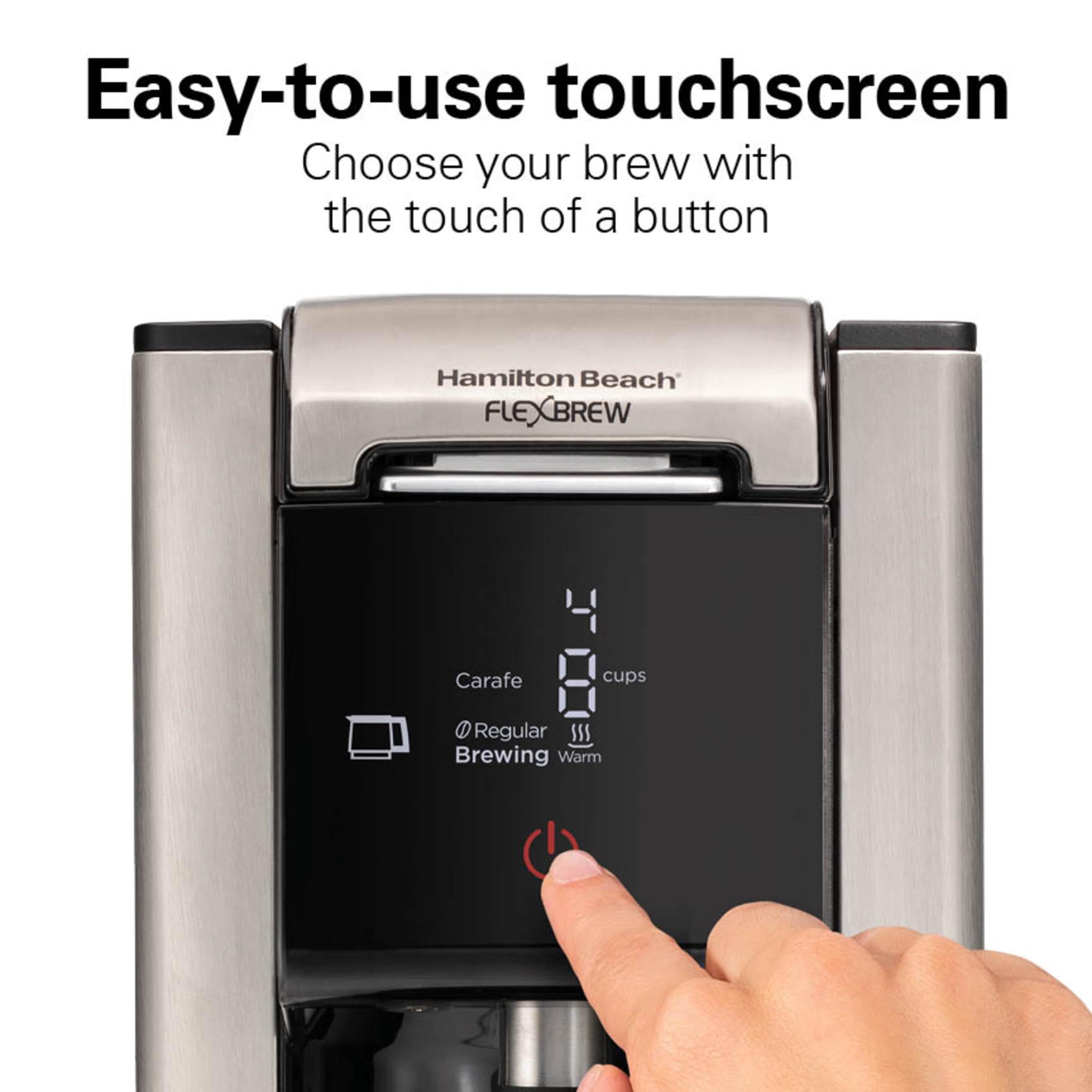 Hamilton Beach FlexBrew Advanced Black 12-Cup Drip Coffee Maker 5 Ways to Brew: Brew a single cup of iced or hot coffee using a K-Cup®* pod (up to 10 oz.) or ground coffee (up to 14 oz.). Brew up to 12 cups of hot coffee in the carafe with your favorite ground coffee Space-Saving Design: This streamlined machine takes up just 7″ of width while featuring a hidden 12-cup carafe on its side Wake Up to Fresh Coffee: The touchscreen includes Auto Brew, allowing you to wake up to a fresh-brewed single cup or up to 12 cups in the carafe. Choose between regular and bold brewing options for your preferred strength Fast Brewing: Brew a single cup in less than 2 minutes, giving you more time to enjoy your coffee in the morning Large Capacity: Brew up to 12 cups in the carafe or up to 7 single servings without needing to refill, thanks to the 60 oz. removable water reservoir