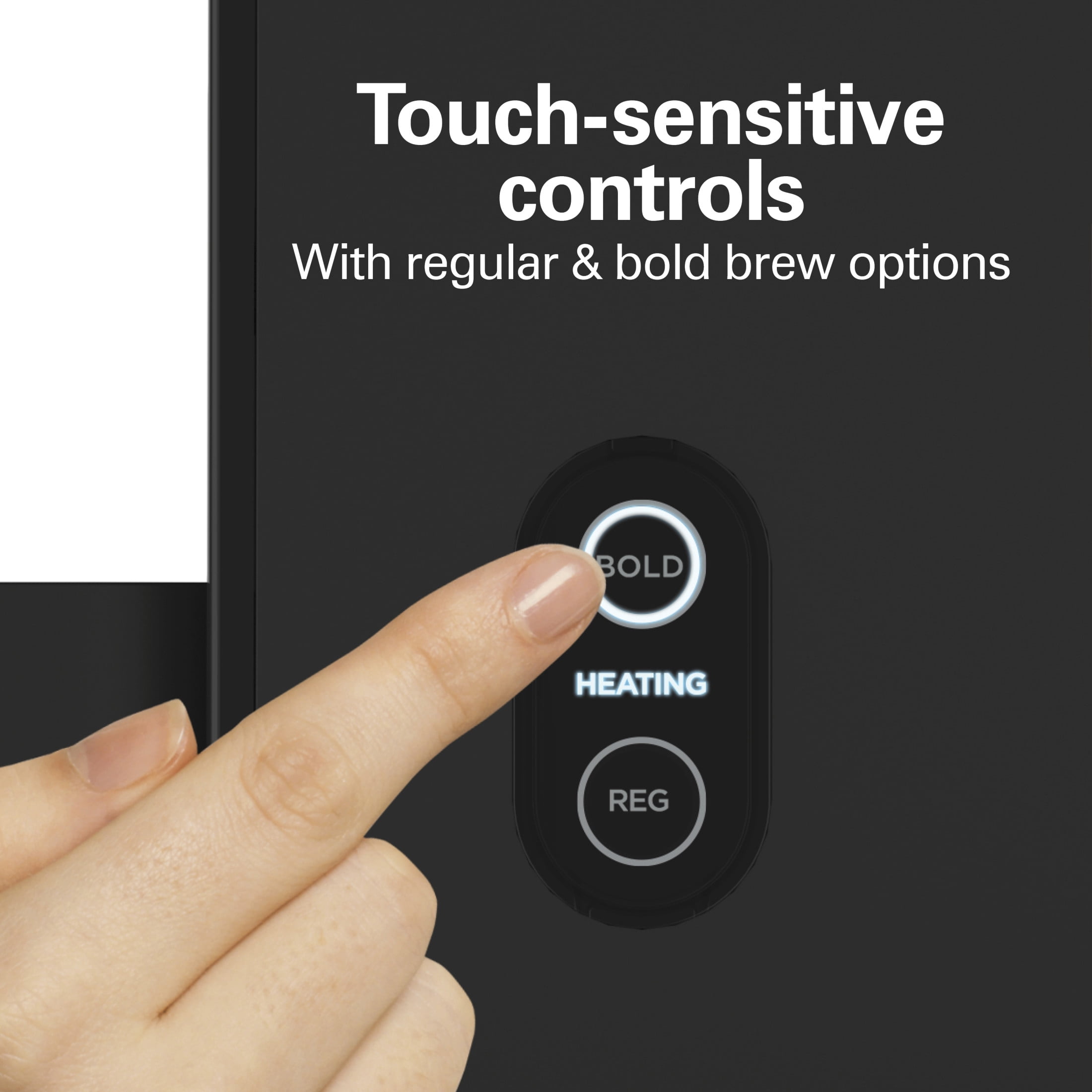 Brew a cup of hot, delicious coffee with the FlexBrew® Dual Coffee Maker and enjoy the flexibility of brewing 2 ways. Simply add your favorite brand of pod (such as a K-Cup* pod) or coffee grounds, add water, lower the lid and press a button — your coffee will be ready in about 2 minutes. Using a pod lets you brew up to 10 oz. of coffee, and using coffee grounds lets you brew up to 14 oz. of coffee. The slim, space-saving design with stylish stainless steel trim looks great in every kitchen and it saves space on your counter since it measures less than 5″ wide. Touch-sensitive, capacitive controls provide easy operation and let you choose from regular and bold brewing options. The 14 oz. water reservoir is easy to fill, and the removable cup rest lets you brew into a standard-size cup or 7″ tall travel mug. The convenient storage area inside the cup rest holds either the pod holder or single-serve brew basket.