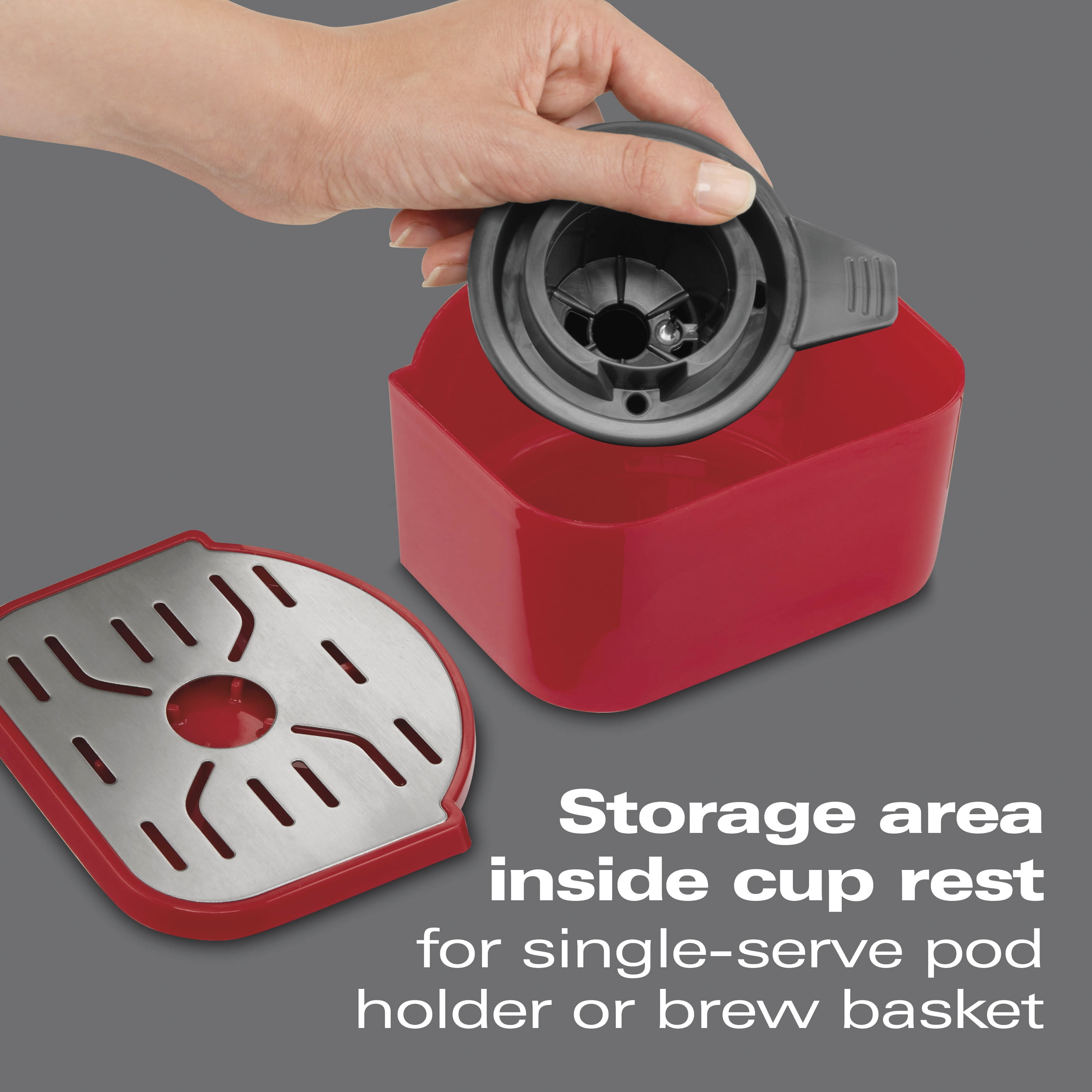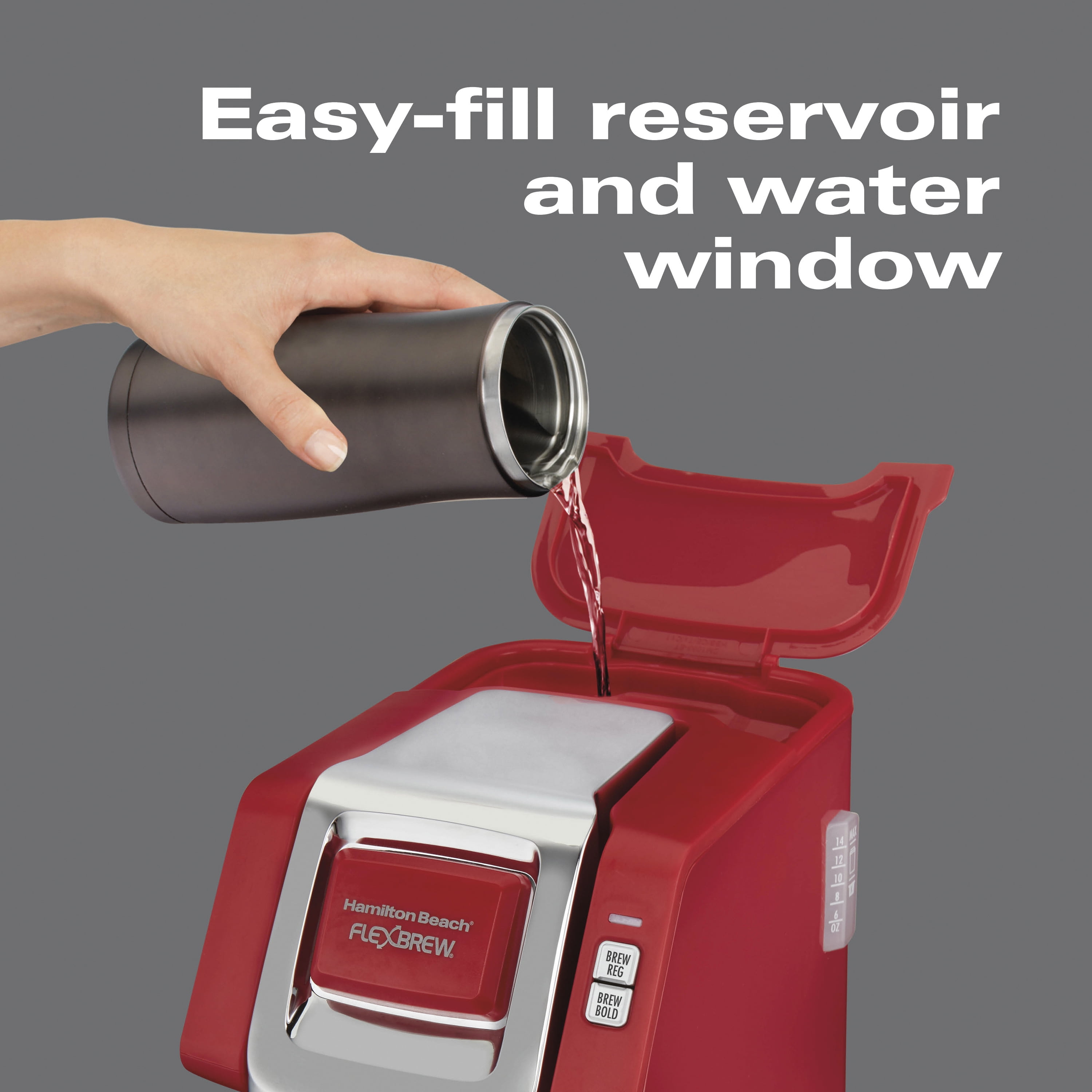 Hamilton Beach FlexBrew Single Serve Coffee Brewer, Red Brews both single-serve pods and ground coffee Simple and easy-to-use design for effortless brewing Compatible with regular cups or tall travel mugs Brew up to 10 oz. with a single-serve pod or 14 oz. with ground coffee Offers bold and regular brewing options for customized taste Easy-fill water reservoir with an easy-view water window Convenient storage area inside the cup rest for pod holder or brew basket Classic red color with chromed handle and stainless backsplash to complement kitchen decor