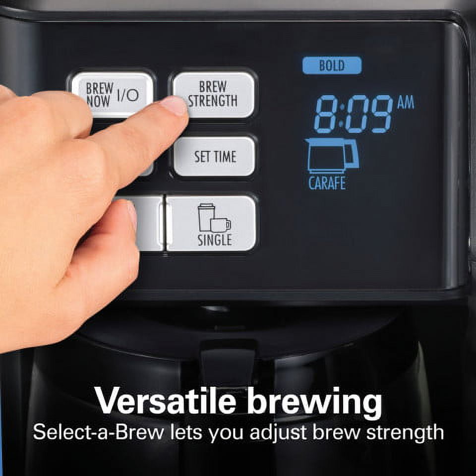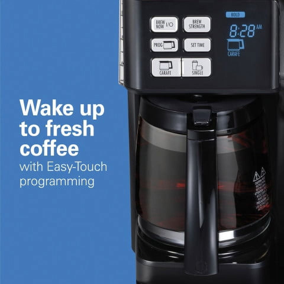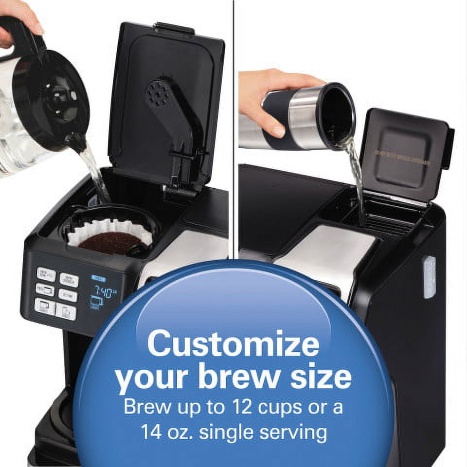The flexible design of the New Hamilton Beach FlexBrew Trio Coffee Maker lets you brew coffee three ways. On the single-serving side, you have two brewing options: making coffee with your favorite brand of pod (such as a K-Cup pod) or using ground coffee. Using a pod lets you brew up to 10 oz. of coffee, and brewing with coffee grounds lets you brew any size cup up to a 14 oz., 7-1/4″ tall travel mug. When you want 12 cups of coffee, simply fill the water reservoir and brew basket on the carafe side just like you would a traditional coffee maker. Programmable for hot coffee first thing in the morning and also includes pause and serve feature while coffee is still brewing. Coffee stays warm for 2 hours, then the power automatically shuts off. No matter which way you brew, Select-a-Brew lets you choose bold or regular brewing strengths. Included with the Hamilton Beach FlexBrew Trio Coffee Maker is a 12 cup glass carafe, single-serve pod holder, single-serve brew basket and a cup rest with a storage area for either. Compatible with Keurig K-Cup pods and other pod brands.