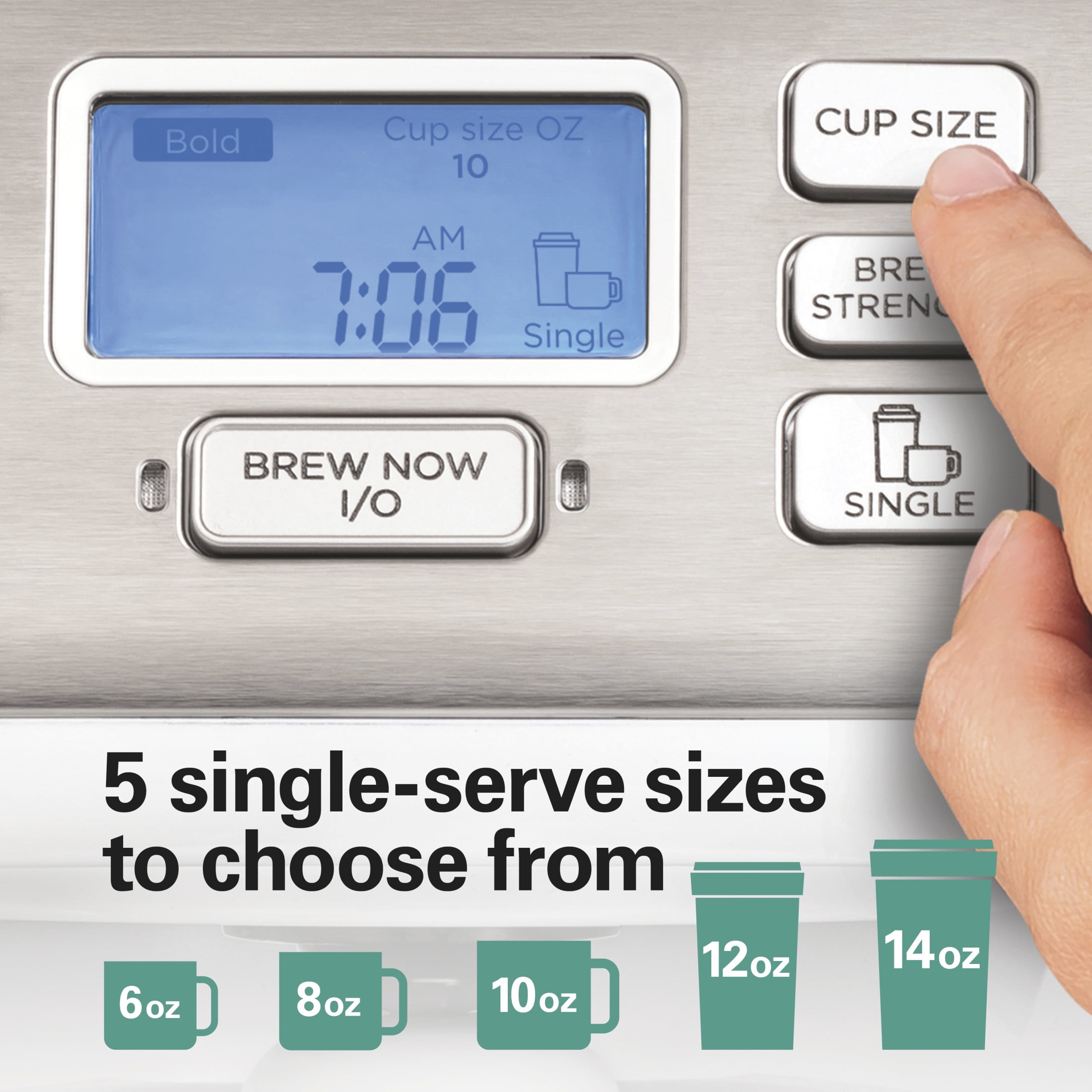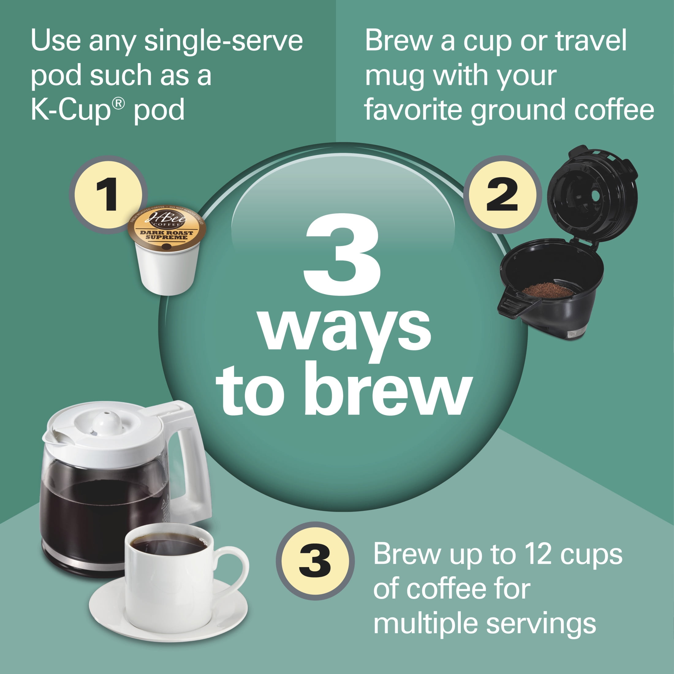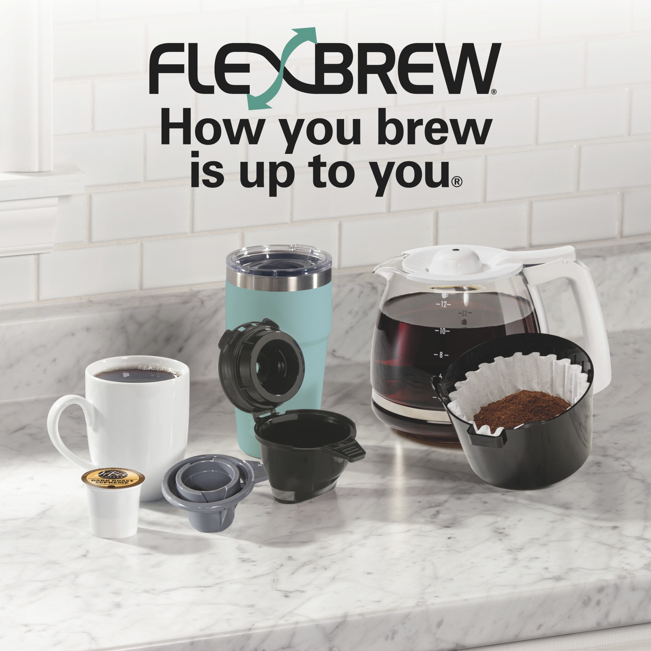 3 WAYS TO BREW. Brew a single cup with a K-Cup* pod or ground coffee or brew up to 12 cups using your favorite grounds. For one serving, you have the option to brew up to a 10 oz. cup with a pod or brew up to 14 oz. (7″ tall travel mug) with grounds. FAST BREWING — BREW A SINGLE CUP IN ABOUT 90 SECONDS. In the morning, every second counts. Unlike 2 way coffee makers of the past, the FlexBrew® Trio Coffee Maker prepares a single cup in in about 90 seconds, so you have more time to enjoy your coffee. BREW 7 SINGLE SERVINGS WITHOUT REFILLING THE 56 OZ. WATER RESERVOIR. You can brew multiple cups of coffee without stopping to pour water into this white coffee maker — the removable water reservoir saves you time because it needs fewer refills. 5 SINGLE-SERVE SIZES TO CHOOSE FROM: Customize the brewing size to your cup. Simply select 6, 8, 10, 12 or 14 oz. before you brew with ground coffee or choose 6, 8 or 10 oz. when brewing with a pod — you’ll get the perfect amount in your cup. WAKE-UP READY COFFEE WITH EASY-TOUCH PROGRAMMING. When you brew coffee into the 12 cup carafe, you can wake up to hot coffee by setting up Easy-Touch programming the night before. The backlit display makes it easy to view the time and settings. *K-Cup® is a registered trademark of Keurig Green Mountain, Inc. Use of the K-Cup® trademark does not imply any affiliation with or endorsement by Keurig Green Mountain, Inc.
