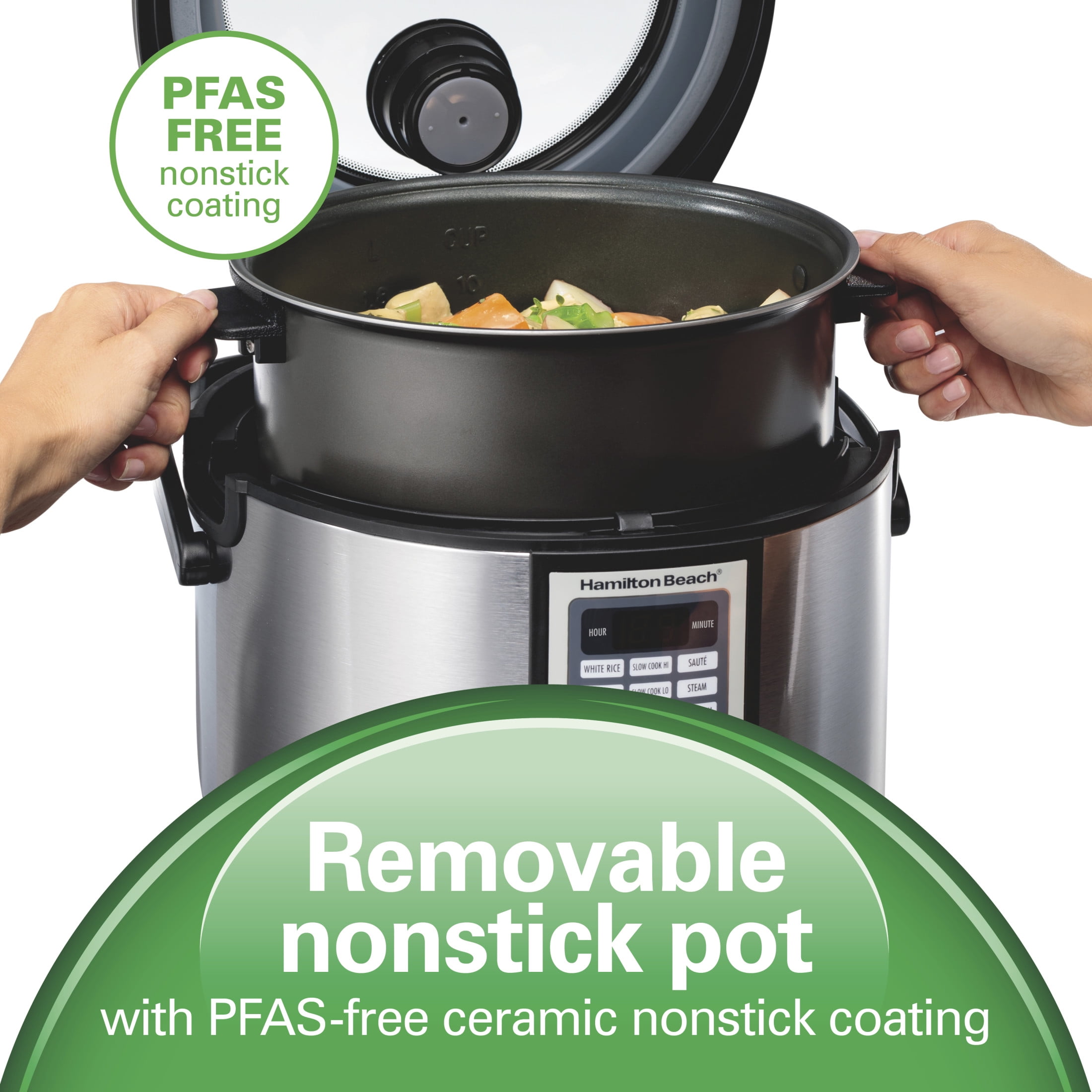 One cooker, endless possibilities. With a 4.5 quart capacity, the Hamilton Beach® Digital Multi Cooker combines the functions of a rice cooker, slow cooker, food steamer and more into a single compact appliance. Intuitive digital controls make switching between cooking methods effortless. Make Easy Rice and Hot Cereal. Individual cook options make it easy to prepare white rice and brown rice plus hot cereals like oatmeal, grits and more. Slow Cook on Low and High. Low and high slow cook settings with steady and gradual heat offer the same results as a traditional slow cooker. Steam Up Healthy Meals. Steam seafood, poultry or vegetables in the steam basket while rice or grains cook below, or steam them on their own. Sauté and Soup. Sauté vegetables before adding grains for a risotto dish or simmer a batch of soup in time for family dinner. Clear Glass Lid. Glass lid lets you see your food and monitor the entire cooking process. Digital Controls Push-button digital controls makes switching between functions effortless. Includes Keep Warm and Delay Start options and a countdown timer. Removable Nonstick Pot. The nonstick inner pot is removable and dishwasher safe for easy cleanup. Convenient handles help lift it from the base comfortably. Accessories Included. A steaming basket, rice paddle and measuring cup are included in the box. Hamilton Beach® products are thoughtfully designed to make your life easier. We use consumer insights, in-depth research and rigorous testing to deliver the best solution to your everyday needs. Whether it’s preparing delicious meals and beverages effortlessly, or making your clothes look their best, you can count on the brand that has spent over 100 years creating products with you in mind.