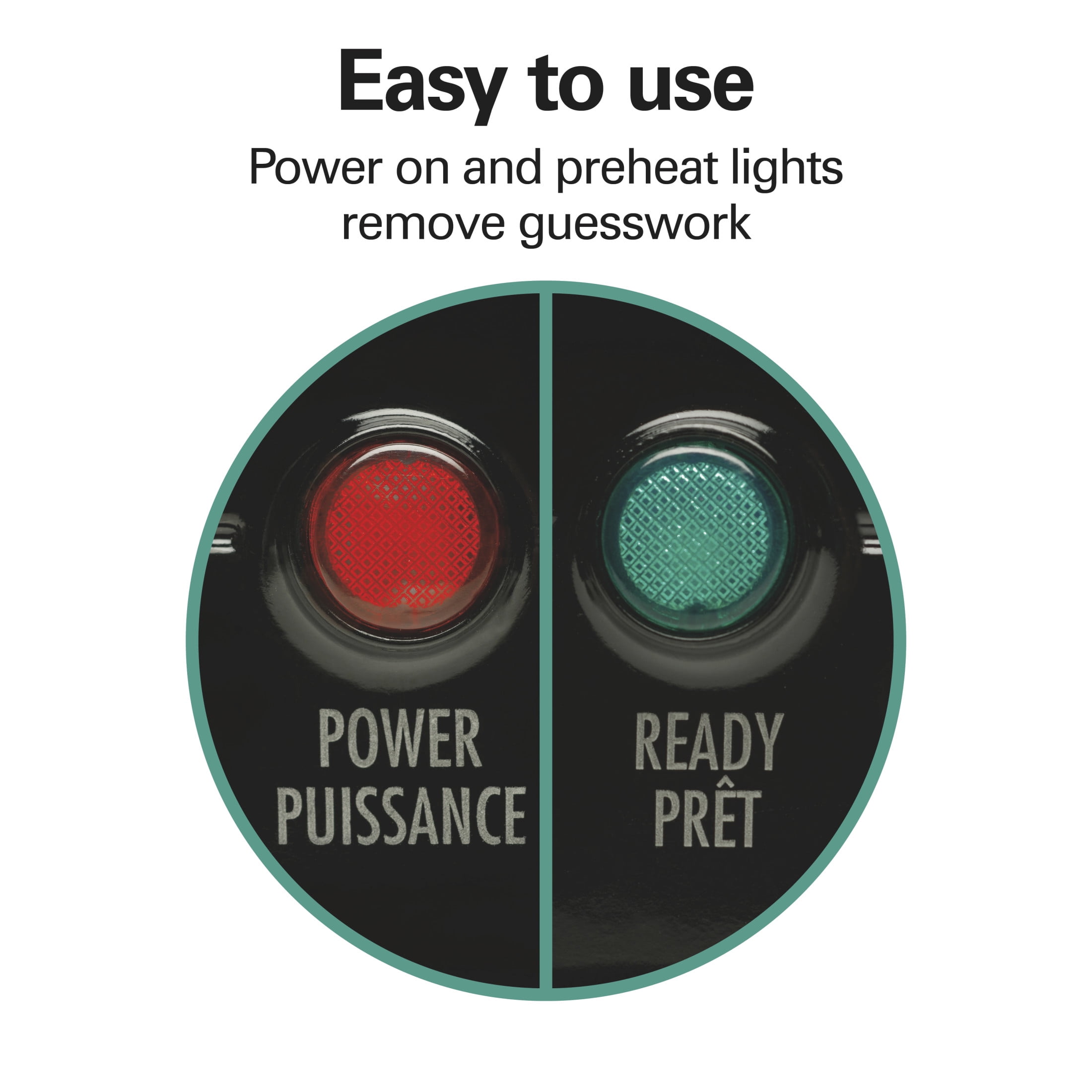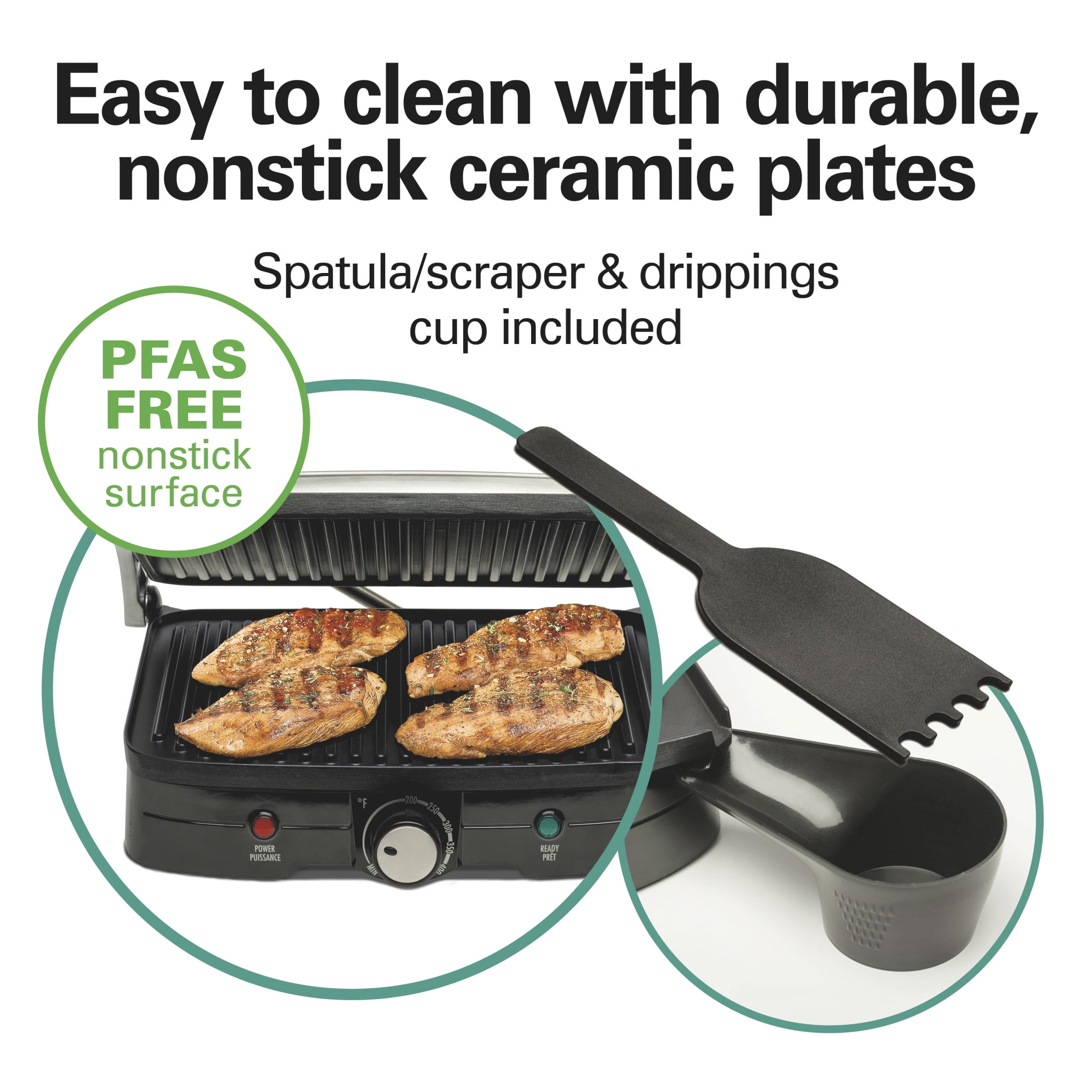 There’s nothing better than a 2-in-1 appliance especially when space and time are limited in the kitchen. With the Hamilton Beach Panini Press & Indoor Grill, you’ll easily make your favorite grilled foods complete with grill marks indoors on your kitchen countertop. Grill burgers, chicken, vegetables and more foods to perfection or make hot pressed sandwiches from grilled cheese and classic Reuben sandwiches to paninis and Mexican tortas. The 99 square inch cooking surface accommodates either 2 thick sandwiches or 1 long sandwich. The floating lid evenly presses food, so you can pile sandwiches high and they’ll still cook evenly on both sides. The grill has 198 square inches of cooking space when opened flat to cook a variety of foods at once and get meals on the table faster. Grill most foods in 10 minutes or less. The durable, ceramic nonstick ceramic plates are simple to clean with the included spatula/scraper and a damp cloth. The included drippings cup catches grease for easy recycling or disposal. The sandwich maker is simple to use with a power on light and a preheat light to let you know when it’s time to start cooking.