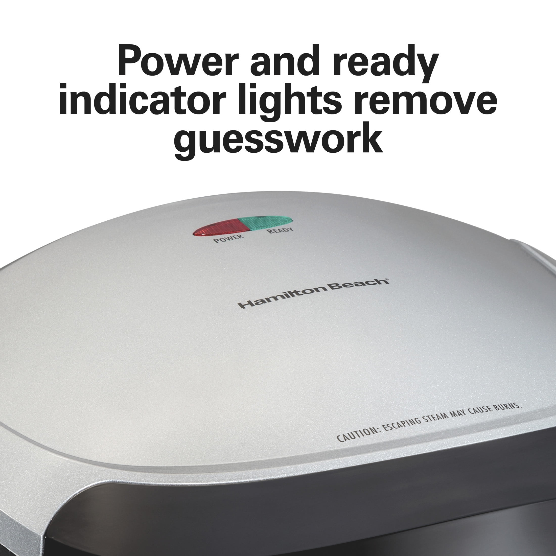 Enjoy delicious grilled foods year-round with the Hamilton Beach Nonstick Indoor Grill, Silver, 25371. The large 90 square inch nonstick cooking surface can accommodate up to six servings, an ideal size for family meals and parties. Equipped with powerful heating elements, this indoor grill cooks most foods in 10 minutes or less, making it perfect for quick weeknight dinners. Use it to grill burgers, boneless chicken, lean meats, fish and vegetables. Designed so grease drips away from the food as it cooks, the Hamilton Beach Indoor Grill makes low-fat cooking easy. Plus, the convenient slide out drip tray is dishwasher safe. The large handle offers a secure grip while cooking, and the floating hinges adjust to the thickness of food. When finished, the nonstick grill plates easily wipe clean.