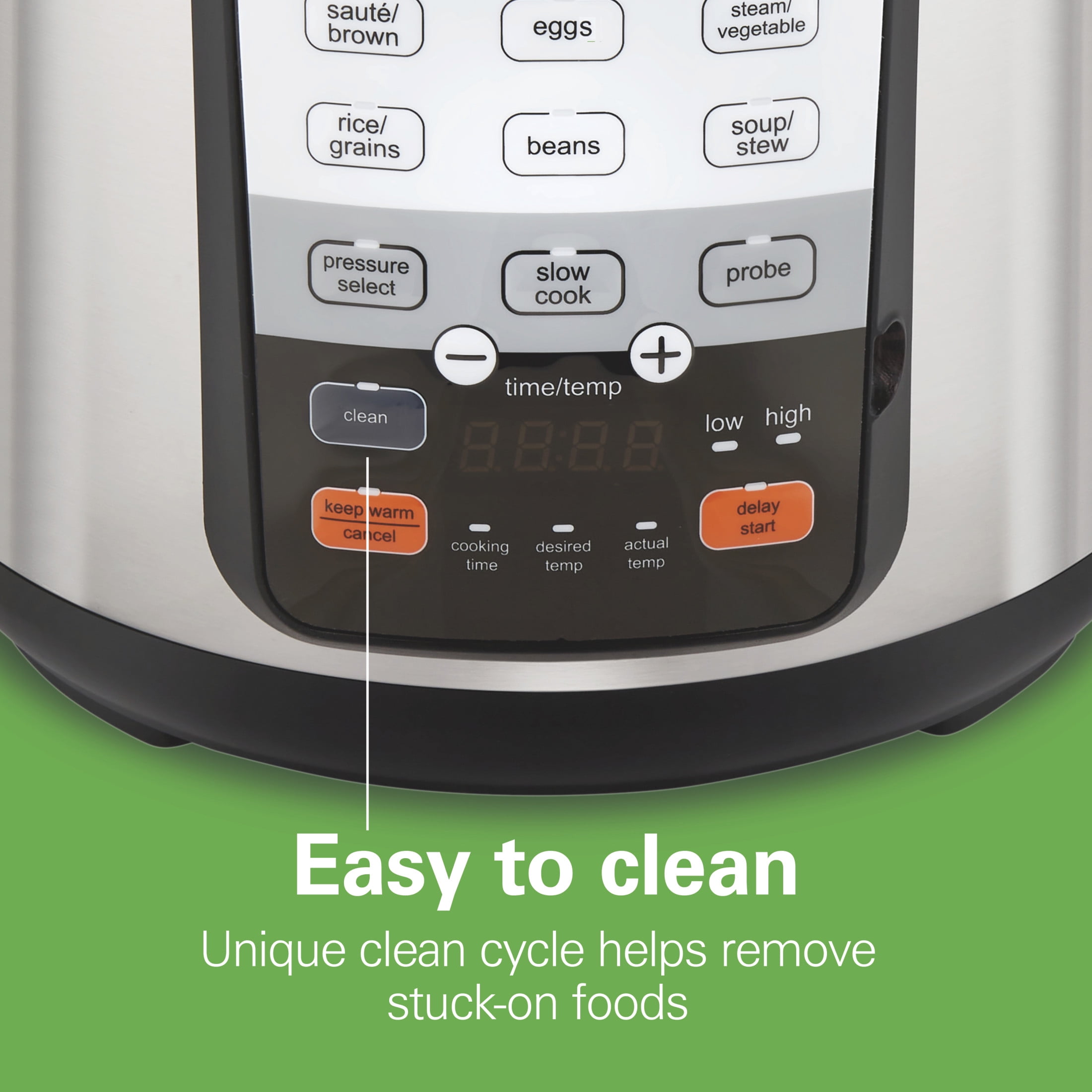 Enjoy the speed and convenience of pressure cooking without the worry or fuss. With the Hamilton Beach® Precision Pressure Cooker’s unique temperature probe, you have total control over how all your meats and dishes turn out. Just place the probe into large cuts of meat to cook to a desired temperature. The control panel will display the exact temperature of food as it cooks and shift to warm when food is ready. For traditional pressure cooking, you have the option of high and low pressure modes. In addition to pressure cooking, this multi-functional appliance is also a slow cooker, rice cooker, steamer and egg cooker. And it doesn’t stop there. The Hamilton Beach Precision Pressure Cooker is also great at cooking soups, stews, grains and beans. There’s even a brown/sauté button that lets you add flavor to meals by browning and sautéing in the 6 quart nonstick pot. Don’t let another meal go by without this versatile appliance in your kitchen. To make cleaning easy, it has a unique clean cycle that helps remove stuck-on food from the pot, lid and gasket. Includes temperature probe, lift-out roasting/steaming rack, rice paddle and measuring cup.