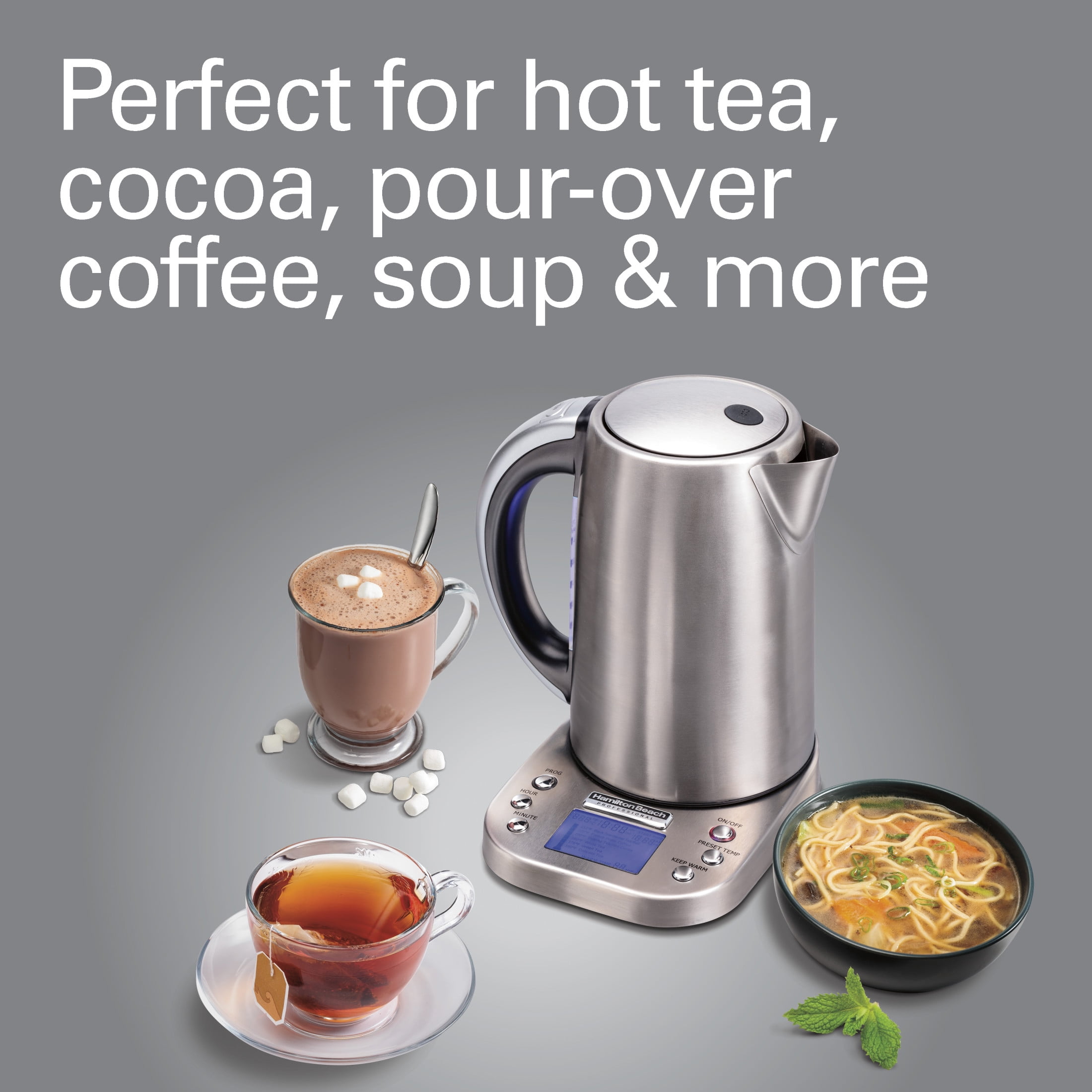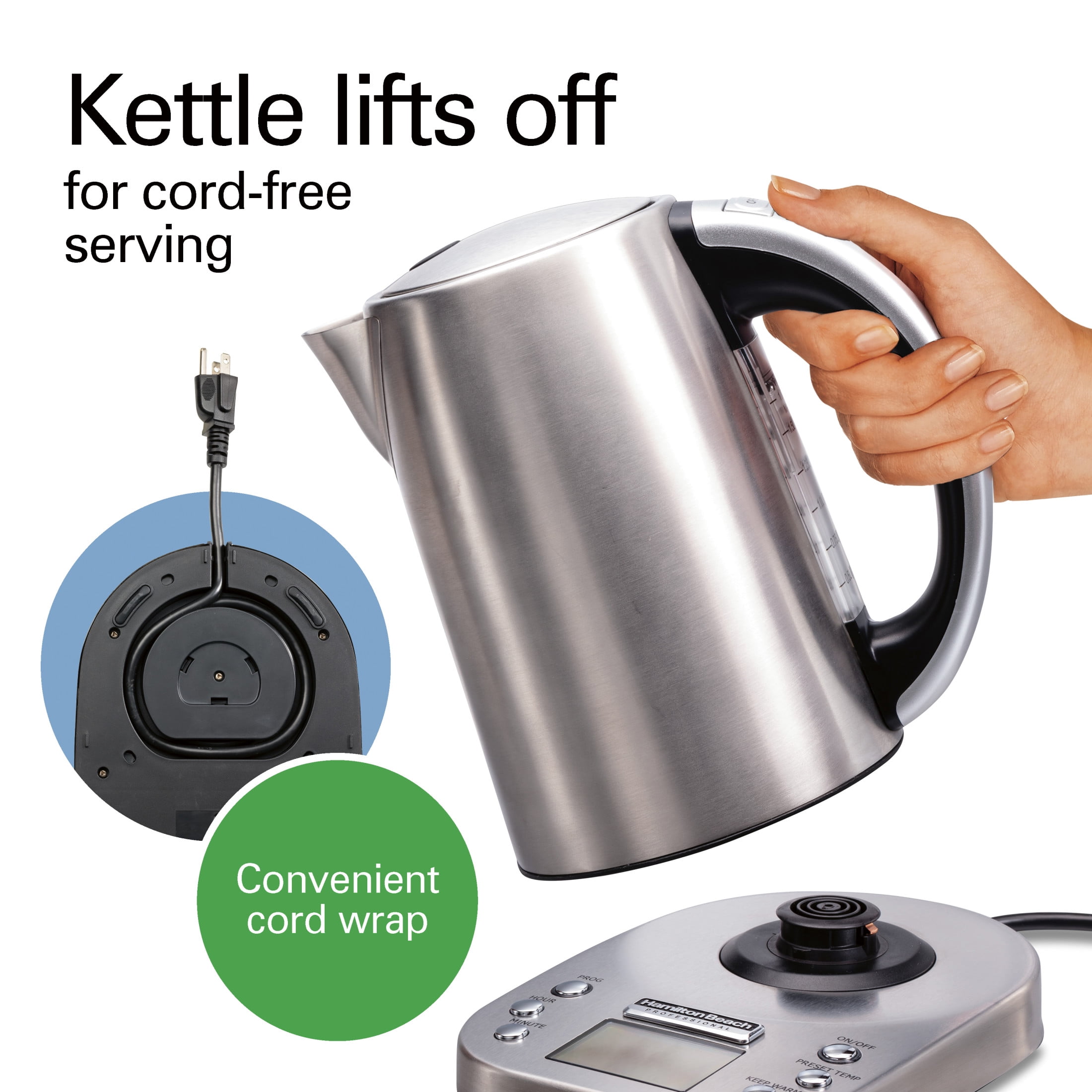 Hamilton Beach Professional Kettle boils water ultra-fast for tea, pour-over coffee, hot chocolate, soups and more. 6 pre-programmed settings, an LCD readout and programmable start time offer maximum control. Variable temperature options six pre-programmed settings bring water to the perfect temperatures, from 160–212ºF, for your favorite hot beverages. When your water is ready, the kettle will automatically shut off. Sleek design stainless steel construction will make this 1.7 liter kettle a countertop mainstay. Interior LED lights in the illuminated water window glow a soft blue, letting you know that hot water is on the way. Easy-to-use controls offer maximum temperature control and programmable start time. An informative, illuminated LCD panel lets you know the current temperature of your water at-a-glance. Easy to clean built-in mesh filter descales water and removes for easy cleaning. Cord-free serving the kettle can be removed from its base and carried anywhere hot water is needed. Convenient cord storage below the base keeps the power cord neatly tucked away.
