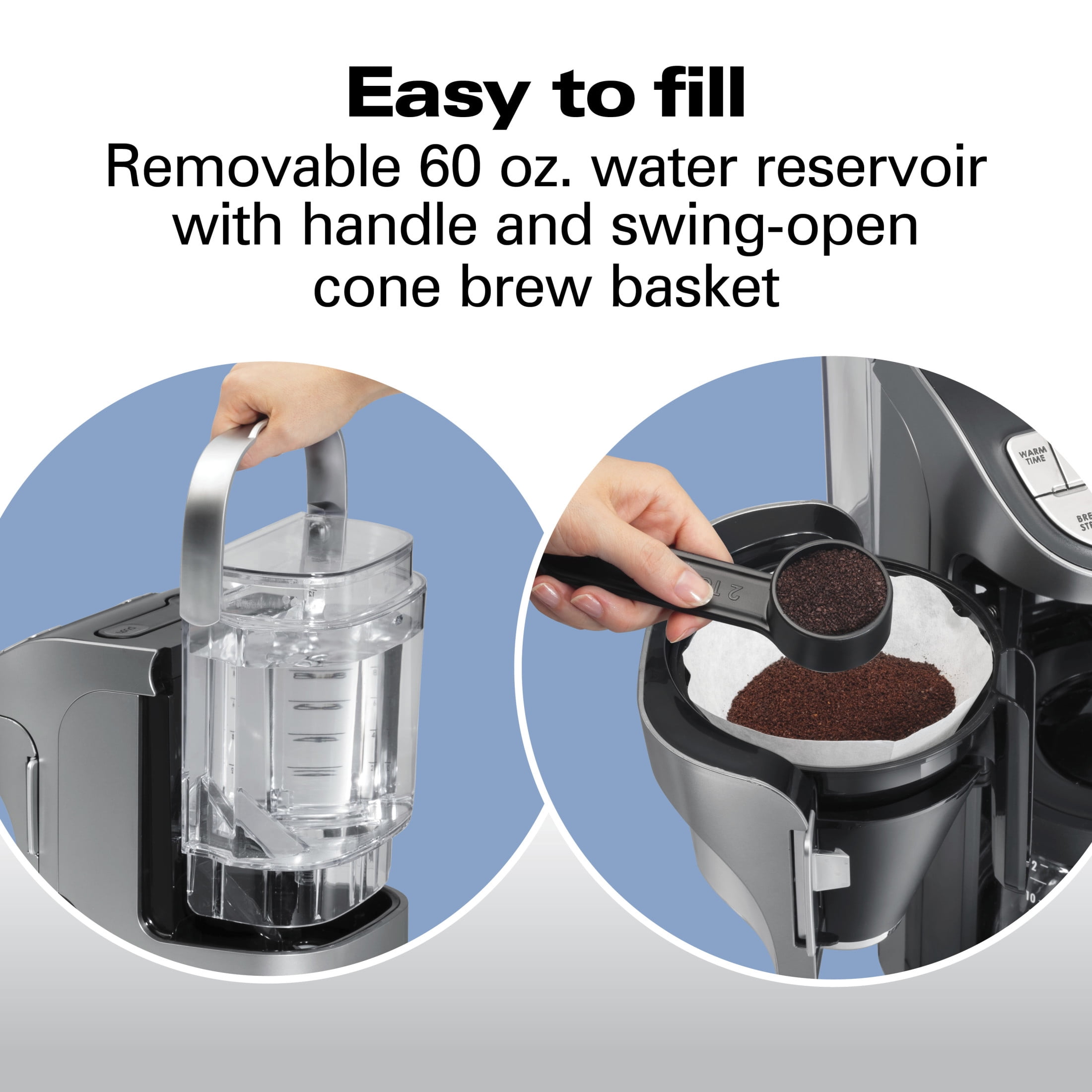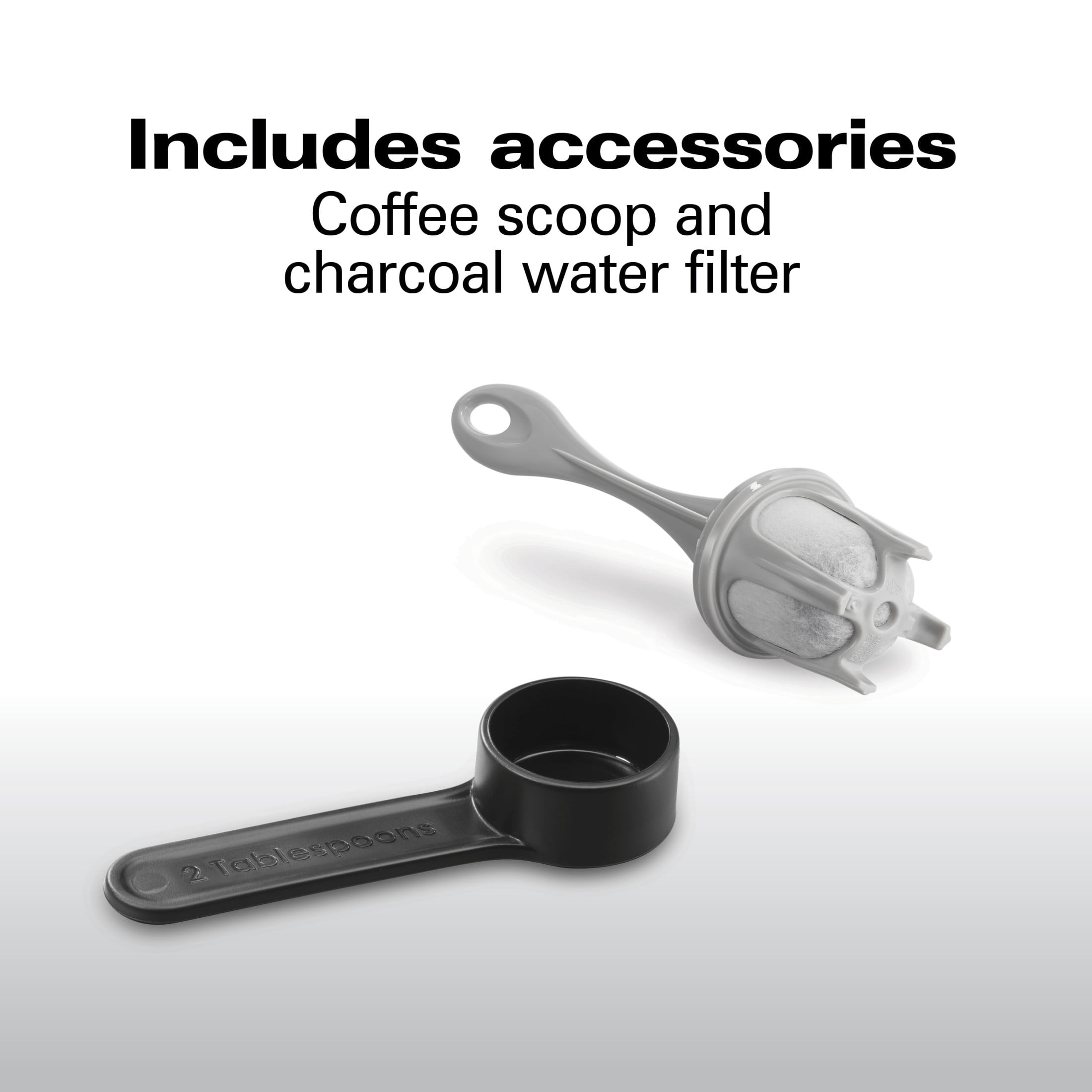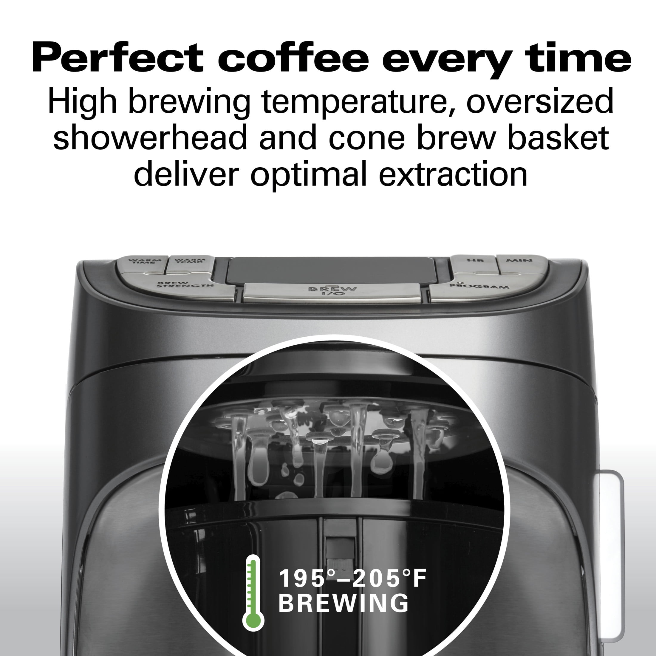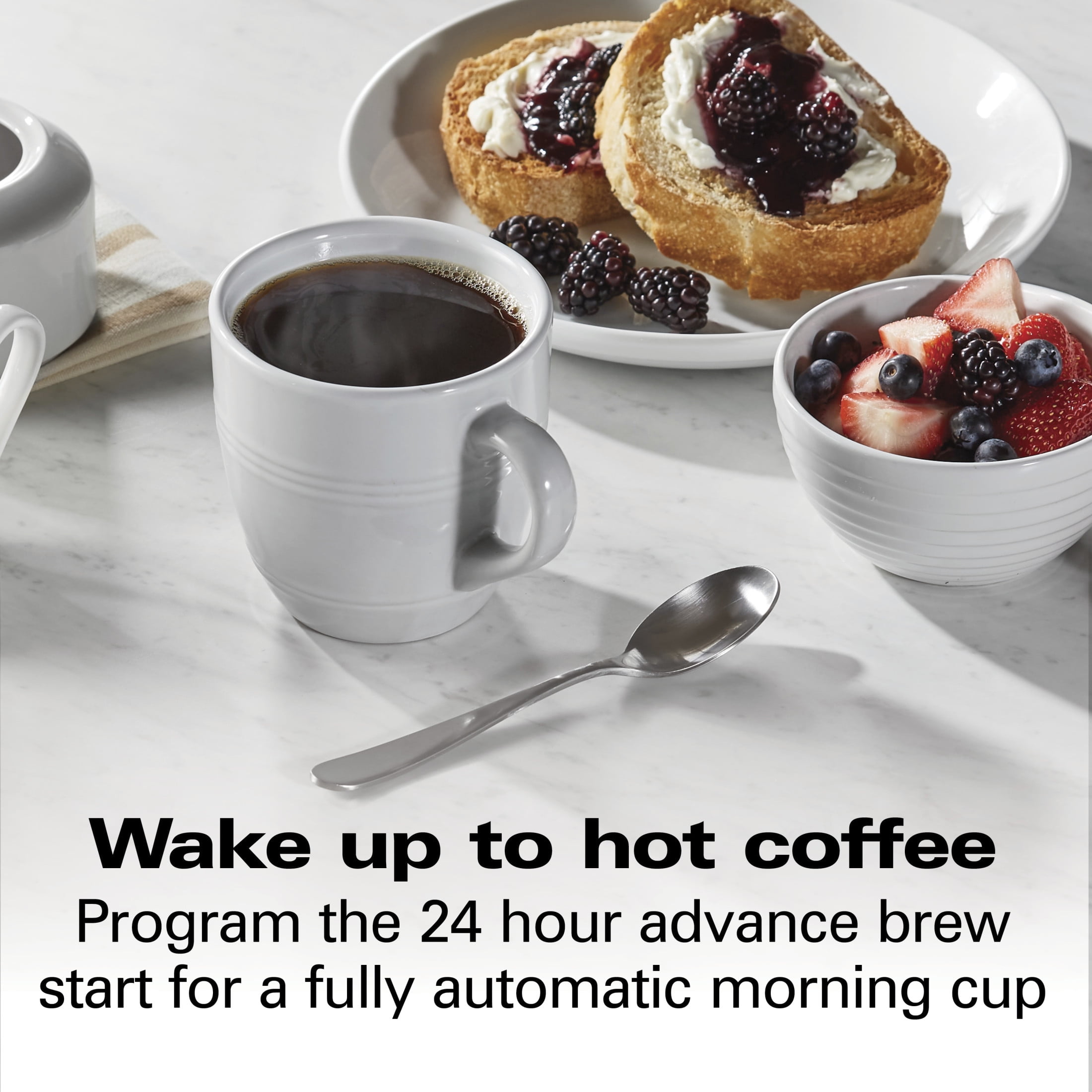 PERFECT COFFEE EVERY TIME: Enjoy rich, balanced coffee flavor in every cup. The high brewing temperature, oversized showerhead and cone brew basket are designed to evenly saturate coffee and provide optimal extraction. EASY TO FILL: The removable 60 oz. water reservoir with handle and swing‐open cone brew basket make this 12 cup coffee maker easy to fill. The charcoal water filter reduces chlorine for the best-tasting coffee. WAKE UP TO HOT COFFEE: This programmable coffee maker lets you start every day with fresh, hot coffee. Program the 24 hour advance brew start for a fully automatic morning cup. DRIP-FREE CARAFE: This Hamilton Beach coffee maker has a drip-free carafe with an ergonomic handle for comfortable, mess-free pouring. COFFEE THE WAY YOU LIKE IT. Customize your coffee with 4 brew strength options and the adjustable keep warm temperature. The “time since brew” freshness indicator and cleaning cycle reminder help you consistently achieve fresh-tasting coffee.