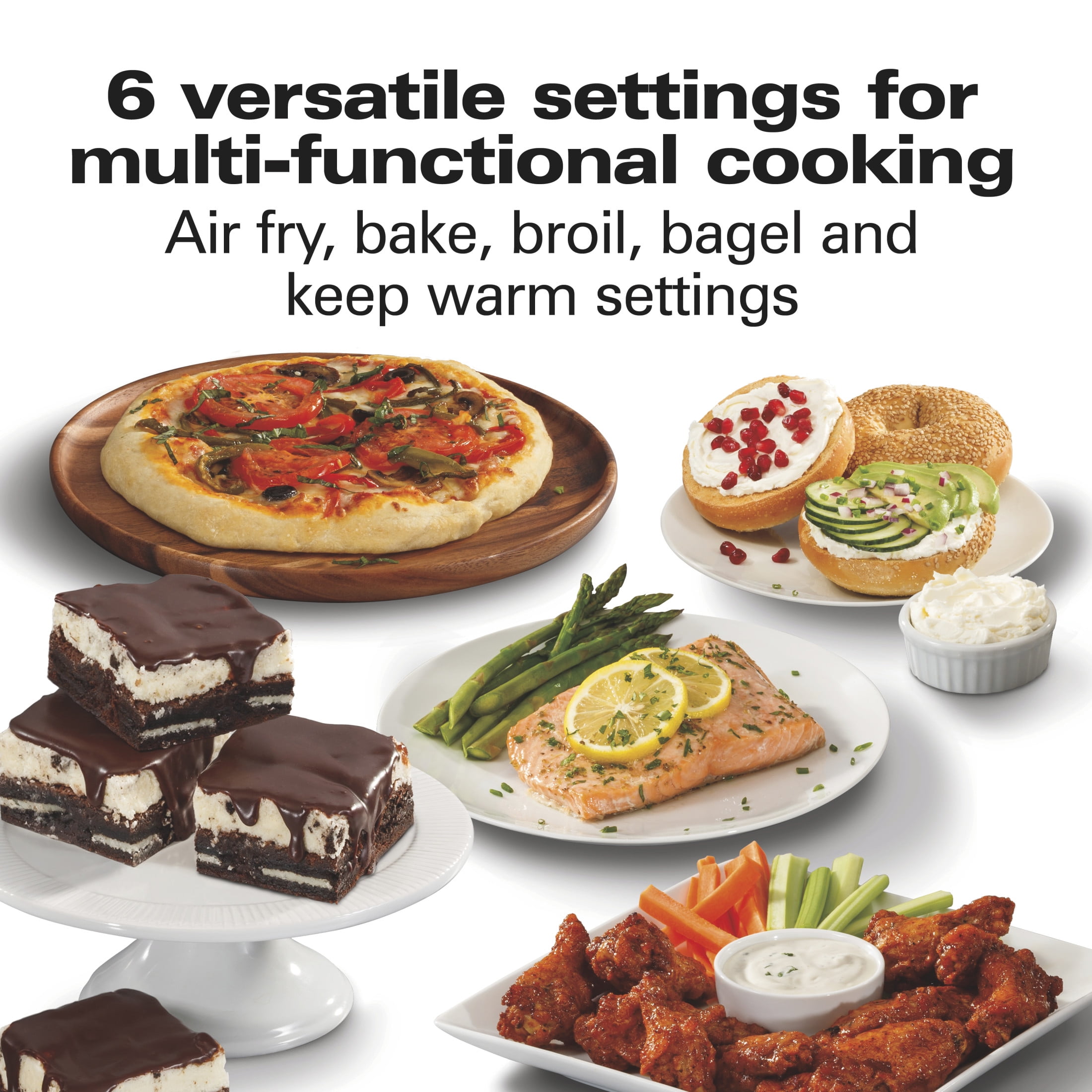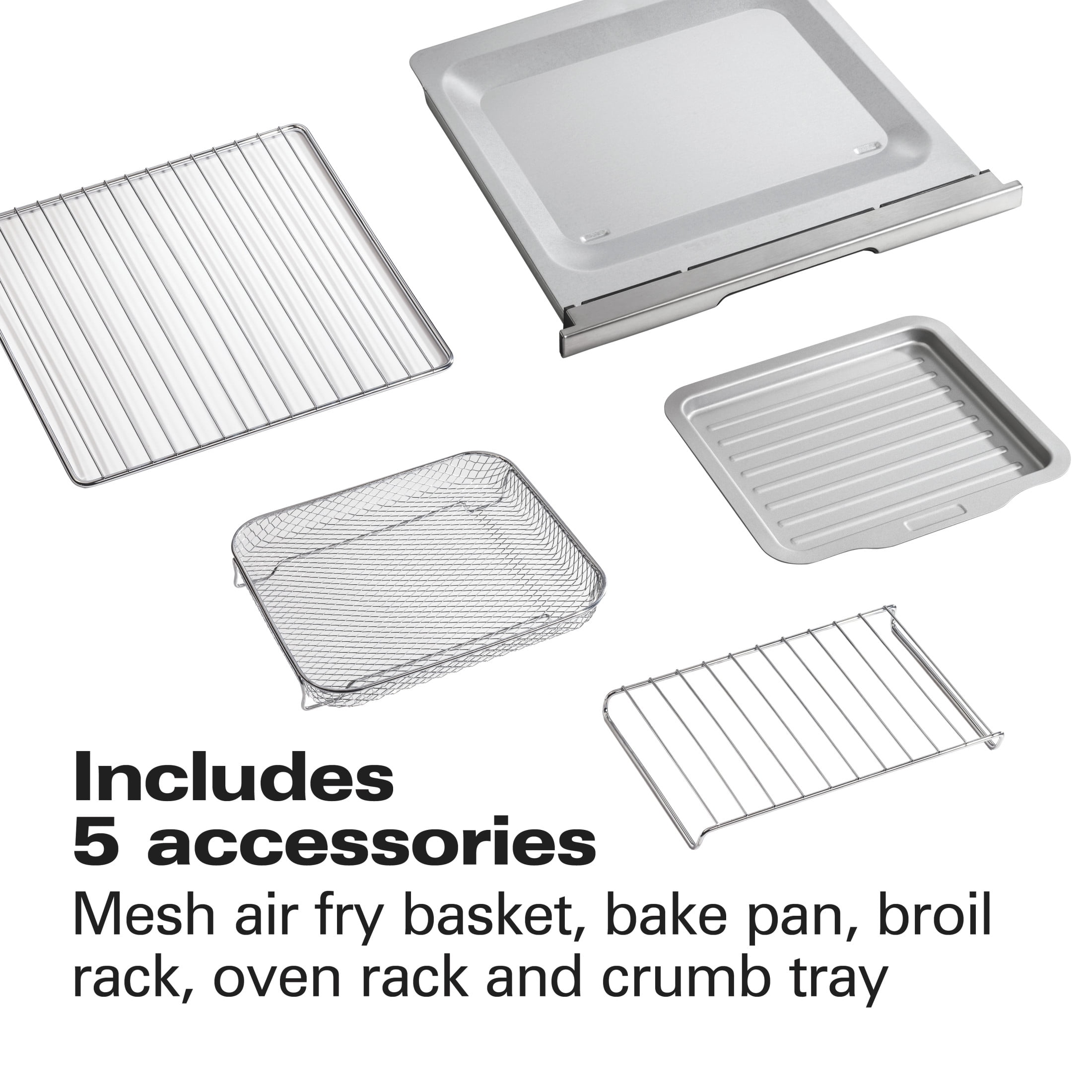 SURE-CRISP® AIR FRY FUNCTION POWERFULLY CIRCULATES AIR AROUND FOOD FOR CRISPY RESULTS. The Sure-Crisp® air fry function* provides crisp, even browning with little to no oil, making it ideal for air frying chicken, French fries, steak, fish and more. 6 VERSATILE SETTINGS FOR MULTI-FUNCTIONAL COOKING. Go from air frying chicken wings on Monday to baking brownies on Sunday. The air fry, bake, broil, toast, bagel and keep warm settings of this air fryer toaster oven provide maximum cooking versatility. COMPACT SIZE SAVES COUNTER SPACE: While this toaster oven air fryer takes up minimal space, it provides the functionality of a full-size oven. The nonstick interior fits 4 slices of bread, a 10” pizza or 9” x 9” bake pan and has 2 rack positions. TOASTER OVEN AIR FRYER COMBO WITH EXCELLENT COOKING PERFORMANCE. Quality quartz heating elements, 1500 watts and powerful convection fan provide precise, accurate temperatures from 200 to 450° F and result in even cooking without hot spots. PREMIUM DIGITAL CONTROLS FOR PRECISE COOKING. The intuitive control panel with LCD screen displays which setting you selected, how many minutes are left on the timer and the oven’s temperature. When the cooking time is up, the oven shuts off.