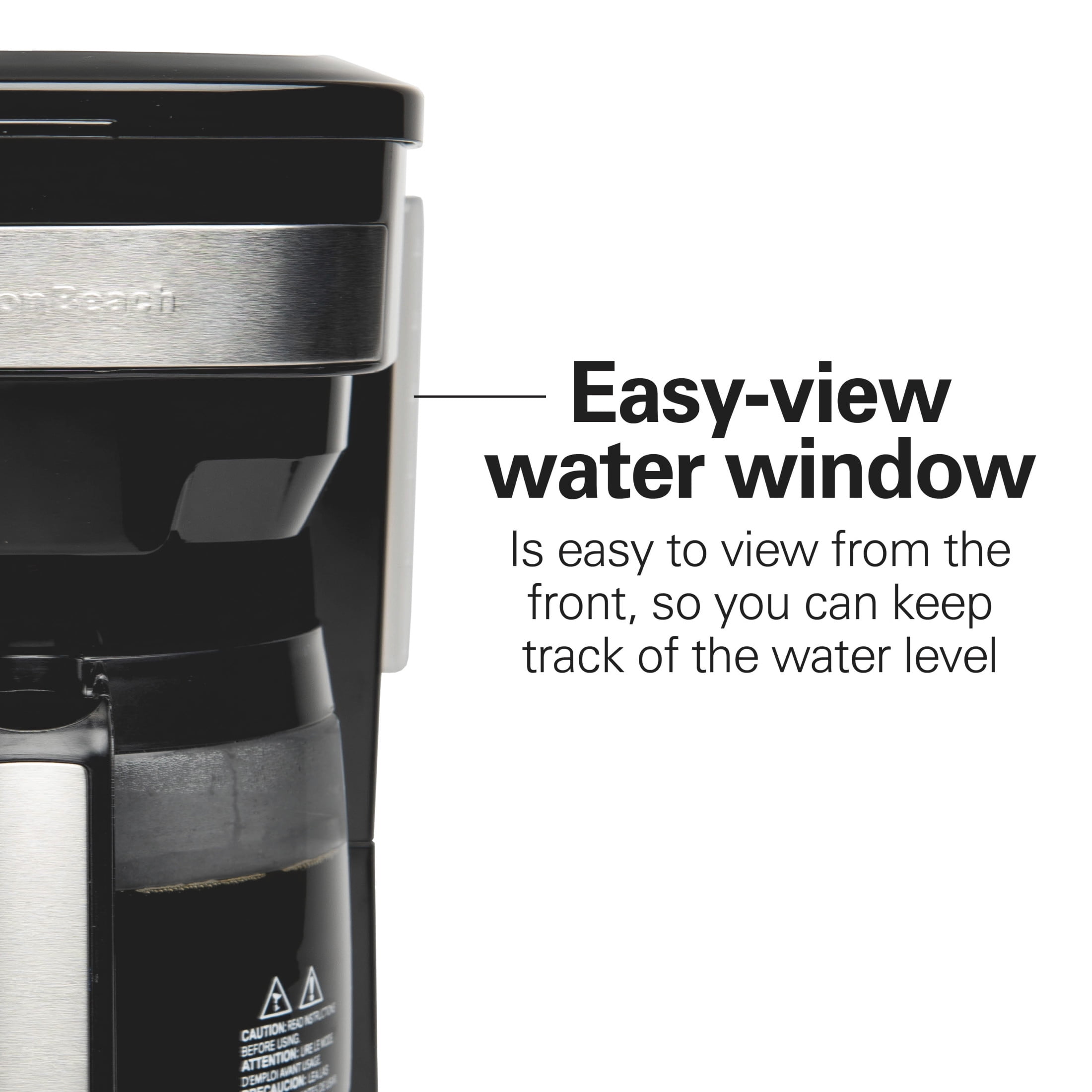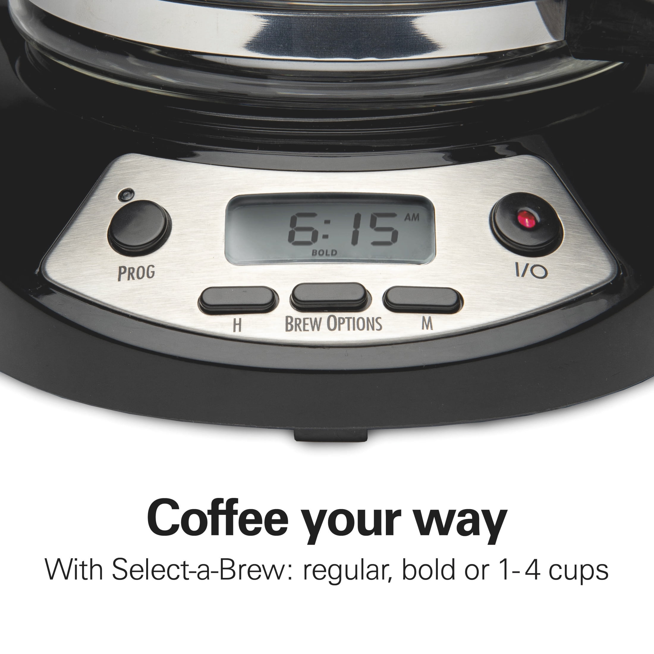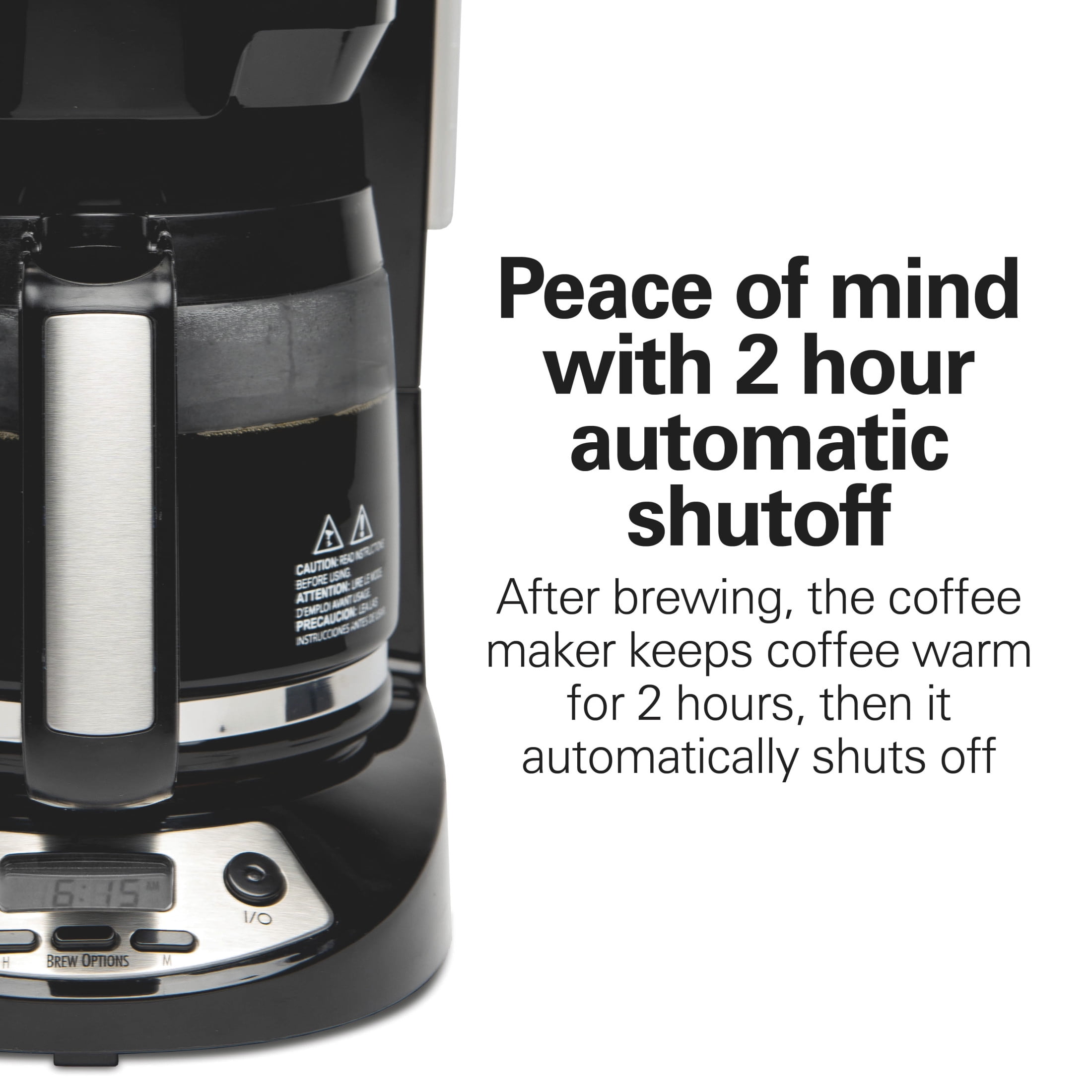 The Hamilton Beach® Programmable Coffee Maker comes in classic black and has stylish stainless steel accents, so it looks great in every kitchen. The Easy-Touch programming lets you program the coffee maker the night before and wake up to piping hot coffee every morning. The Auto Pause & Pour feature briefly delays the flow of coffee so you can sneak a cup before brewing stops without making a mess. Each brew is flavorful and can be customized to suit your taste. Choose from three Select-a-Brew options: regular, bold and 1-4 cups for brewing smaller servings. After brewing, coffee stays warm in the carafe for 2 hours, then the power automatically shuts off for your peace of mind. The Hamilton Beach Programmable Coffee Maker is easy to fill and features an easy-view water window that makes it easy to view the precise water level from the front of the machine. For easy cleanup after brewing, the 14 cup glass carafe and removable brew basket are dishwasher safe.