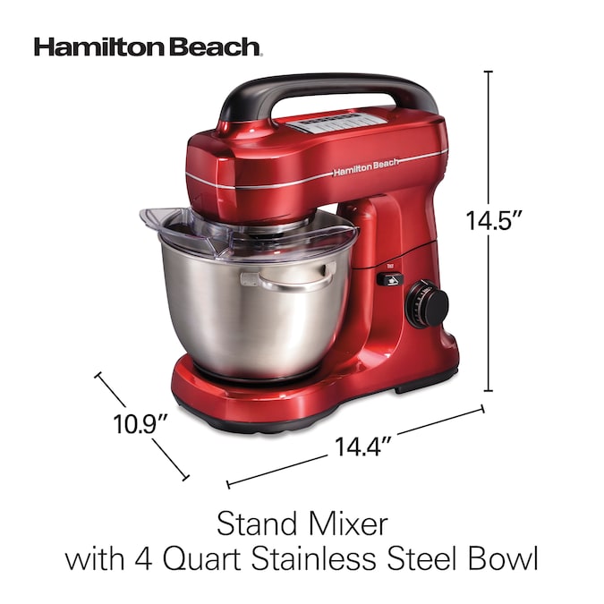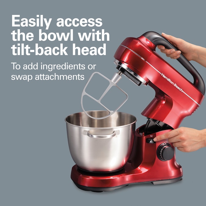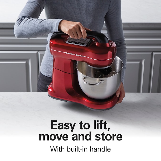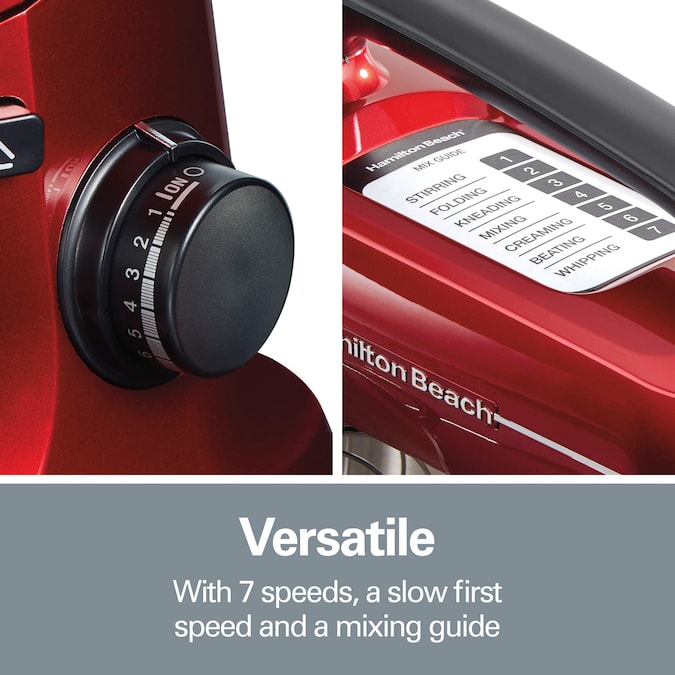 Making homemade baked goods just got easier. The Hamilton Beach® Stand Mixer effortlessly mixes ingredients for every baking recipe from thick batters for cake and cupcakes to dense bread doughs and more. Go from slowly folding in ingredients to whipping at top speed. The stand mixer has 7 speeds and a mixing guide that helps you choose the right speed for the job. The slow first speed is great for kneading bread and reducing splatter when adding dry ingredients to wet ingredients. High speed perfectly whips cream or meringue. The stand mixer’s planetary mixing action rotates the beaters around the sides of the included 4 quart stainless steel bowl so you don’t have to scrape the sides. It has the same rotating mixing action as KitchenAid® stand mixers.* The mixer performs better than two-beater stand mixers and features the tilt-back head design for easy access to the bowl to add ingredients. The tilting action also makes it easy to quickly change attachments. The stand mixer comes with the 4 quart stainless steel bowl with handles, splash guard, dough hook, whisk and flat beater that are all dishwasher safe. The built-in mixer handle makes it easy to lift, move and store.