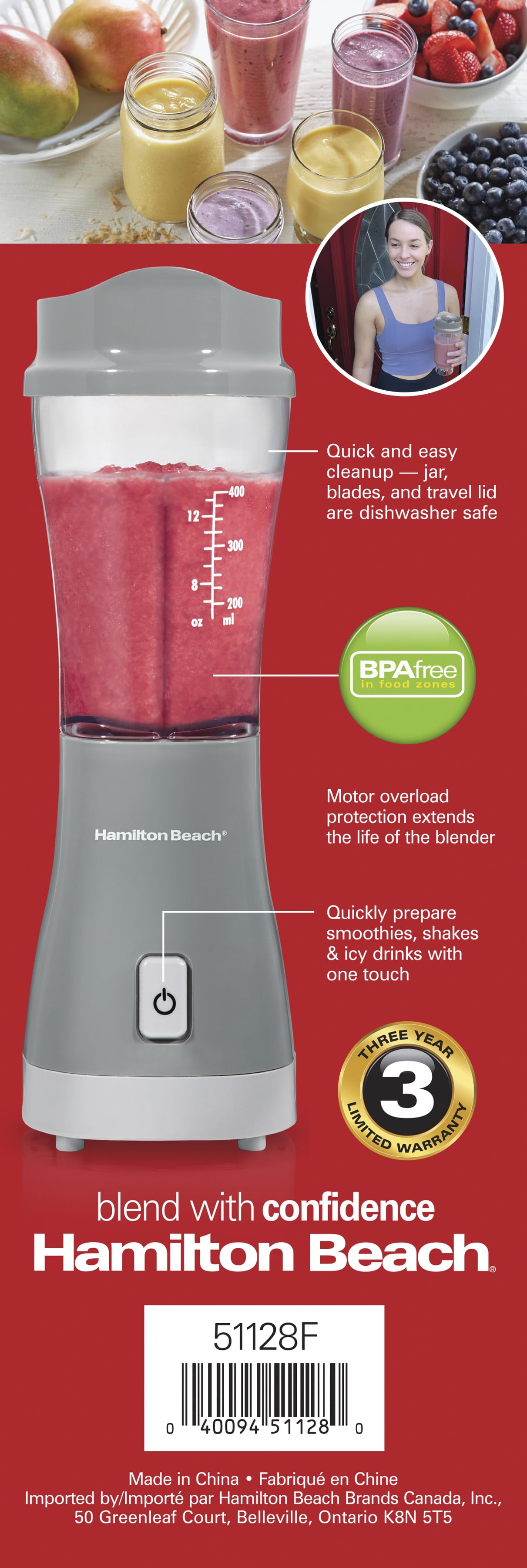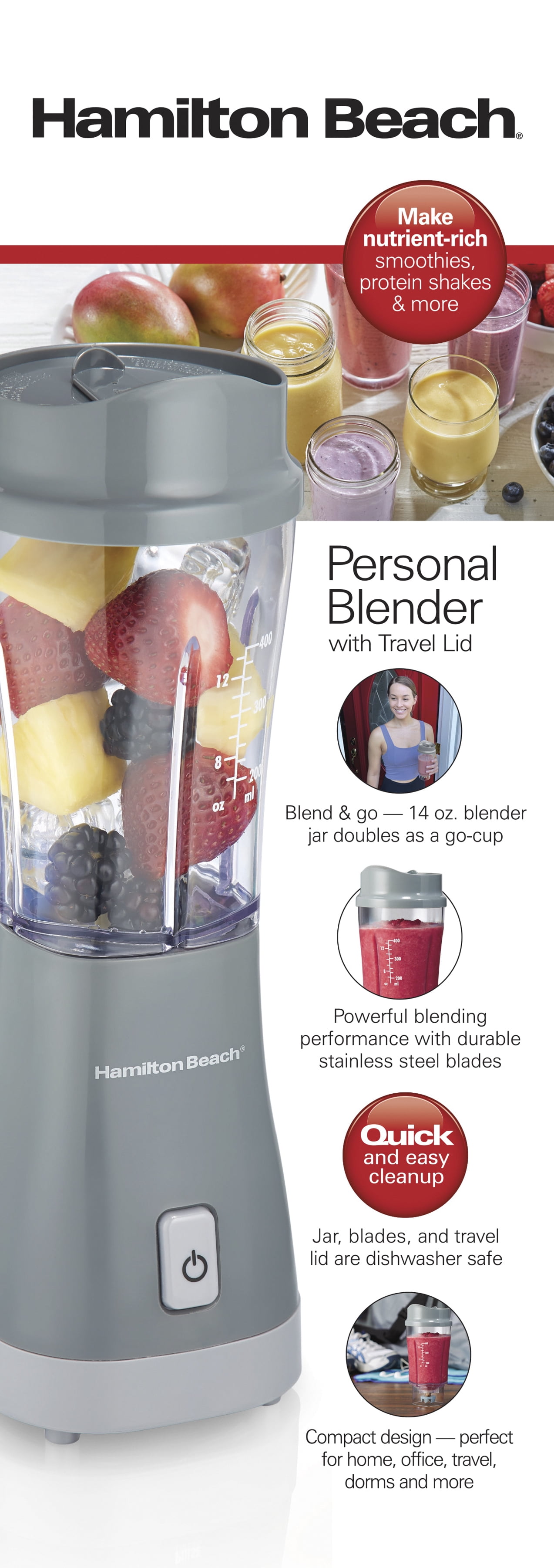 Hamilton Beach Single Serve Personal Smoothie Blender, 14 oz. Travel Cup and Lid, Gray, New, 51128F