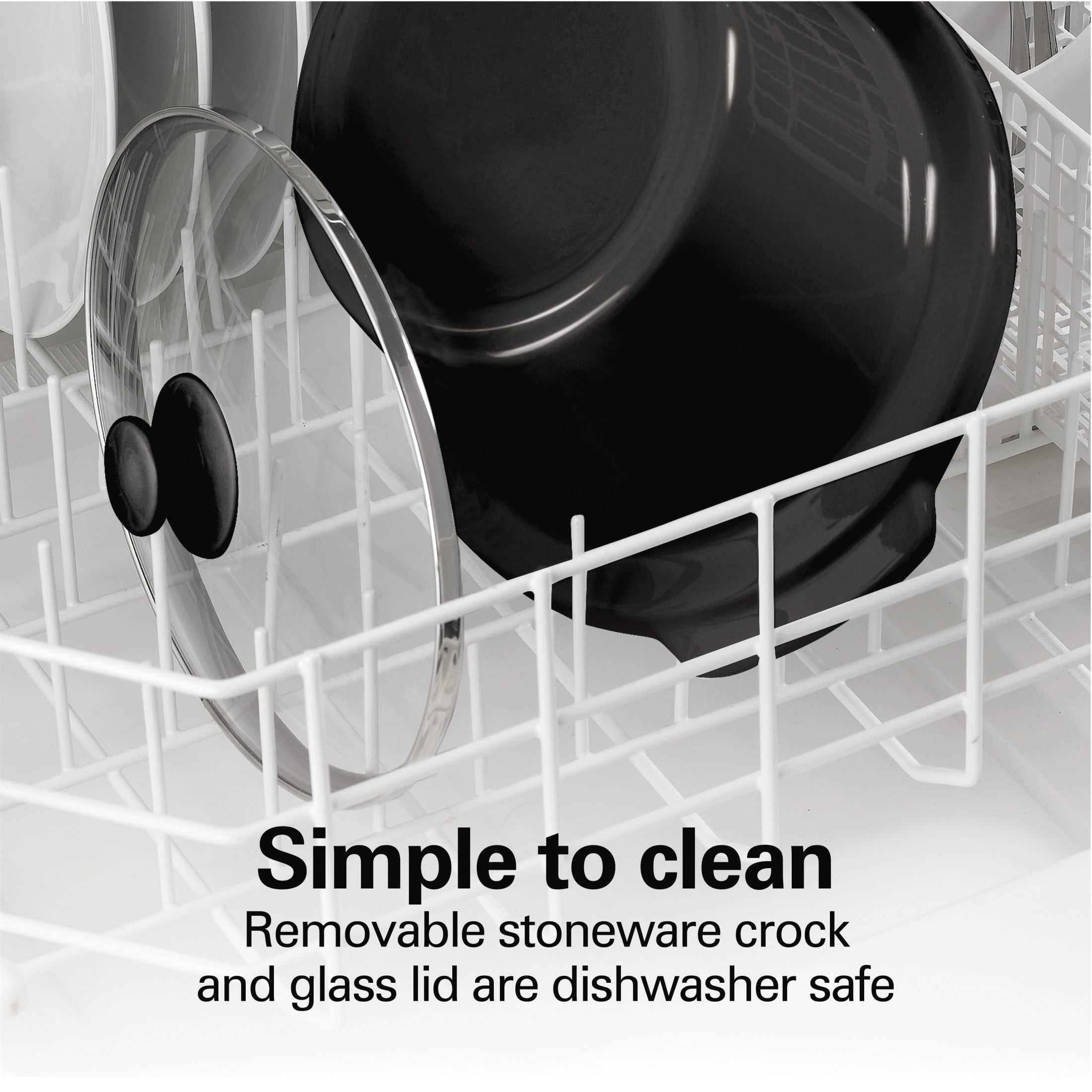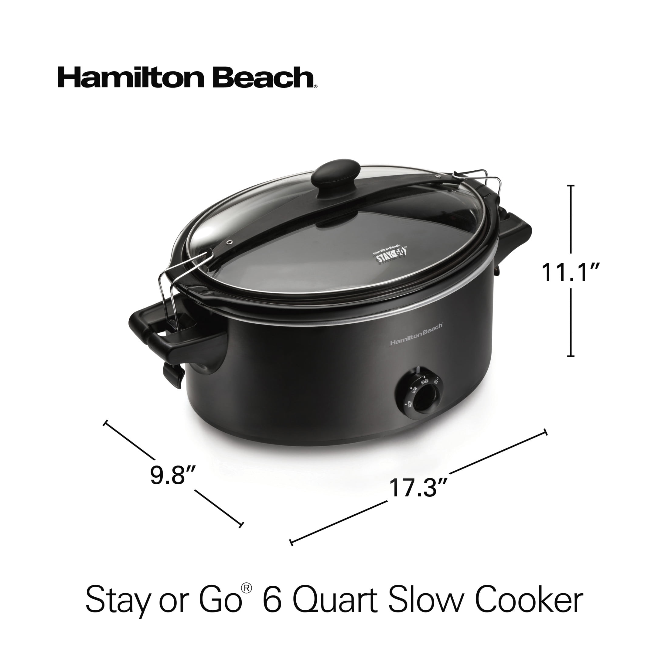 The Hamilton Beach® Stay or Go® 6 Quart Slow Cooker has a clip-tight sealed lid to reduce messy spills when transporting food. Carry hot meals to family gatherings, potlucks or serve at the table without worrying about spills. The slow cooker is the perfect size for family meals and serves 7+ people. The stoneware crock fits a variety of foods, from lasagna and desserts to large cuts of meat. It holds a 6 lb. chicken or 4 lb. roast. From bold chili and stews to savory, slow-cooked meats and rich pasta dishes, you’ll easily make delicious, flavorful meals with minimal effort. Simply add your ingredients, turn the dial to choose your setting, and let the slow cooker do the rest. You’ll get great results whether you’re new to cooking or a seasoned home chef. Cook your meal on Low or High, then switch to Warm when cooking is complete to maintain the ideal temperature until you’re ready to eat. The removable stoneware crock and glass lid are both dishwasher safe making cleanup a breeze. The heavy-duty handles are easy to grip to make carrying the slow cooker from countertop to table easy.