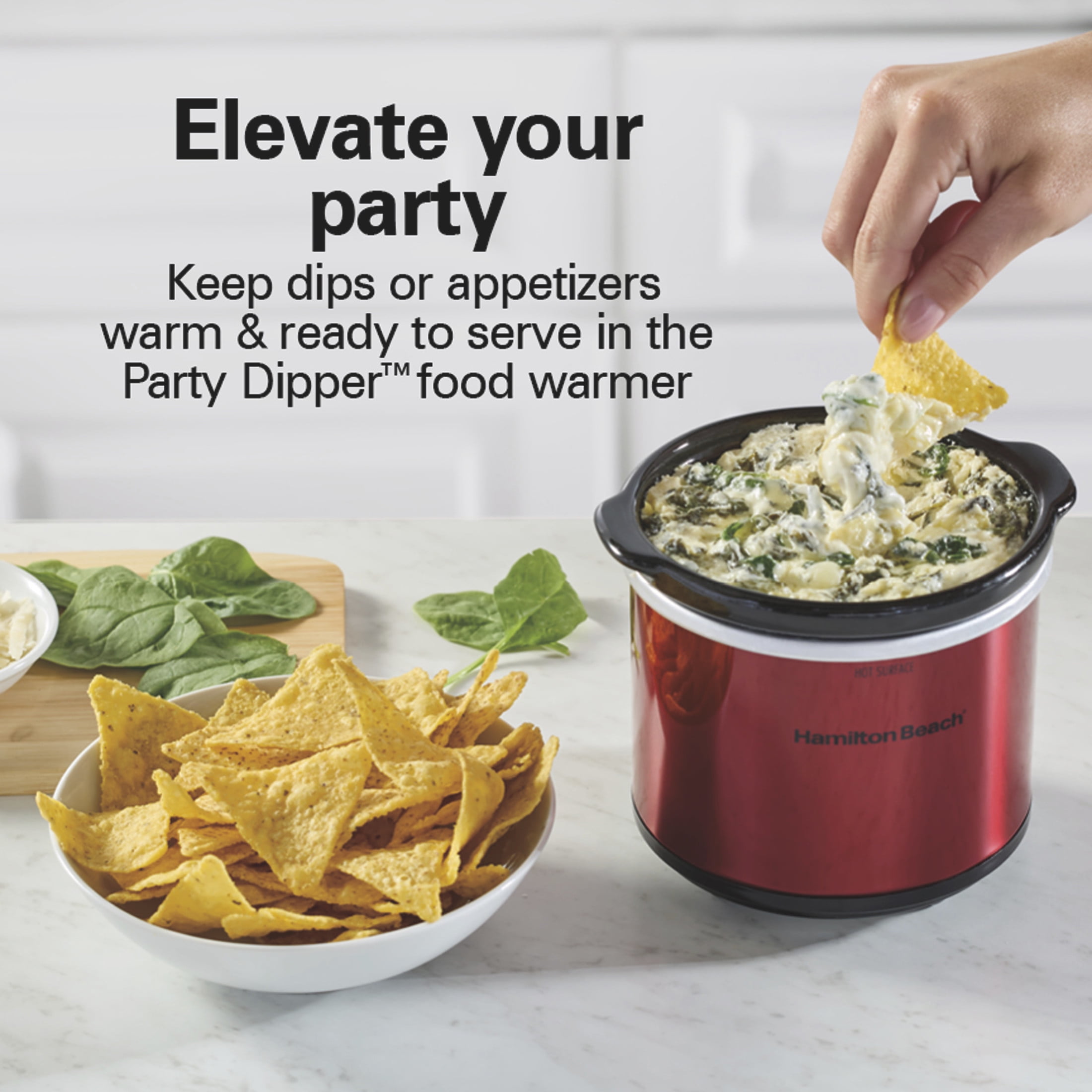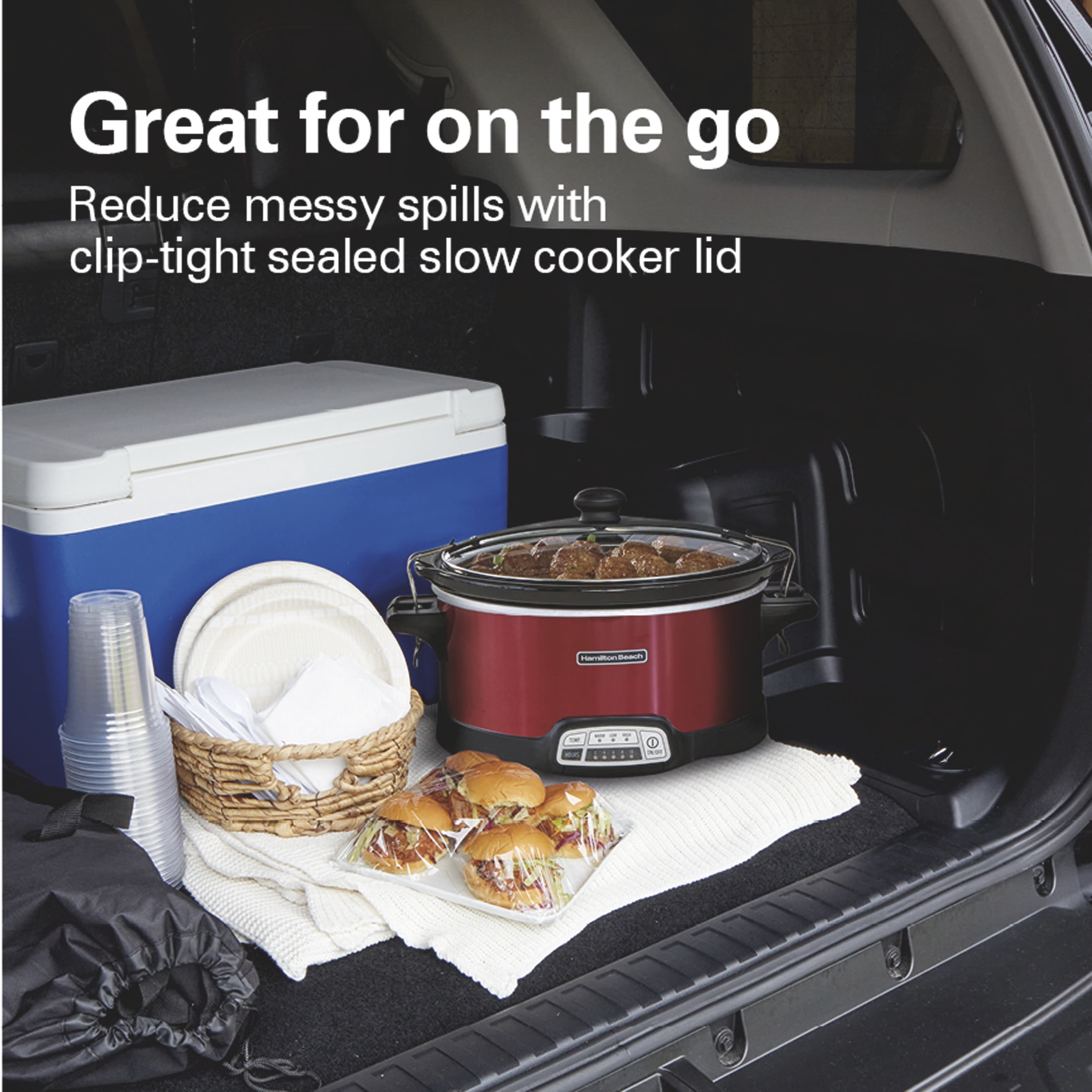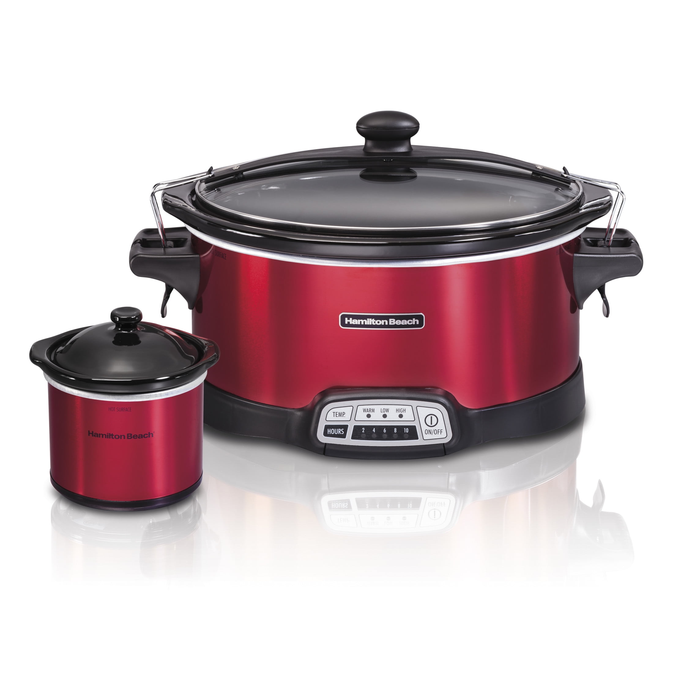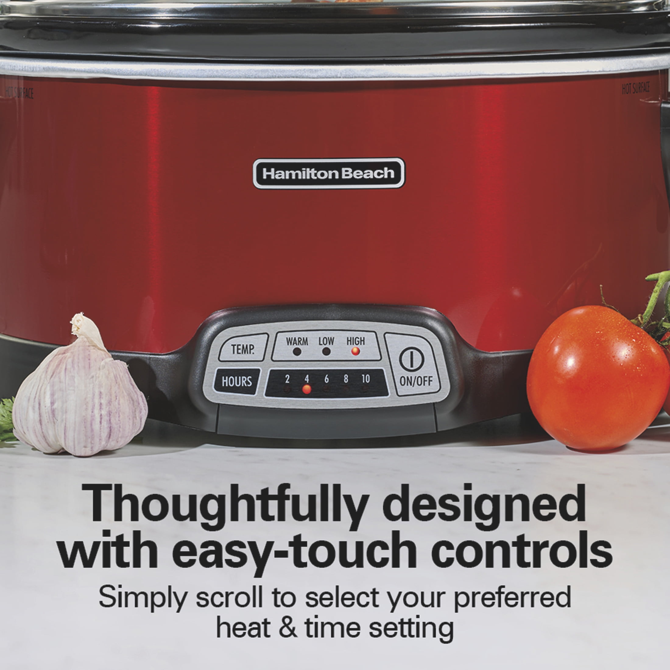 Hamilton Beach 7 Qt Programmable Slow Cooker, Stoneware Crock with Removable Pot, Includes Party Dipper Food Warmer, Red