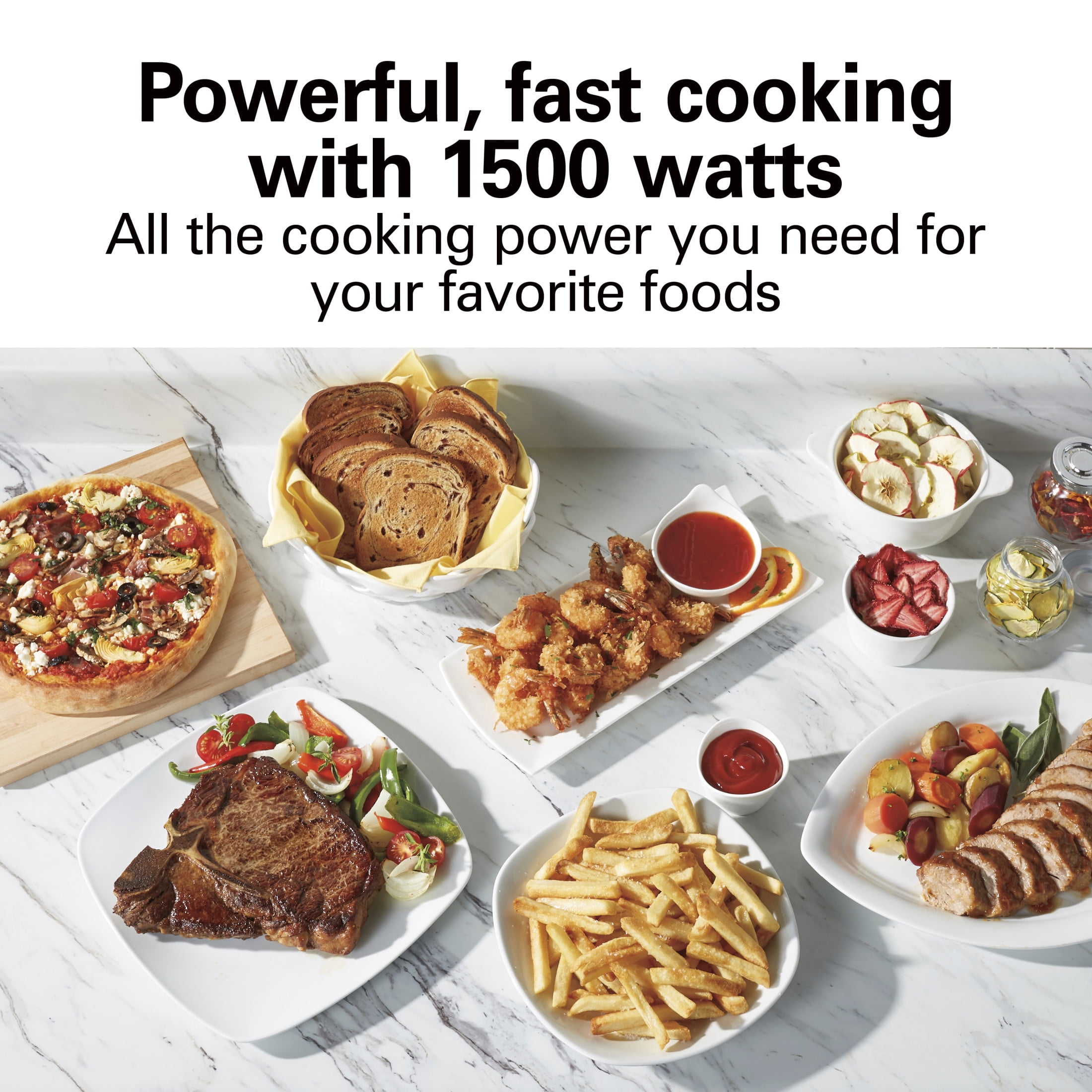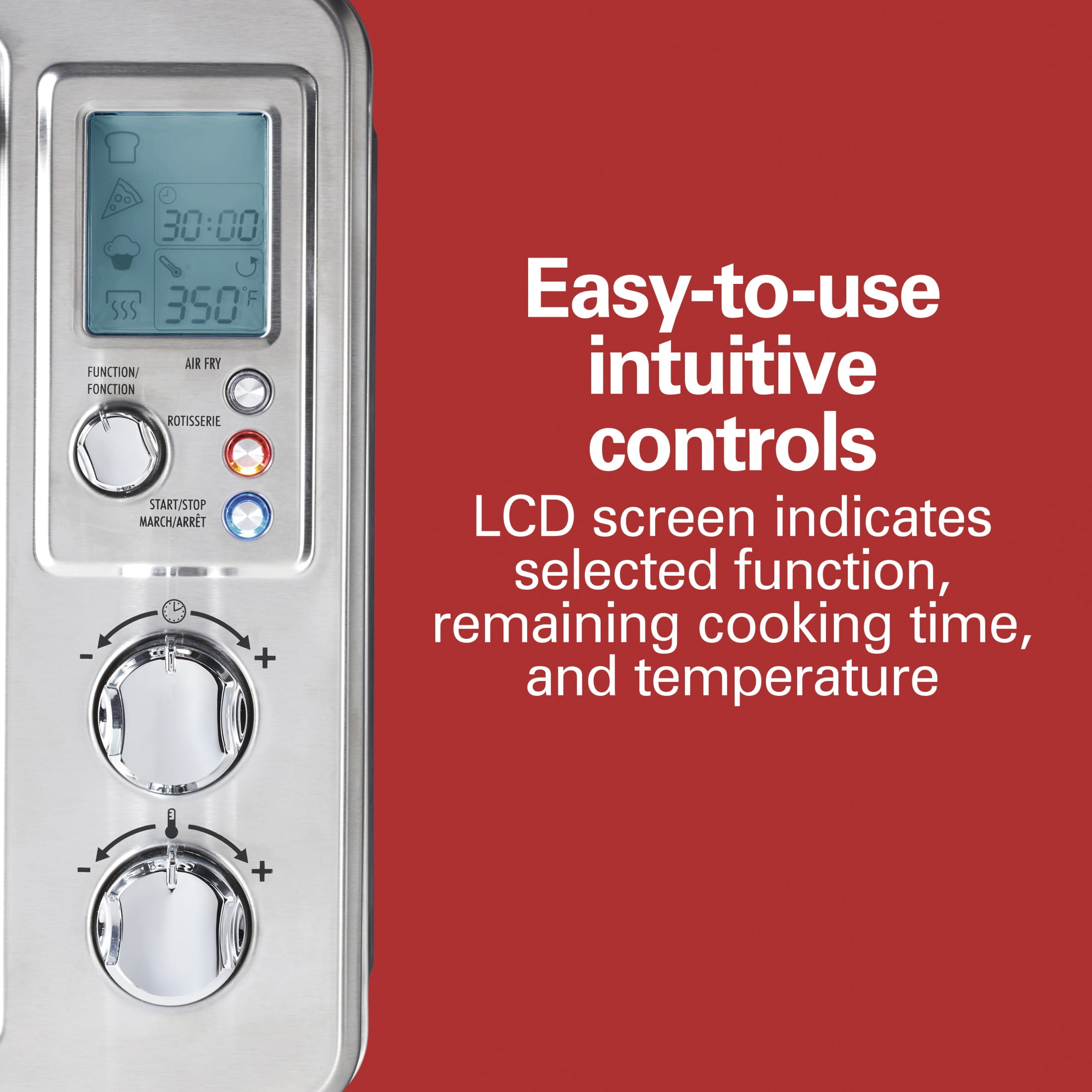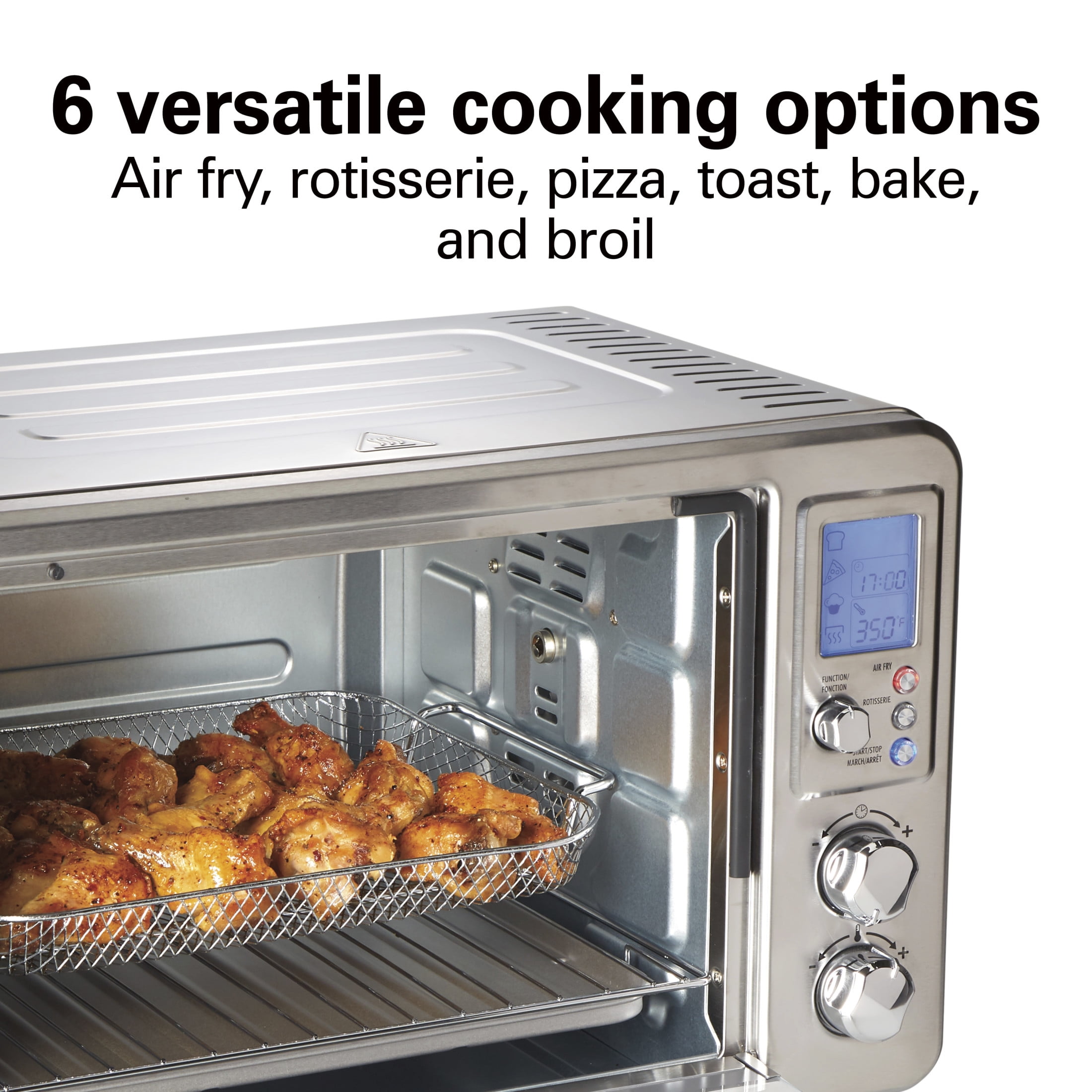 AIR POWERFULLY CIRCULATES FOR EVENLY BROWNED FOOD WITH LITTLE TO NO OIL: The Sure-Crisp air fry convection function* circulates air around food as it cooks, creating crispy and delicious fries, chicken wings, steaks, fish, vegetables and more. AIR FRYER OVEN COMBO WITH 6 VERSATILE COOKING OPTIONS: Go from air frying chicken on Friday to cooking a whole rotisserie chicken on Sunday. Additional settings for pizza, toast, bake and broil add versatility and have a beep at the end of the cycle. PLENTY OF COOKING SPACE: This toaster oven with air fryer has plenty of room for everything from a whole rotisserie chicken, 12″ pizza, 6 slices of toast or a 9″ x 11″ baking pan. Three rack positions provide flexibility to fit a variety of food. INCLUDES MESH AIR-FRY BASKET, BAKE PAN, BROIL RACK AND SLIDE-OUT CRUMB TRAY. The air fryer oven comes with all the accessories you need to air fry, bake, broil, and toast, plus a slide-out crumb tray. EASY-TO-USE INTUITIVE CONTROLS: LCD screen indicates your selected function, the remaining cooking time and temperature. Includes adjustable temperature dial and cooking timer with auto shutoff and stay-on setting.