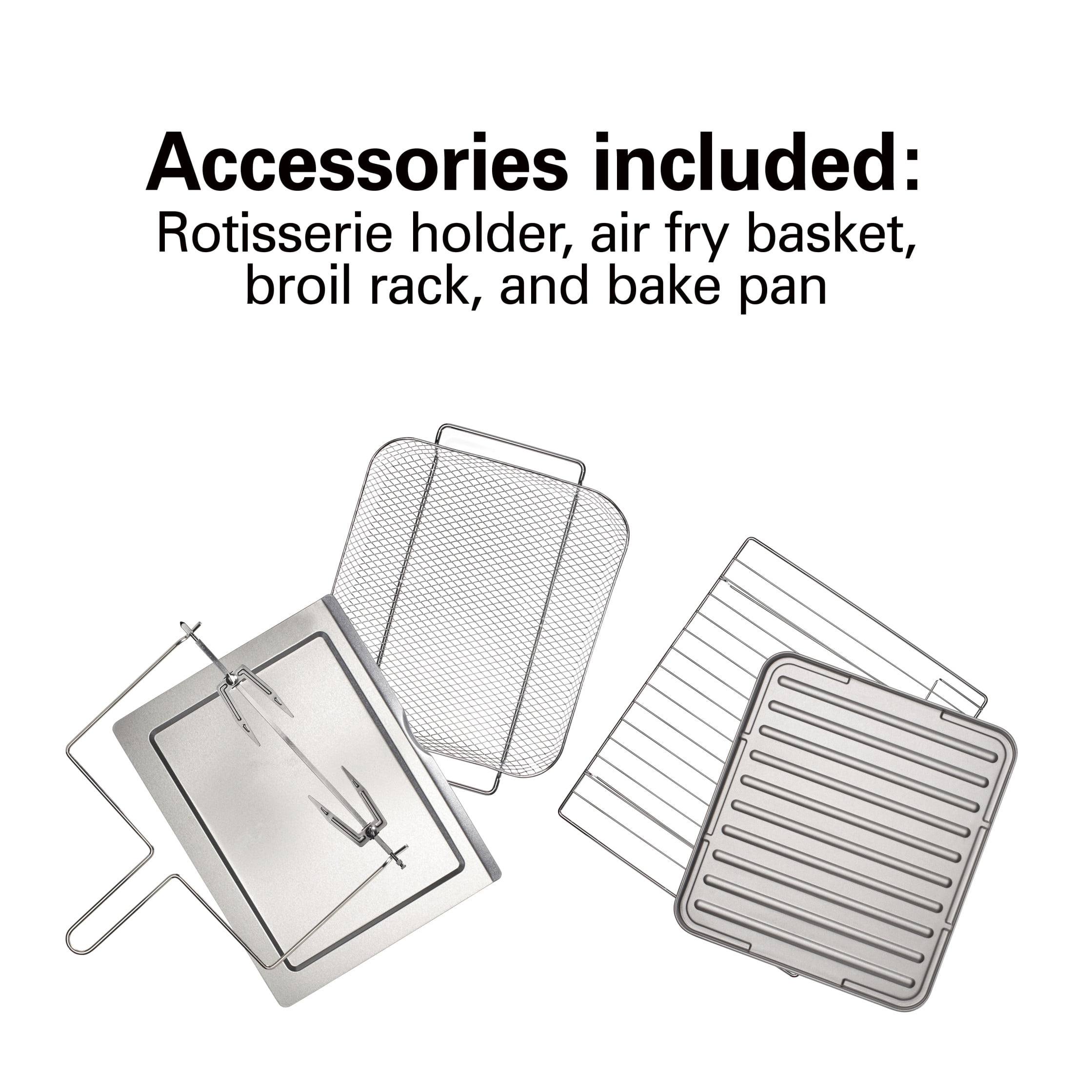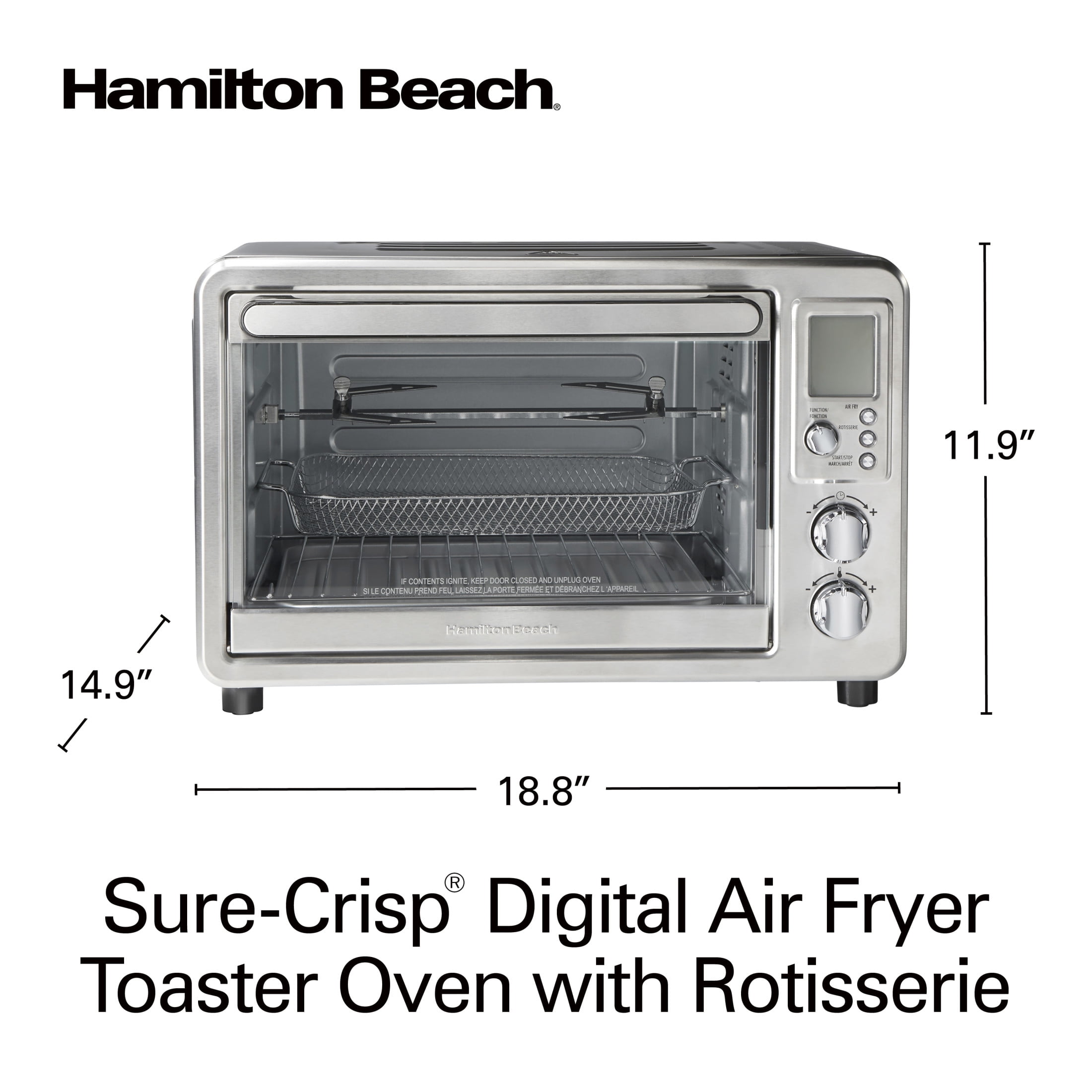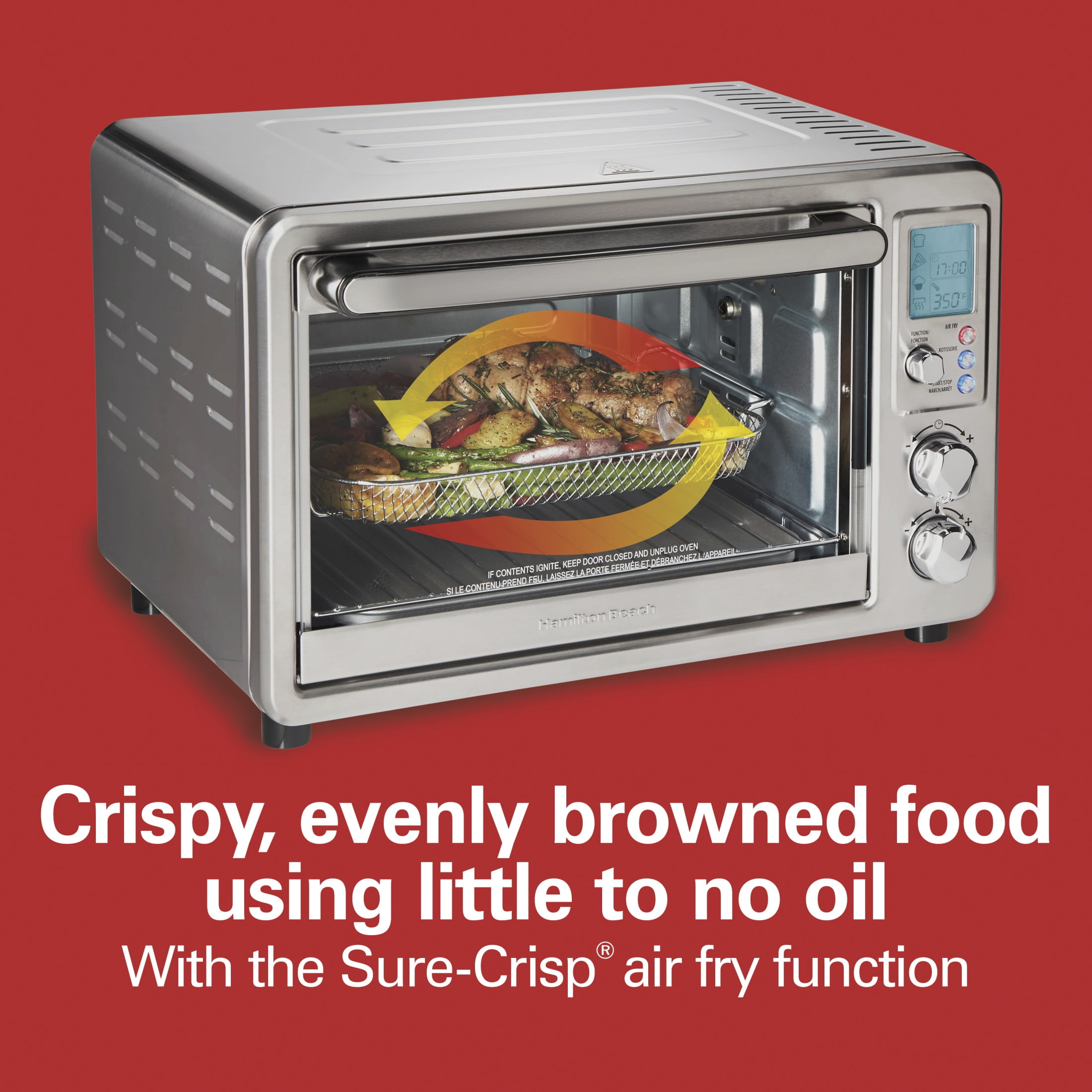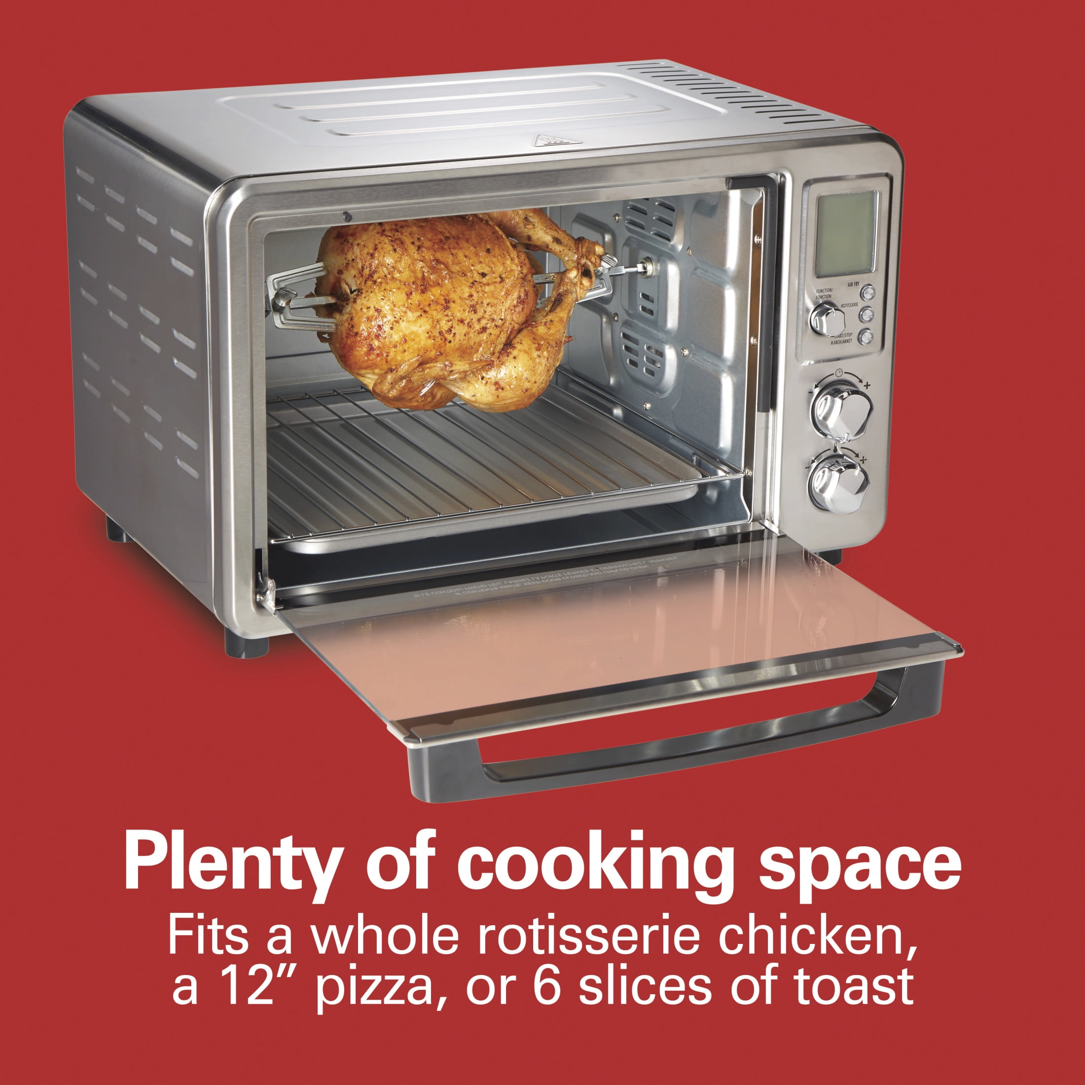 The Hamilton Beach® Sure-Crisp® Digital Air Fryer Toaster Oven with Rotisserie combines Sure-Crisp® air frying functionality* with the versatility of a rotisserie and classic toaster oven. You get the even crisping and browning of air frying right on your countertop, along with the ability to rotisserie, toast, bake and broil. Using little to no oil, the Sure-Crisp function turns fresh or frozen French fries, chicken wings, steaks, fish, vegetables and more into crispy deliciousness that you and your family will love. The Hamilton Beach Sure-Crisp Digital Air Fryer Toaster Oven provides plenty of cooking space and lets you rotisserie a whole chicken, cook a 12″ pizza or toast 6 slices of bread. The intuitive controls include 6 settings to cover every cooking need and a digital LED panel to keep you informed about the preheating status, remaining cooking time and current temperature. The oven features 3 rack positions for cooking flexibility and it includes a mesh air-fry basket, rotisserie accessories, bake pan, broil rack and slide-out crumb tray.