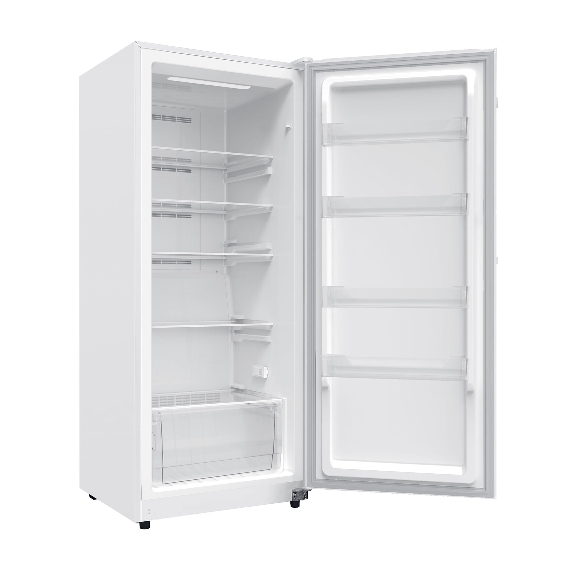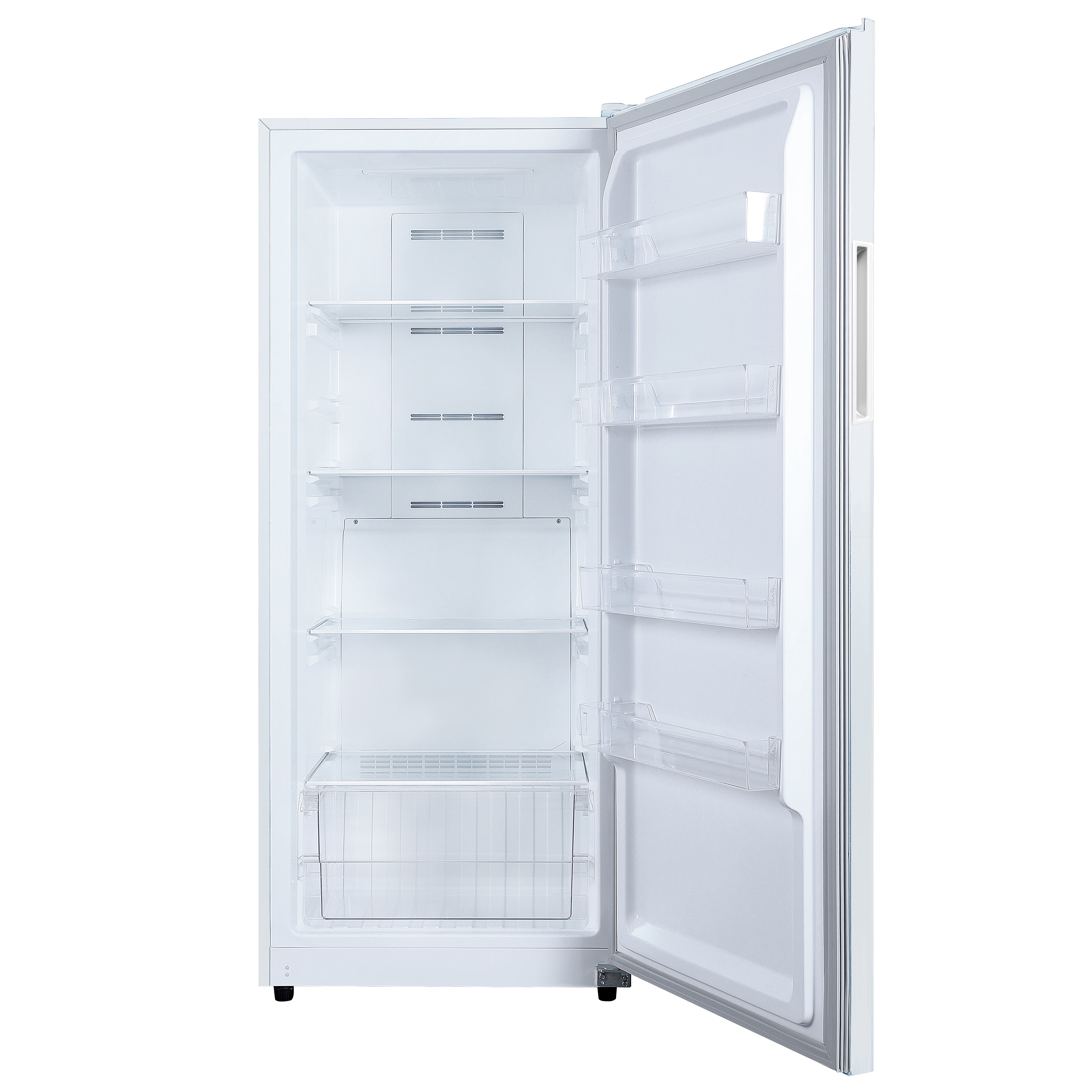 2-In-1 freezer or fridge, switch between freezer and refrigerator with a single click to match your storage needs. Convertible for freezer and fridge Spacious 14 cu. ft. capacity to fit enough food for a large family Electronic controls for easy and precise temperature adjustments Frost-free to eliminate the need for manual defrosting 4 removable tempered glass shelves keep your food organized and easy to find 4 in-door shelves provide additional storage space Bottom slide-out transparent drawer/bin for extra storage convenience 2 roller and 2 adjustable front leveling legs ensure that your freezer is level even if your floor is not Recessed handle for a sleek and modern look Free-standing design lets you position it wherever you want LED interior light for easy viewing of your frozen goods Classic white color that complements any décor