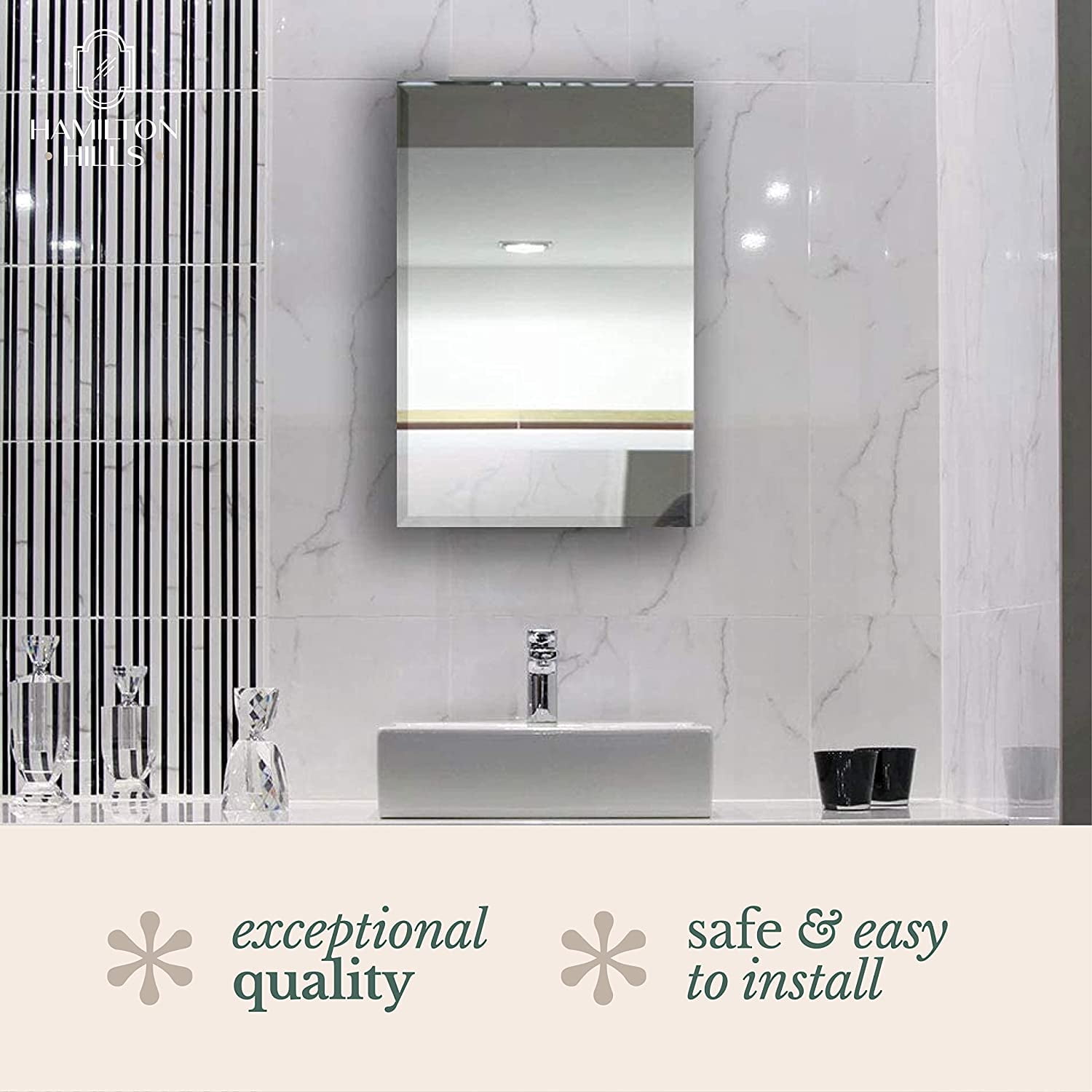 Hamilton Hills Simple Recessed Medicine Cabinet with Mirror Product Details Package Dimensions: 32.5 x 21 x 8 inches Item Weight: 26.9 pounds Manufacturer: Hamilton Hills Item model number: HH1441 Date First Available: November 20, 2019 RECESSED MIRRORED CABINET IN WALL: Our streamlined reccessing medicine cabinet is the perfect solution to provide additional shelf and storage space, all hidden behind a simple frameless 1/4″ beveled glass mirror plate. Detailed dimension on the additional images. 3 Adjustable Glass shelves inside for storage. SAFE AND EASY TO INSTALL: Our authentic silver backed glass comes with safety polished edges for protection and a beautiful finished appearance. Secured to a fully hinged swinging metal door . Install with a right side open door or a left side open door. Adjustable glass shelves can be moved around or removed. Door is secured by magnetic clasps to keep it from falling open. 3 GENERATIONS OF EXCELLENCE: Our family has been manufacturing and producing mirrors for over 3 generations. We stand by the quality of our mirror medicine cabinet and your experience. A perfect vanity mirror or bathroom wall cabinet. Use for shaving or makeup with a large visual area. A family owned business with simple principles. Affordable quality in America. EXCEPTIONAL QUALITY: We use premium materials not found in other lesser quality imitation mirrors you will see. Our mirrors are made to strict trade-secret standards and pass a rigorous 8 point inspection. Every mirror comes with our certification of authenticity. Our vanity mirror medicine cabinet is a perfect solution to a bathroom cabinetor additional storage out of sight. Recess it into the wall and designed towork with standard stud depths. Dual installation for left side open door orflip it upside and install with a right side open door. Detailed measurementsare shown on the additional images. Three glass shelves are adjustable andremovable to make storing your items a breeze. Solid powder coated metalconstruction to add durability and extend the life of your mirror. We stand byour products and your happiness. USA Company with 3 Generations of FamilyValues.