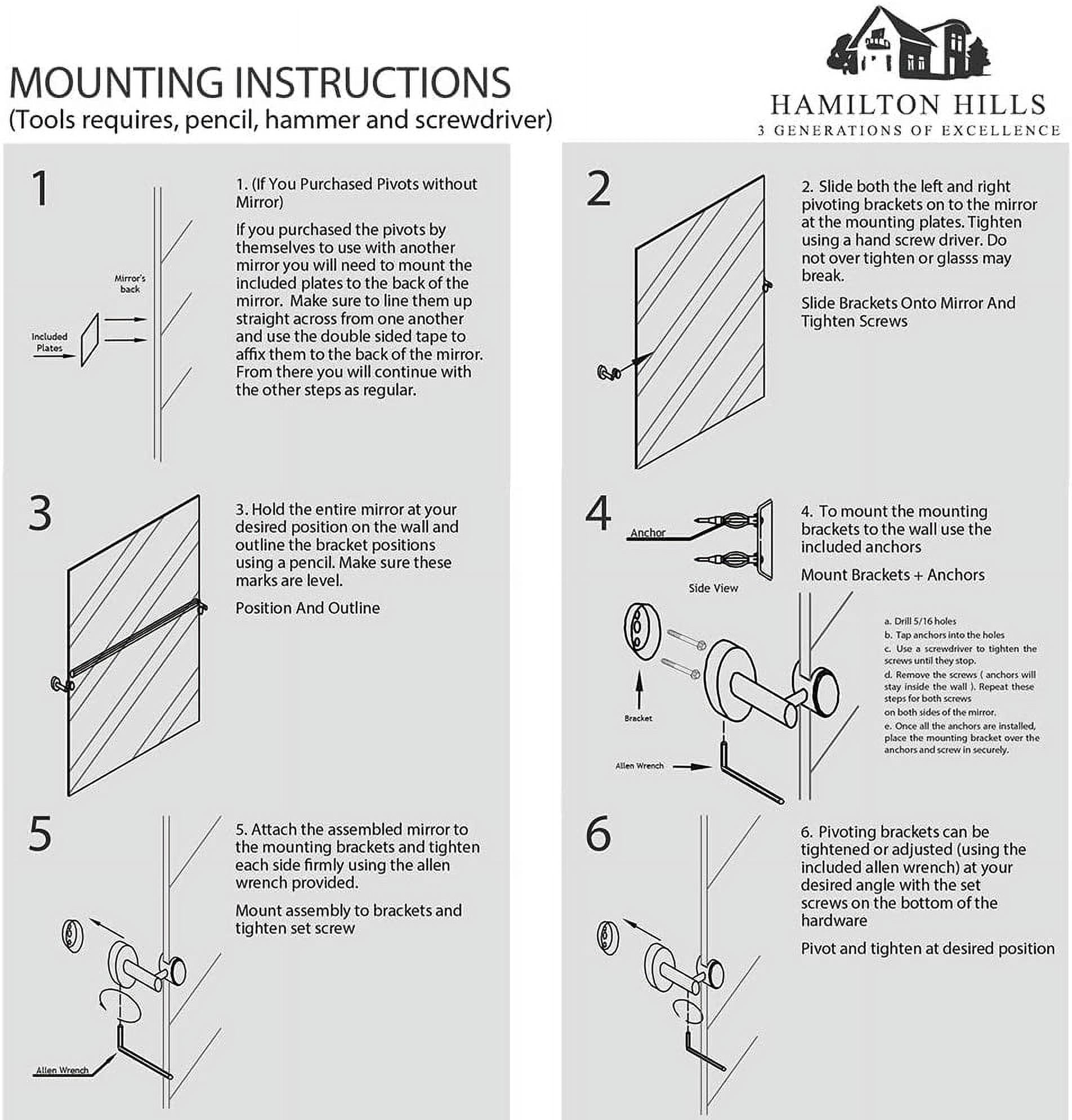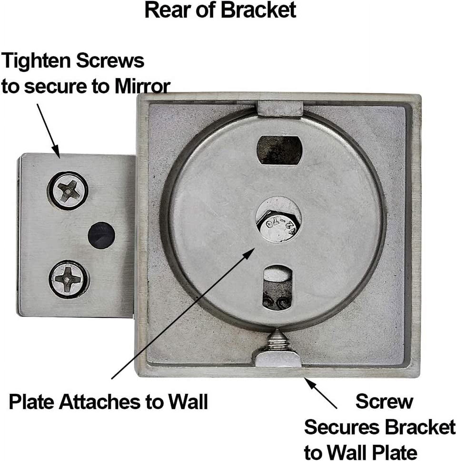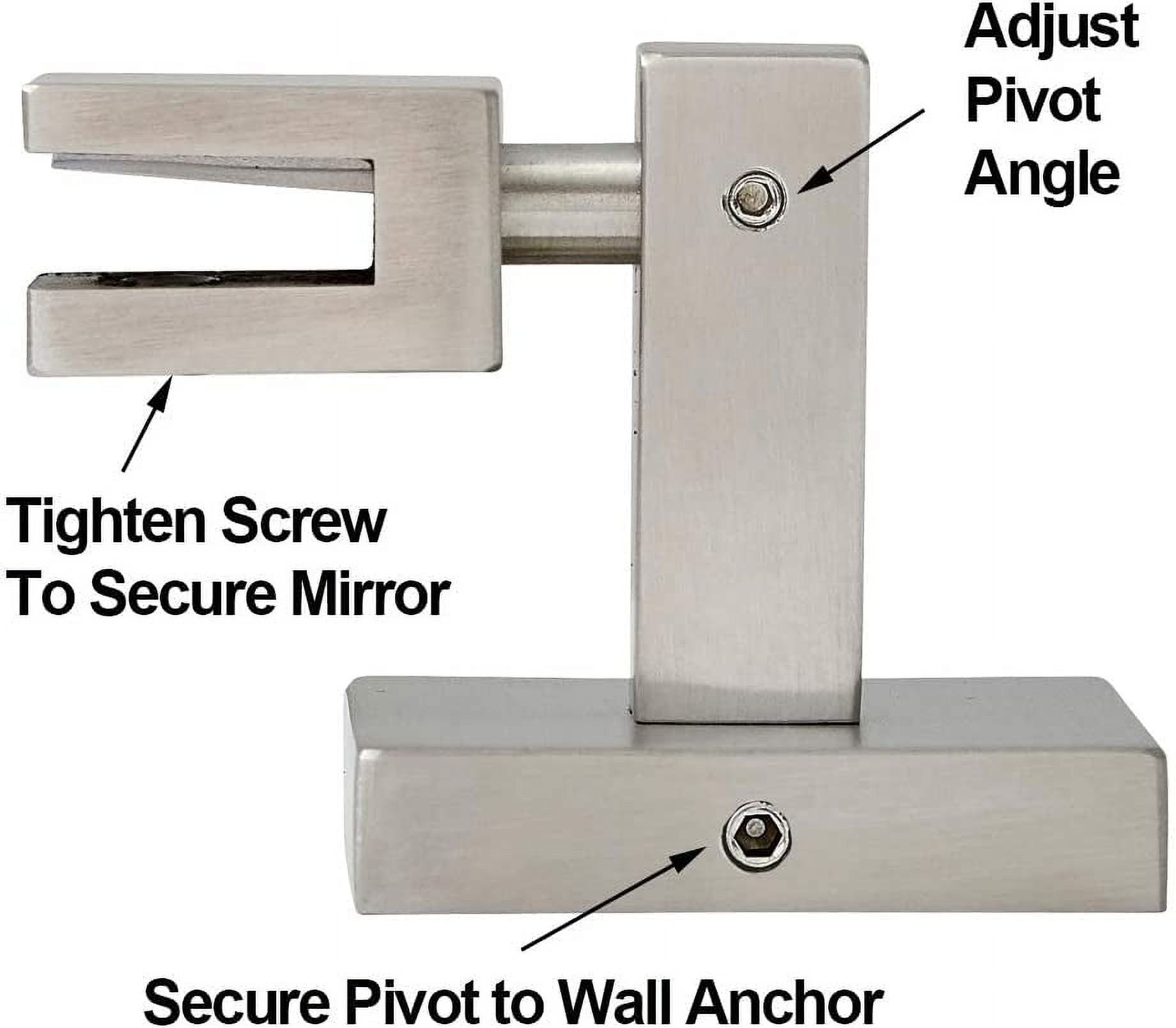 SOPHISTICATED DESIGN: Add sophistication and design to any simple piece of mirror with our simple adjustable polished silver pivot clamps. These wall brackets have a sleek, modern, clean design. Suspend your mirror plate with our pair of adjustable rotating matte black glass clamps. Avoid slipping and loosening found in cheaper brands. SAFE AND EASY TO INSTALL: Our authentic new pivot clamps tightly secure to the included metal plates that stick to the back of your mirror plate. Upgrade your existing mirror with our pair of metal brackets or swap out from a prior pivot mirror you have purchased from us in the past. All pivot sets come with our metal brackets and the slide tracks to secure to the back of your mirror. We include the hardware and screws to hang it both horizontally or vertically. 3 GENERATIONS OF EXCELLENCE: Our family has been manufacturing and producing mirrors and mirror mounting hardware for over 3 generations. We stand by the quality of our product and your experience. A family owned business with simple principles. Affordable quality in America. EXCEPTIONAL QUALITY: We use premium materials not found in other lesser quality imitation competitors you will see. Our pivots are made to strict trade-secret standards and pass a rigorous 8 point inspection. SOPHISTICATED DESIGN: Add sophistication and design to any simple piece of mirror with our simple adjustable polished silver pivot clamps. These wall brackets have a sleek, modern, clean design. Suspend your mirror plate with our pair of adjustable rotating matte black glass clamps. Avoid slipping and loosening found in cheaper brands. SAFE AND EASY TO INSTALL: Our authentic new pivot clamps tightly secure to the included metal plates that stick to the back of your mirror plate. Upgrade your existing mirror with our pair of metal brackets or swap out from a prior pivot mirror you have purchased from us in the past. All pivot sets come with our metal brackets and the slide tracks to secure to the back of your mirror. We include the hardware and screws to hang it both horizontally or vertically. 3 GENERATIONS OF EXCELLENCE: Our family has been manufacturing and producing mirrors and mirror mounting hardware for over 3 generations. We stand by the quality of our product and your experience. A family owned business with simple principles. Affordable quality in America. EXCEPTIONAL QUALITY: We use premium materials not found in other lesser quality imitation competitors you will see. Our pivots are made to strict trade-secret standards and pass a rigorous 8 point inspection. Square Mirror Clips are the best choice to install a pivot mirror. This is a set of two high-quality polished silver-finished steel clips with screws. It will let the user see their reflection from a different angle without getting off their seat. Its feature chrome plated finish will add a touch of elegance to any room in your home or office. SOPHISTICATED DESIGN: Add sophistication and design to any simple piece of mirror with our simple adjustable polished silver pivot clamps. These wall brackets have a sleek, modern, clean design. Suspend your mirror plate with our pair of adjustable rotating matte black glass clamps. Avoid slipping and loosening found in cheaper brands. SAFE AND EASY TO INSTALL: Our authentic new pivot clamps tightly secure to the included metal plates that stick to the back of your mirror plate. Upgrade your existing mirror with our pair of metal brackets or swap out from a prior pivot mirror you have purchased from us in the past. All pivot sets come with our metal brackets and the slide tracks to secure to the back of your mirror. We include the hardware and screws to hang it both horizontally or vertically. 3 GENERATIONS OF EXCELLENCE: Our family has been manufacturing and producing mirrors and mirror mounting hardware for over 3 generations. We stand by the quality of our product and your experience. A family owned business with simple principles. Affordable quality in America. EXCEPTIONAL QUALITY: We use premium materials not found in other lesser quality imitation competitors you will see. Our pivots are made to strict trade-secret standards and pass a rigorous 8 point inspection. Square Mirror Clips are the best choice to install a pivot mirror. This is a set of two high-quality polished silver-finished steel clips with screws. It will let the user see their reflection from a different angle without getting off their seat. Its feature chrome plated finish will add a touch of elegance to any room in your home or office.