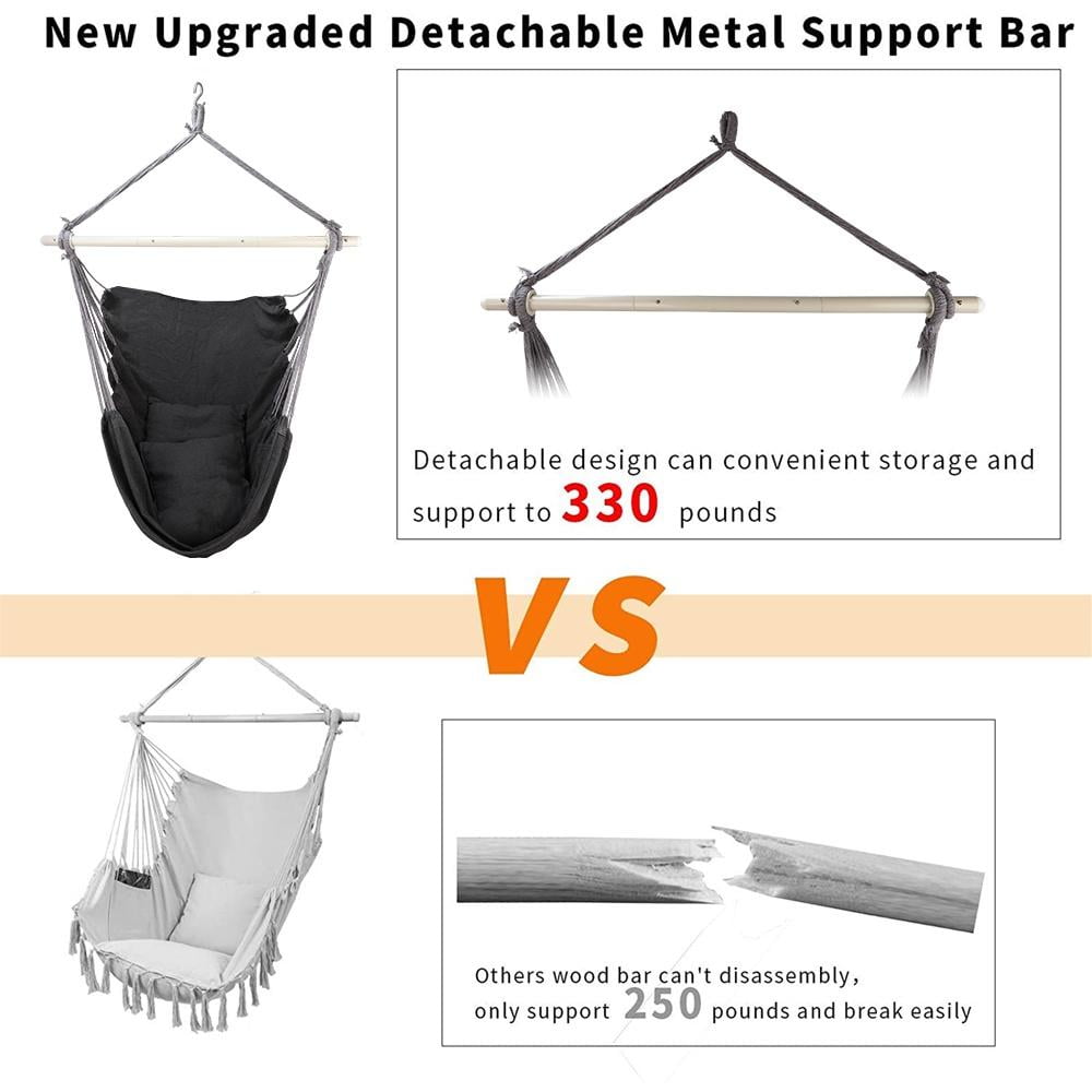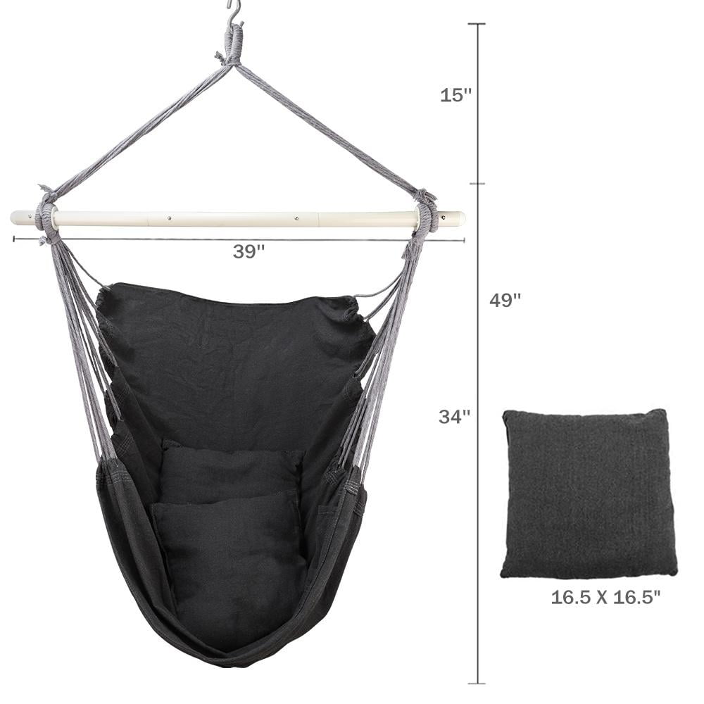 Hammock chair is essential for romantic and relaxing places such as gardens, lawns, courtyards, parks, lakesides and seaside. At different times, rope hanging chair can provide you with a comfortable space, and all you can do is enjoy this romantic and comfortable time. Our hammock chair swing seat comes with 2 soft pillows, with vibrant designs, and the cotton cloth seats are more breathable. What are you waiting for? Let yourself enjoy a comfortable time. 【High-Quality & Stylish Design】 Designed with high-quality cotton canvas fabric, strong cotton ropes, and a hardened wooden spreader bar with groves on each end, the hammock chair is more stable and durable. You don’t have to worry about any security issues, just relax and enjoy it wherever you go. 【Upgraded Detachable Metal Support Bar】 The new hanging chair uses detachable metal steel support bar with 3 assembled easily sections, it can hold up to 330 lbs weight. The 39 inch metal bar not only has 2 anti-slip rings, which can fix the sling at both ends and prevent slipping but there are 22 hanging ropes on both sides of the hammock chairs that can ensure balance and safe sitting when swinging. 【Cushions Included】 Two pillows for enhanced comfort and support. Large enough to cushion your sitting position without eating up the whole space. 【Easy to Carry】 The product is lightweight, and with a carry bag, you can carry it anywhere. Just hang it from the ceiling, post, tree or stand. Lay back and relax as you enjoy this soft and extra-comfortable hammock swing chair. 【Large Size Design】 Large size design not only allows you to sit comfortably, but also recline with full head support. Provide you with a comfortable space. 【Indoor / Outdoor Use】 Perfect for bedroom, living room, balcony, porch, backyard and garden etc. 【Great Gift】 Ideal gift provides the ultimate comfort and appeals to all ages. Specification: Material: Cotton, Polyester, Metal Color: Gray Size: 39 x 49″ (L x W x H) Pillow Size:16.5 x 16.5″ Metal Support Bar Length: approx.39″ Weight Capacity: 330lbs Package Includes: 1 x Hanging Rope Chair 1 x Carrying Bag 2 x Pillows Note: Colors may not appear exactly as seen on photo in real life, due to variations between the computer monitors and naked eye color difference.