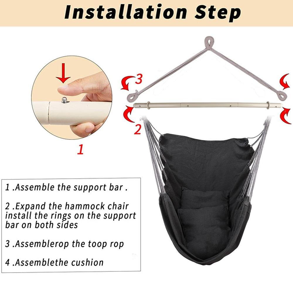 Hammock Chair Swing, Relax Hanging Rope Swing Chair with Detachable Support Bar, 2 Seat Cushions & Carry Bag, Soft Cotton Hammock Chair Swing Seat for Yard Bedroom Patio Porch Indoor Outdoor