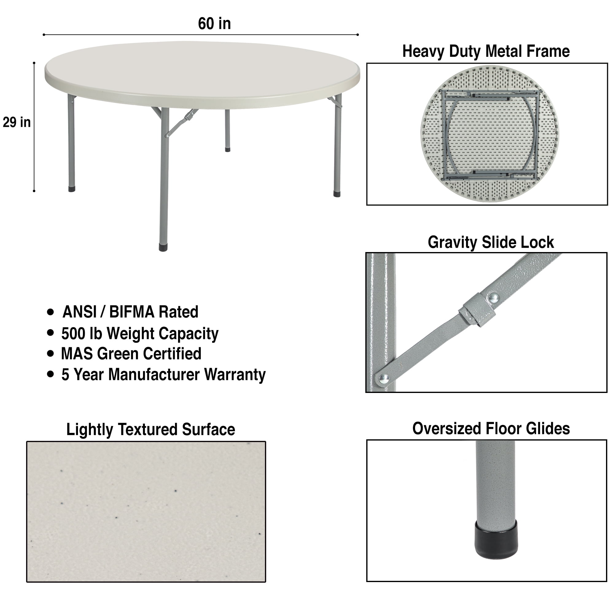 Sturdily constructed with 19 gauge steel, 2 inch thick blow molded plastic with a 1000 lb weight capacity Lightweight, straight legs and gravity slide locks to maintain overall strength and support Scratch-resistant top