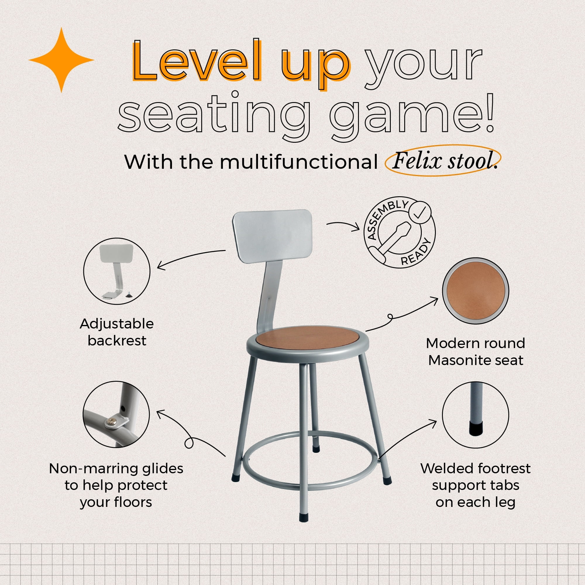 Step up your seating game and bring modern functionality to your space with the Felix Stool Collection. Designed with both style and practicality in mind, these stools are built to fit seamlessly into any environment, whether it’s a cozy kitchen nook, a trendy bar area, or a productive workspace. Constructed with durable 18-gauge steel tubing, each stool promises lasting quality while its sleek design complements a variety of decors. Available in black or grey, fixed heights of 18, 24, and 30 inches or adjustable heights ranging from 19–25, 25–33, and 31–38 inches, the Felix Stools provide flexibility to meet your specific needs. Choose models with an optional backrest for added comfort, which features a unique adjustability of 2 inches forward or backward, allowing for a customized seating experience tailored to you. The round Masonite seat offers a clean, classic look, while the welded footrest tabs on every leg ensure extra durability for everyday use. Assembly is a breeze thanks to the AssemblyReady design, so you can enjoy your new seating in no time without hassle or extra tools. The Felix Stool Collection is where comfort, durability, and modern versatility come together, making it the perfect choice to upgrade any space effortlessly.