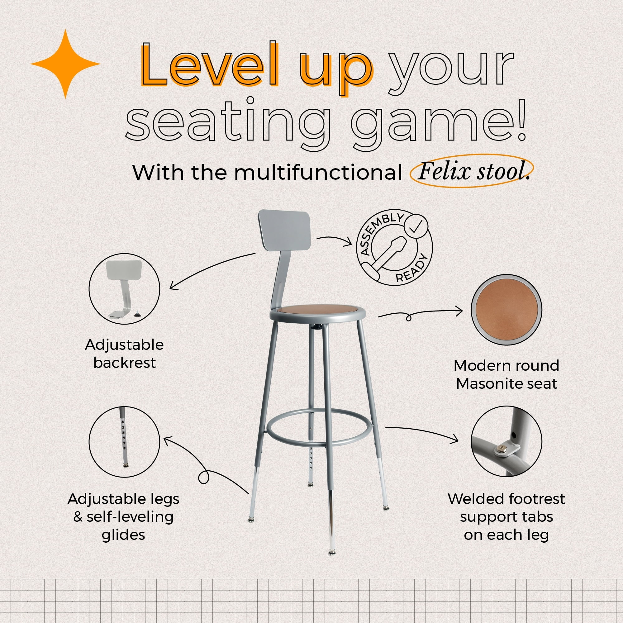 Step up your seating game and bring modern functionality to your space with the Felix Stool Collection. Designed with both style and practicality in mind, these stools are built to fit seamlessly into any environment, whether it’s a cozy kitchen nook, a trendy bar area, or a productive workspace. Constructed with durable 18-gauge steel tubing, each stool promises lasting quality while its sleek design complements a variety of decors. Available in black or grey, fixed heights of 18, 24, and 30 inches or adjustable heights ranging from 19–25, 25–33, and 31–38 inches, the Felix Stools provide flexibility to meet your specific needs. Choose models with an optional backrest for added comfort, which features a unique adjustability of 2 inches forward or backward, allowing for a customized seating experience tailored to you. The round Masonite seat offers a clean, classic look, while the welded footrest tabs on every leg ensure extra durability for everyday use. Assembly is a breeze thanks to the AssemblyReady design, so you can enjoy your new seating in no time without hassle or extra tools. The Felix Stool Collection is where comfort, durability, and modern versatility come together, making it the perfect choice to upgrade any space effortlessly.