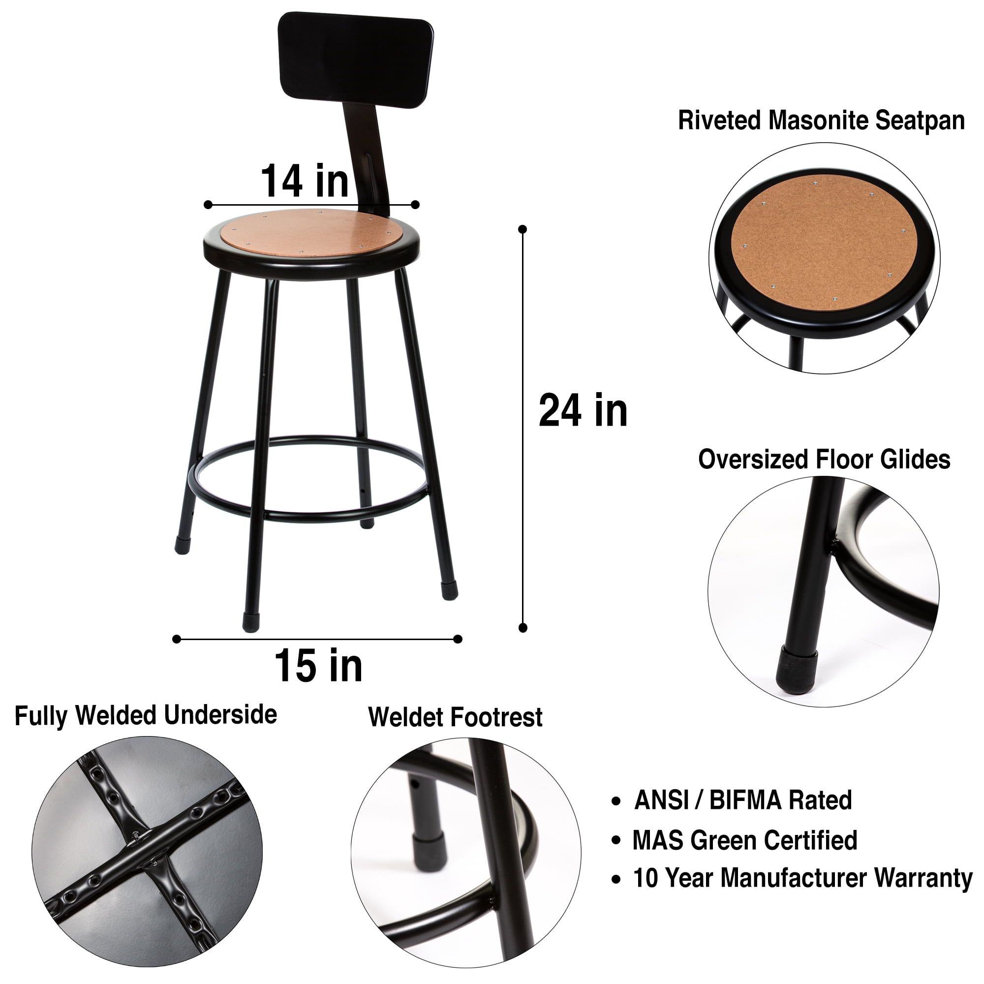Versatility: The Flynn 24 Inch Stool is perfect for any room in your home or office; use it as a seat at your office, study, or even as extra seating for guests Durability: Made from sturdy 18-gauge steel, the Flynn 24 Inch Stool can withstand the wear and tear of everyday use, and its Masonite seat is resistant to warping, chipping, and cracking, so you can count on it to last for years to come Comfort: The Flynn 24 Inch Stool has a footrest ring that provides added stability and comfort as you sit and a removable backrest, and with a weight capacity of 500lbs, you can feel secure and supported no matter how long you sit