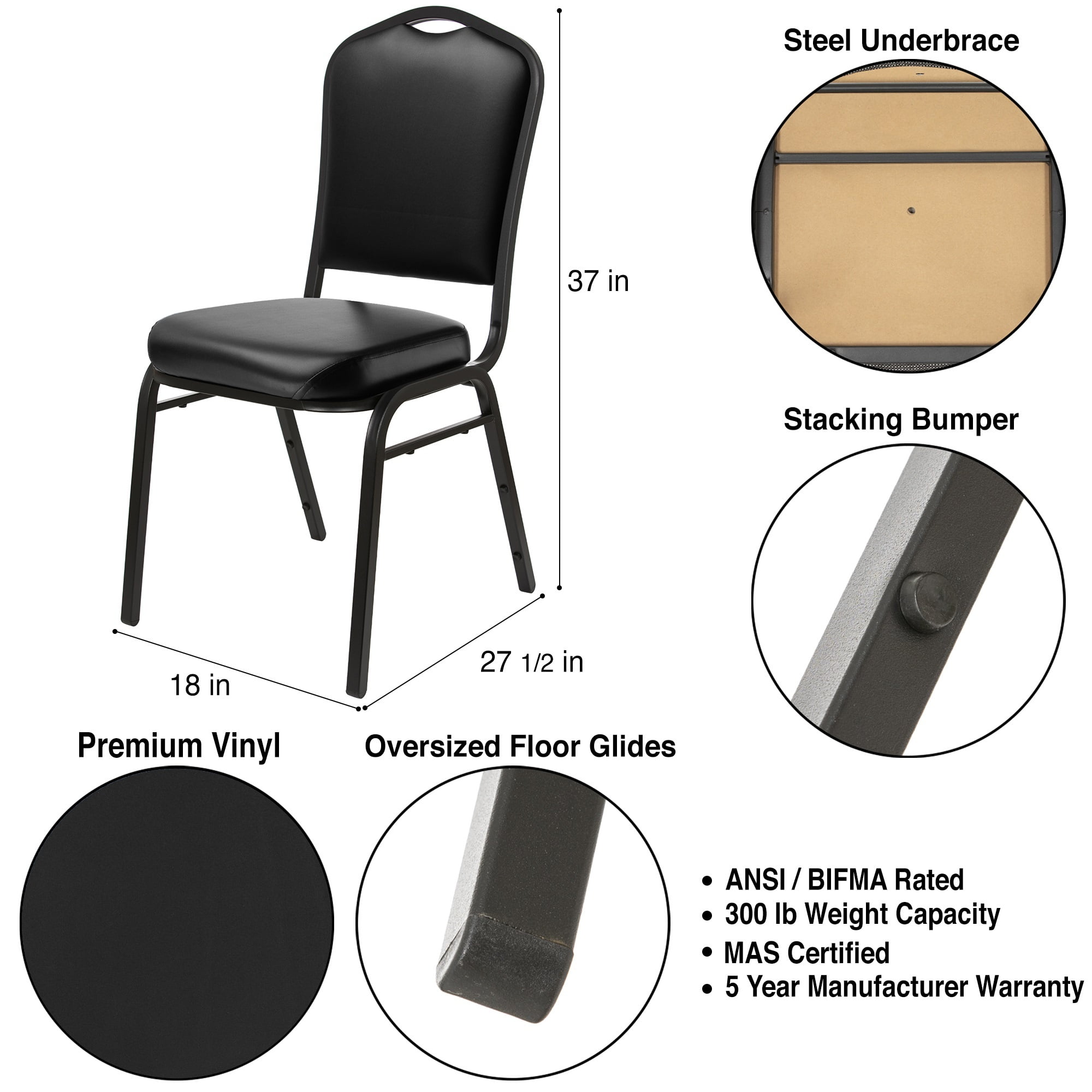 Comfortable and durable fabric upholstery Strong steel frame and H-shaped brace for support Convenient built-in handle, MDF core and stacking bars for safe stacking