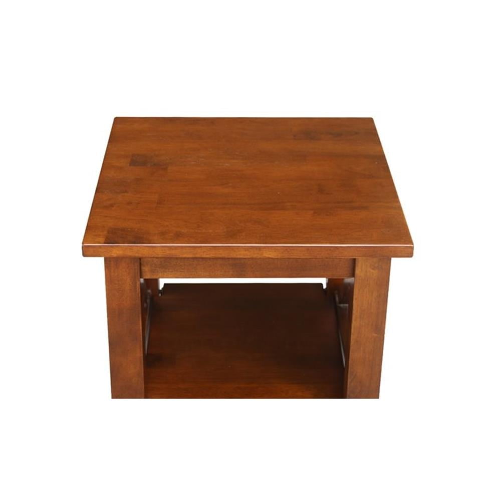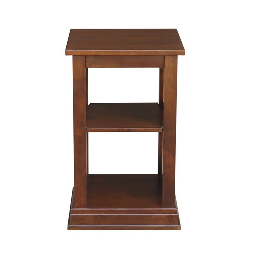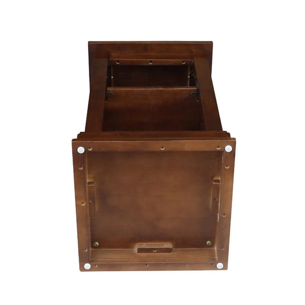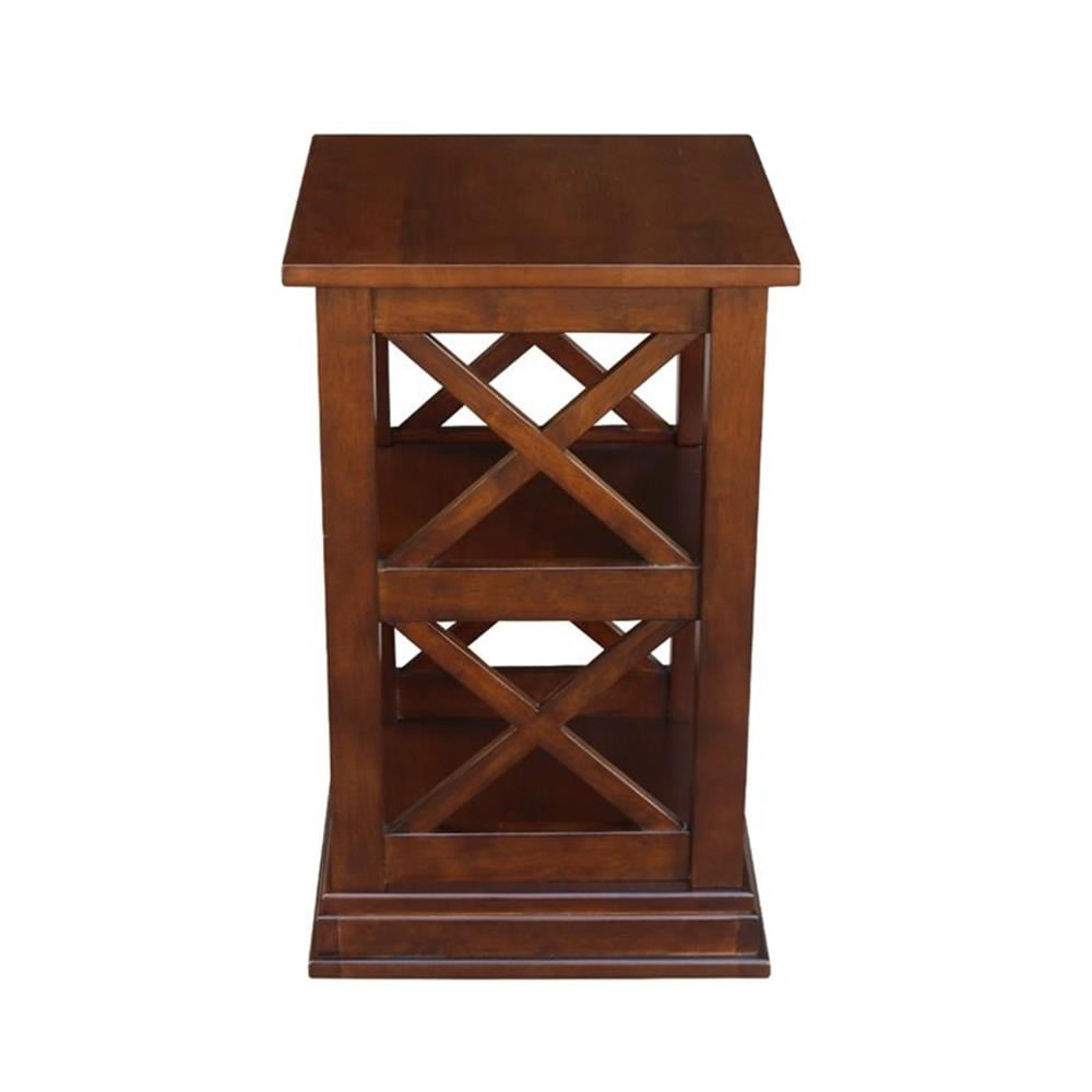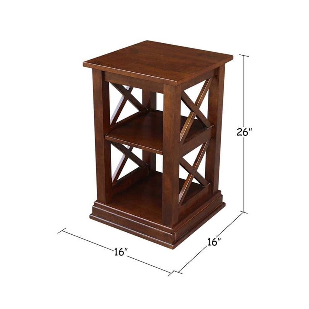 Dimensions: 16″W x 16″D x 26″H Made from solid hardwood Includes a butcher block surface Ready to assemble Size of center shelf: 11.5” X 13.8” Distance from floor to top of base: 3.14” Distance from top of base to bottom of middle shelf: 11.43”