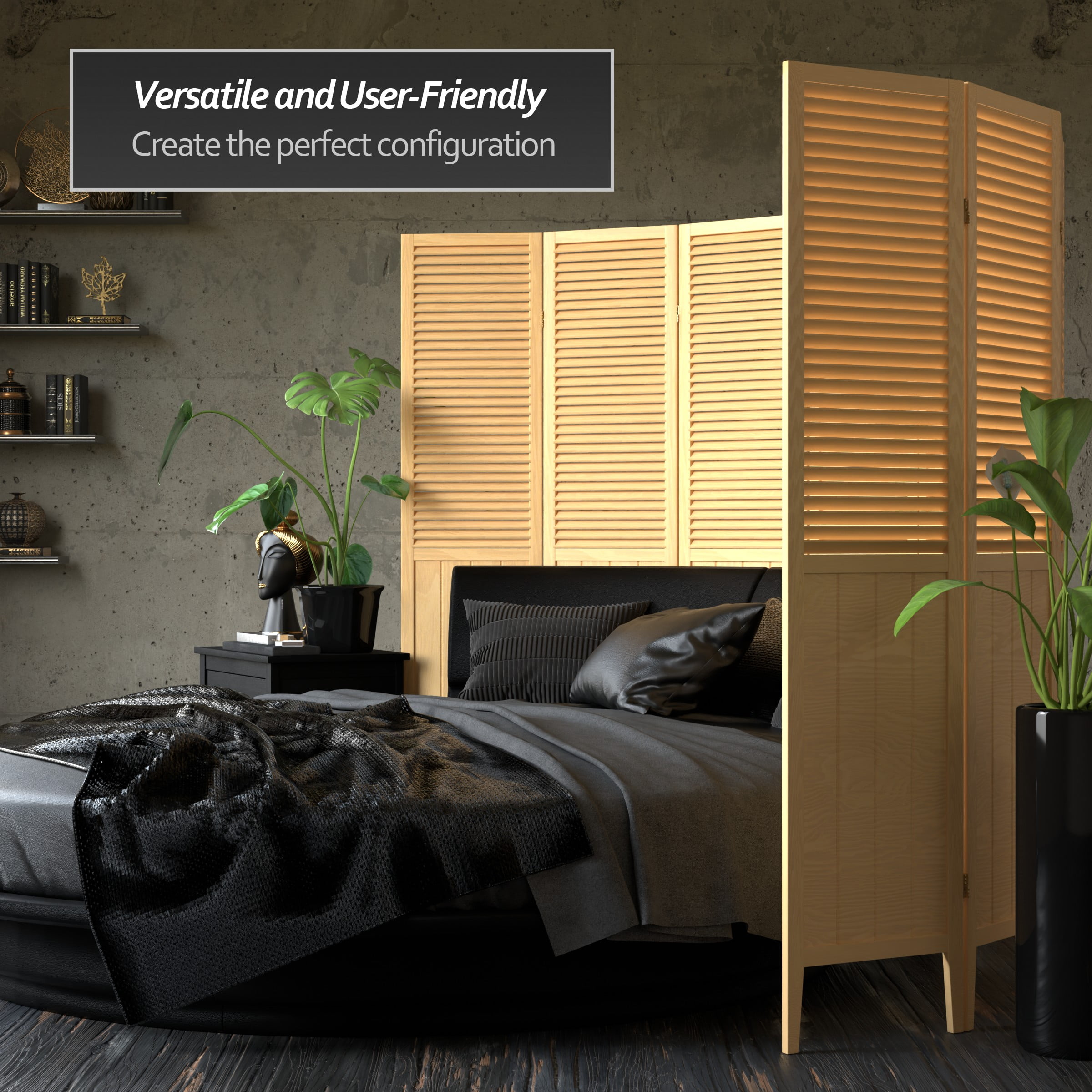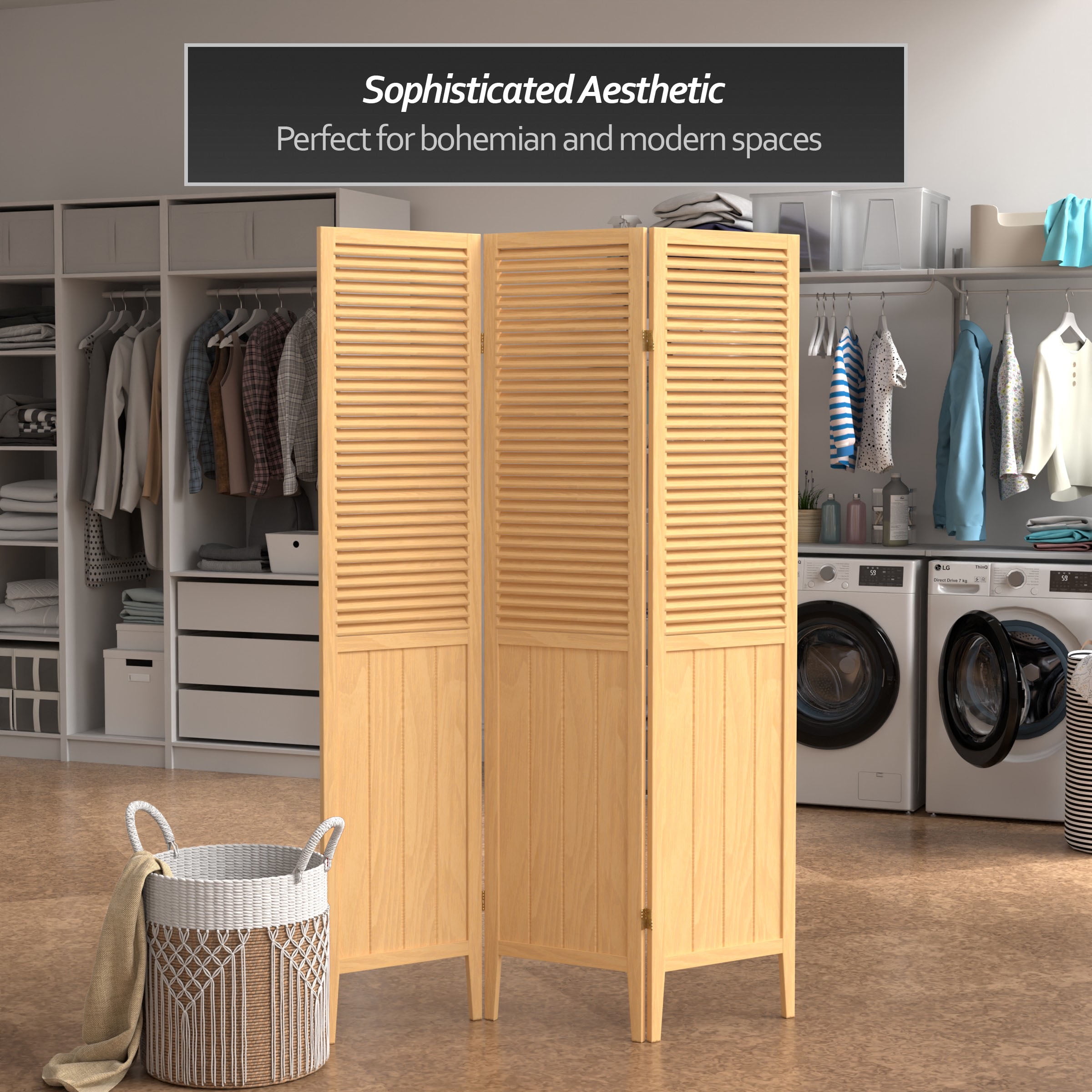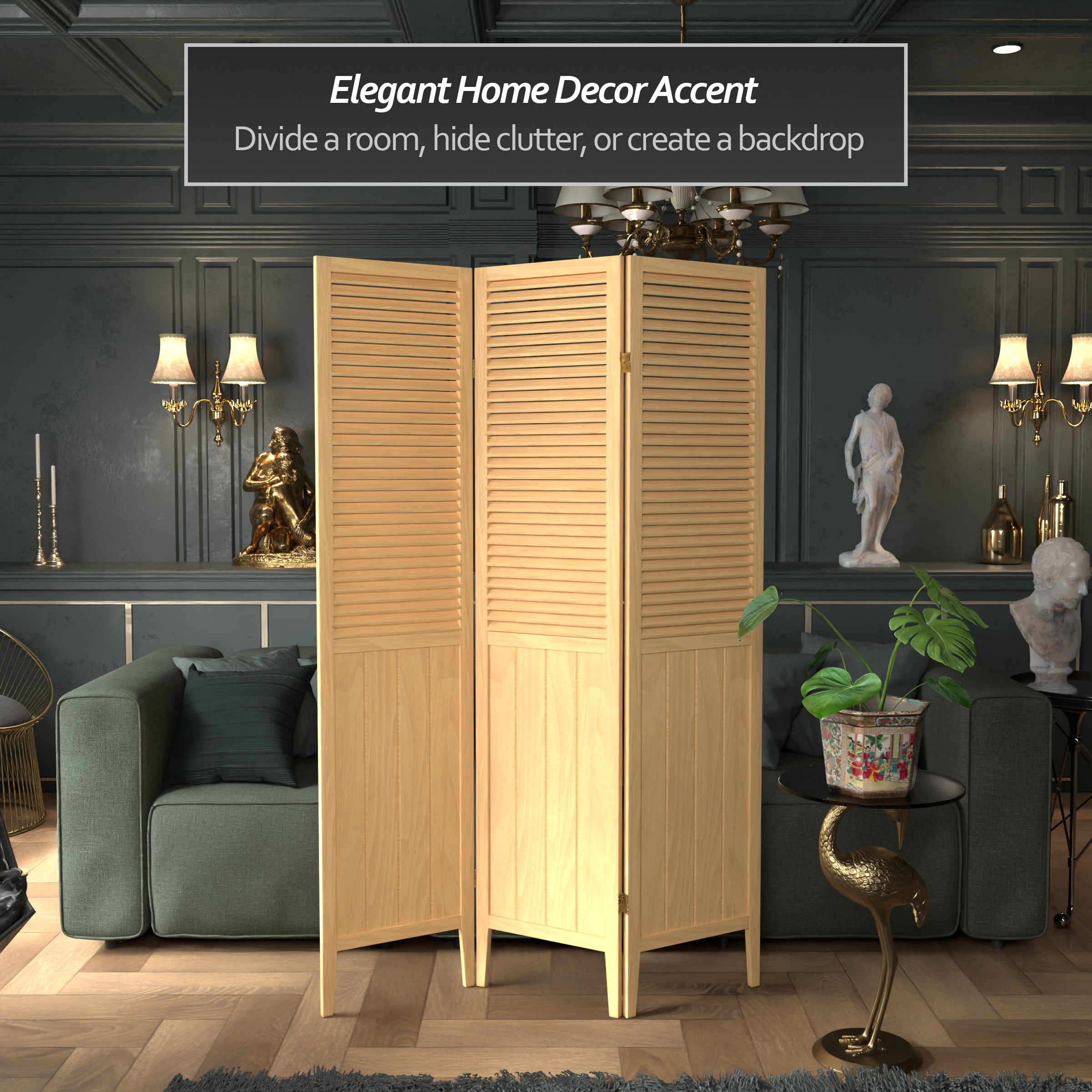 Attractive, well-crafted room divider is perfect where a simple contemporary look is preferred Decorative screen allows air and light to pass through slats Decorative accessory has lacquered brass 2-way hinges so you can bend the panels in either direction