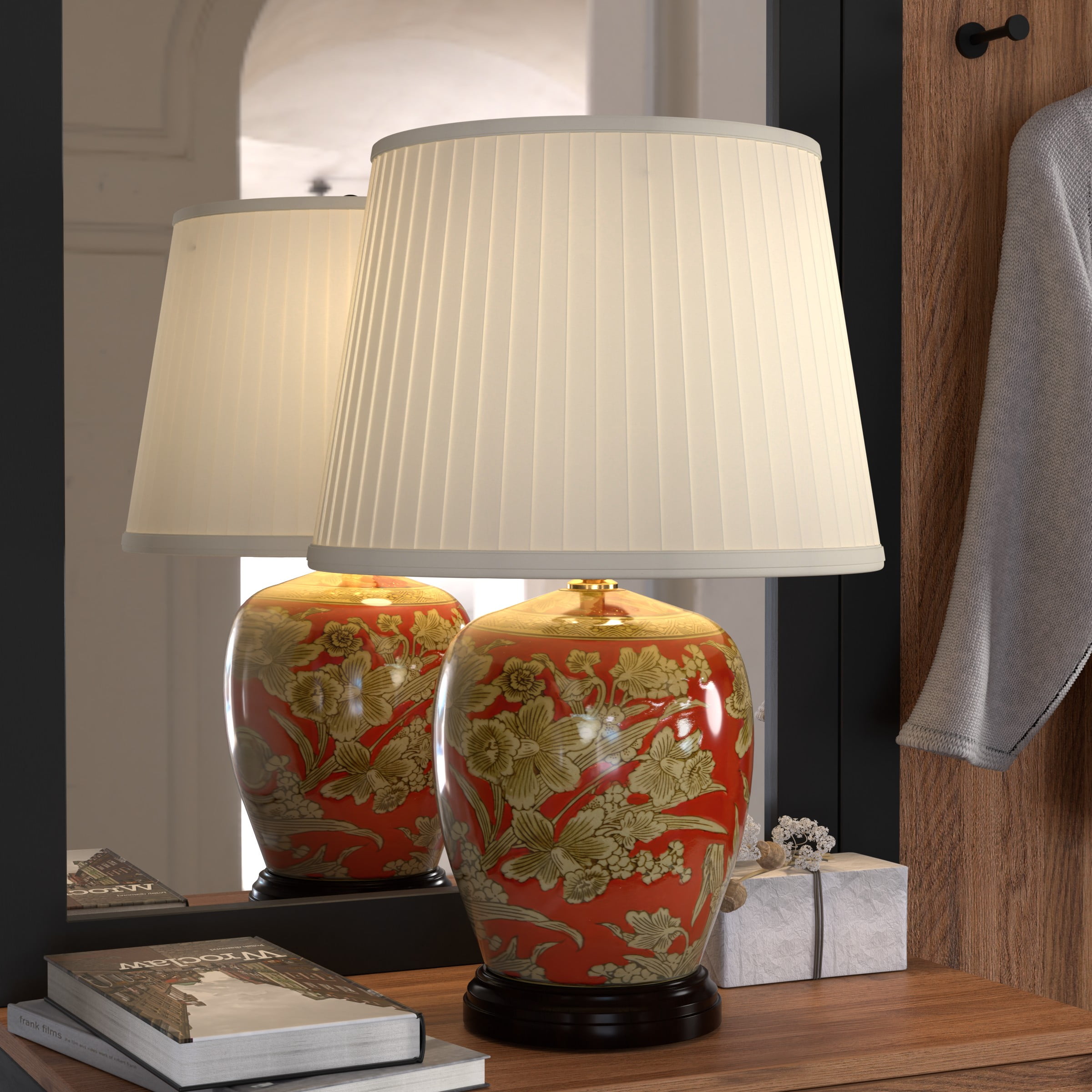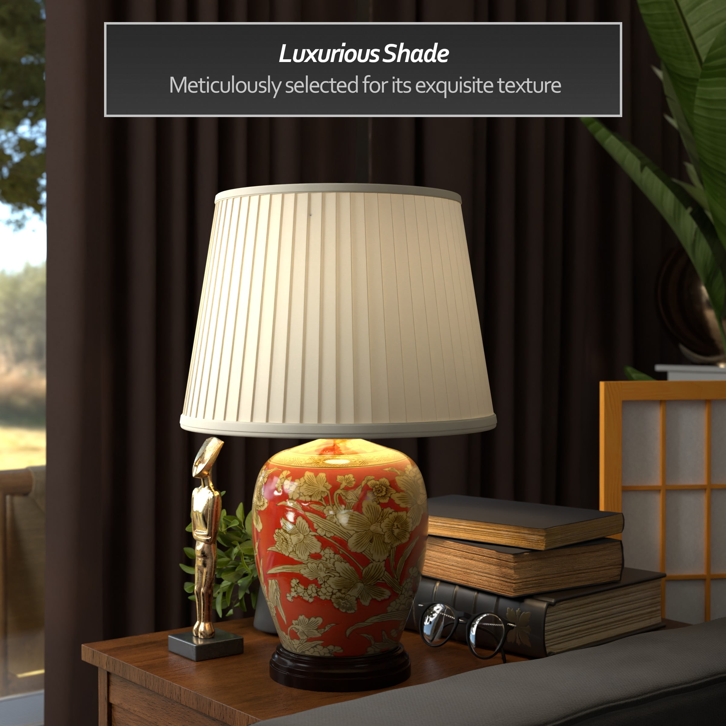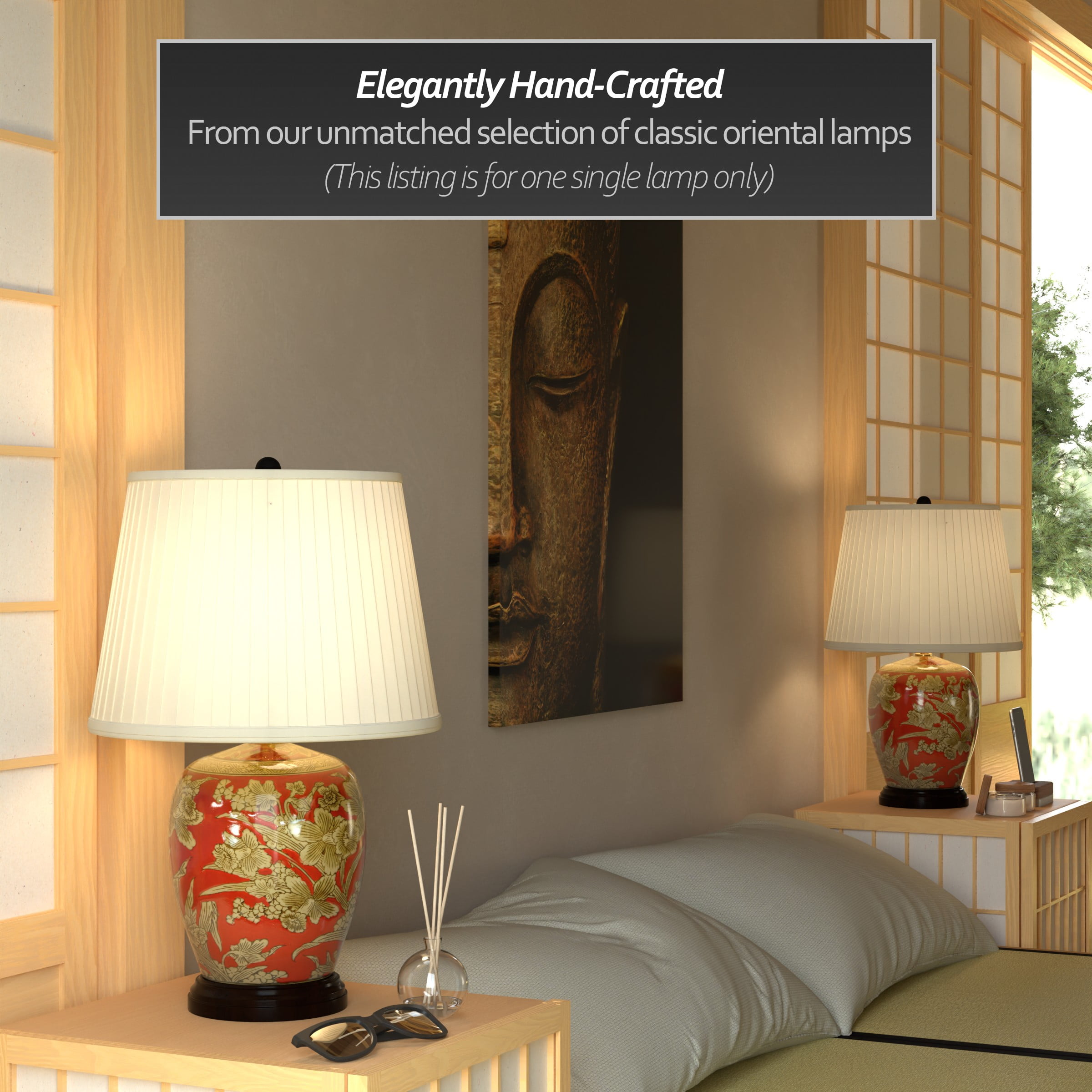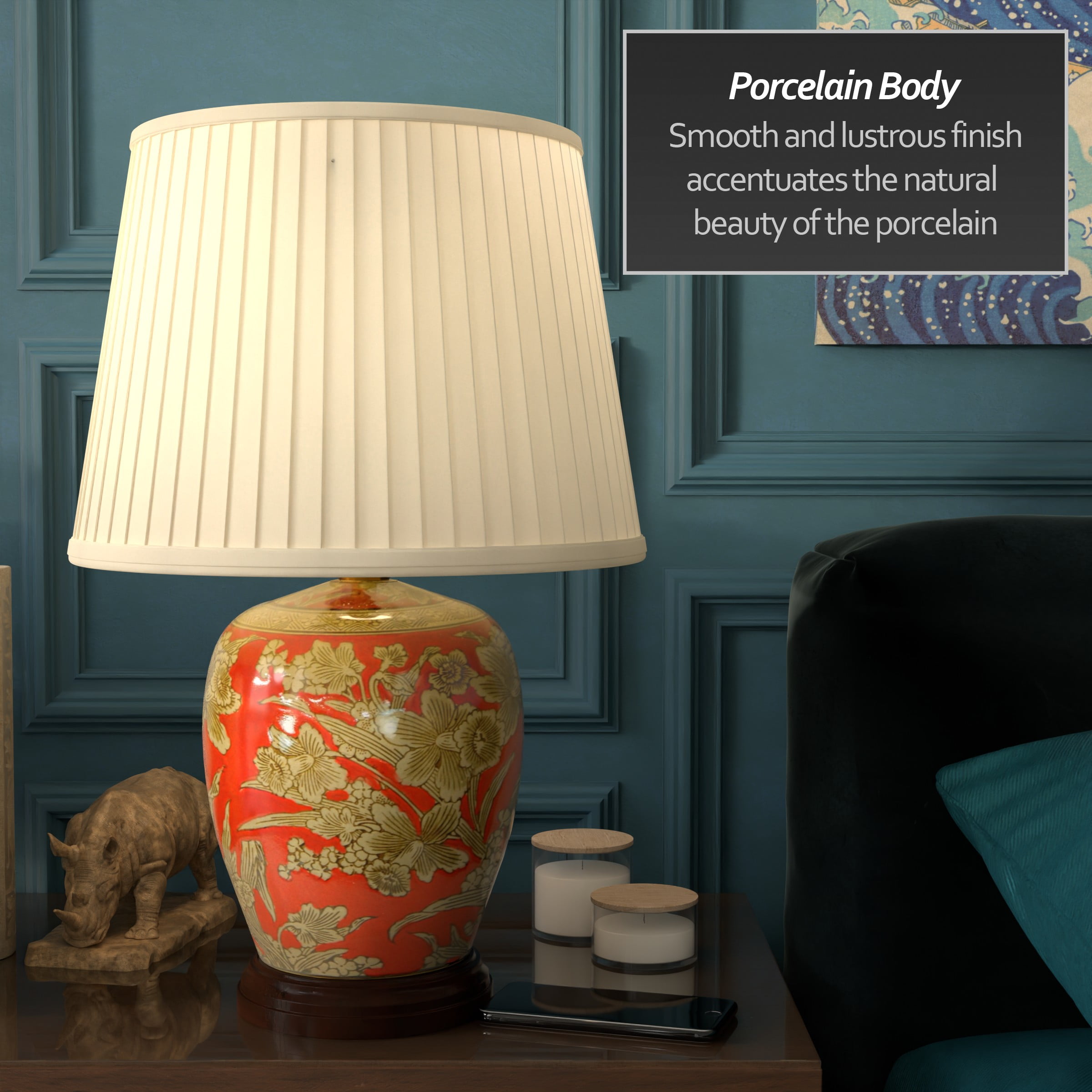 Melon jar shaped porcelain ceramic lamp in a rich red color with an intricate floral pattern in beige and brown. Lamp is mounted on a round rosewood base and ships with a pleated white lamp shade and decorative finial. UL approved hardware uses standard U.S. light bulbs, either fluorescent or incandescent. Product Features: Worldstock Country: China Setting: Indoor Fixture finish: Brass Shades: Off-white pleated fabric shade Socket Switch Number of lights: one Takes 1 three-way bulb, 100 watts max, not included Base dimensions: 1.5 inches high x 6.5 inches deep Dimensions: 21 inches high x 14 inches wide x 14 inches deep Story Behind the Art: This handcrafted item comes from a third generation family-run workshop in mainland China. Their skills of hand-painting, hand-rubbed lacquering and hand-tooling have been passed down for many generations. We are proud to support them in their quest to keep their age-old techniques alive for future generations. These masters are highly respected in their craft and their culture which have survived through many Chinese dynasties. What is Worldstock? The handcrafted touch of artisan skill creates variations in color, size and design. If buying two of the same item, slight differences should be expected. Note: Color discrepancies may occur between this product and your computer screen. Imported