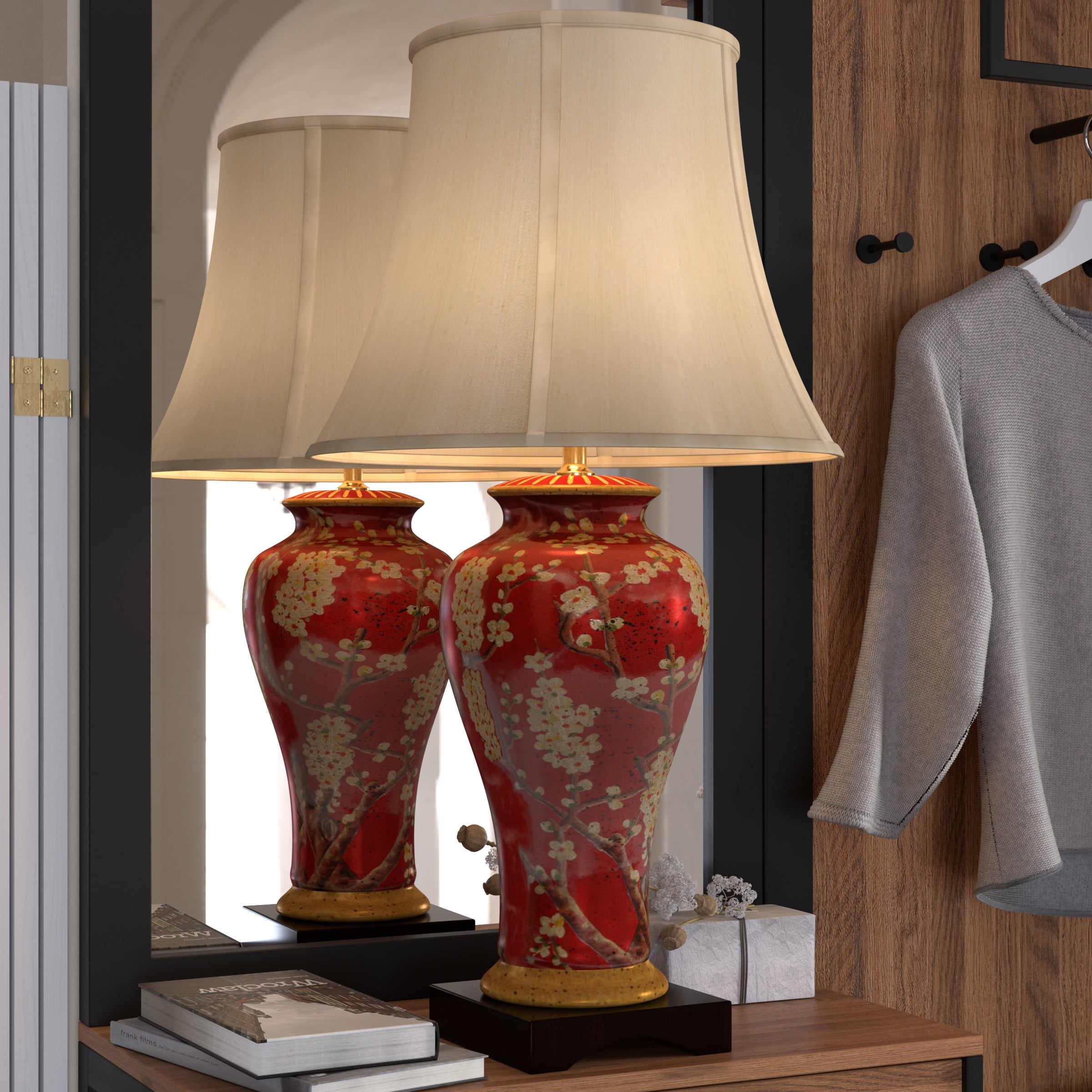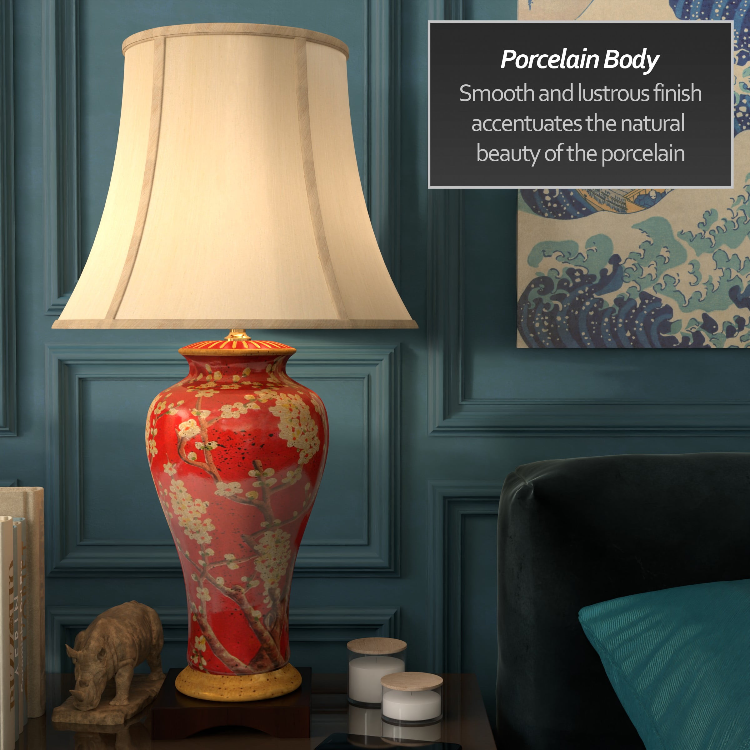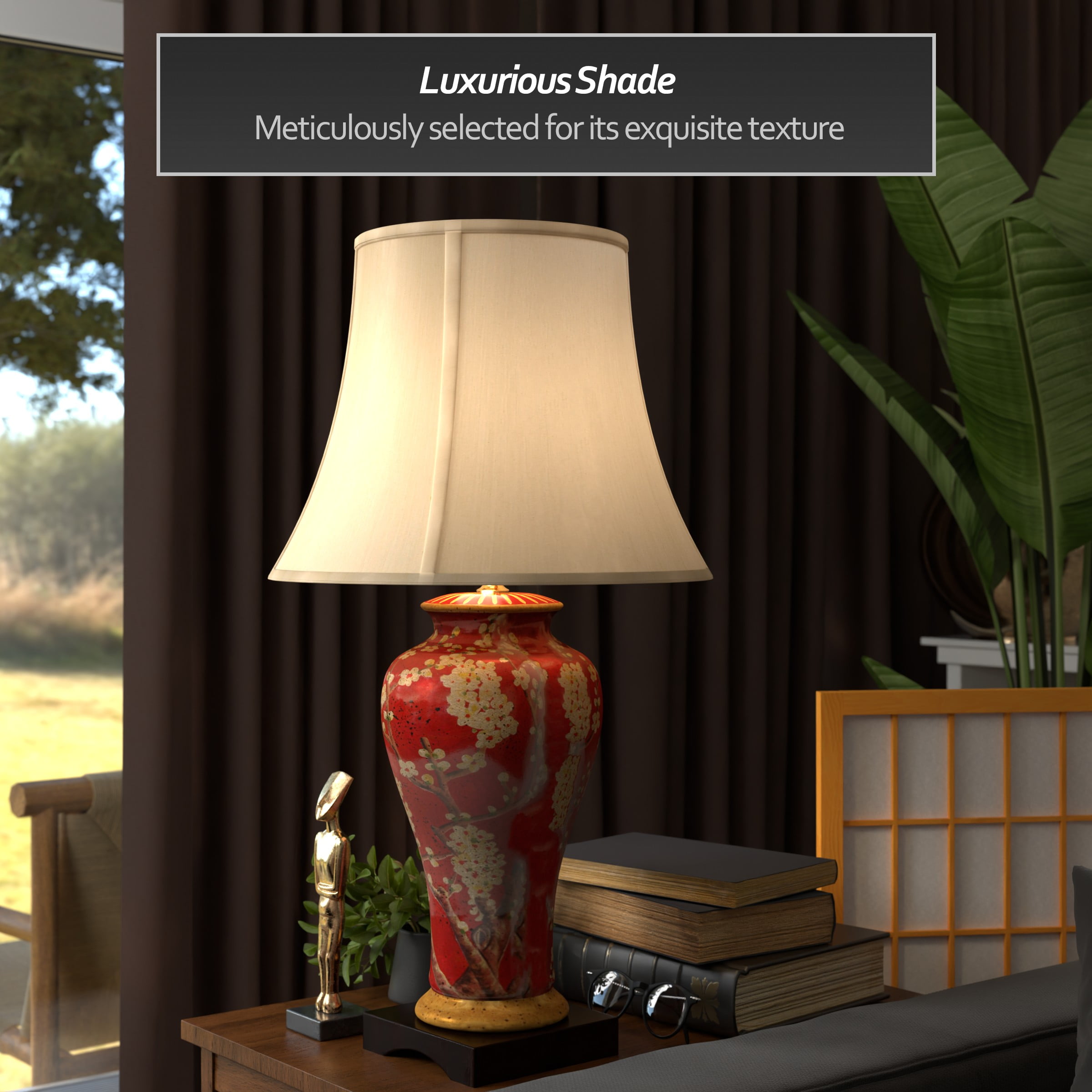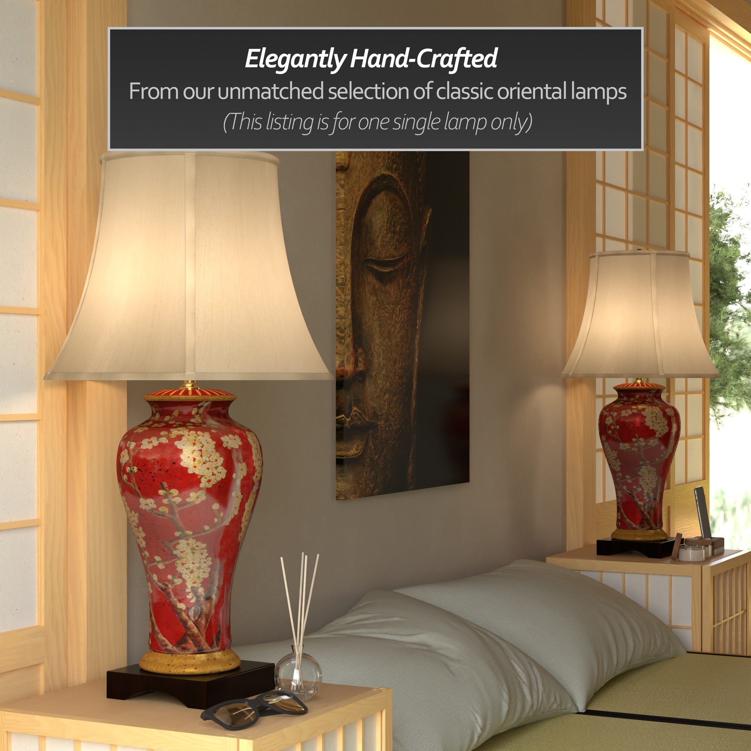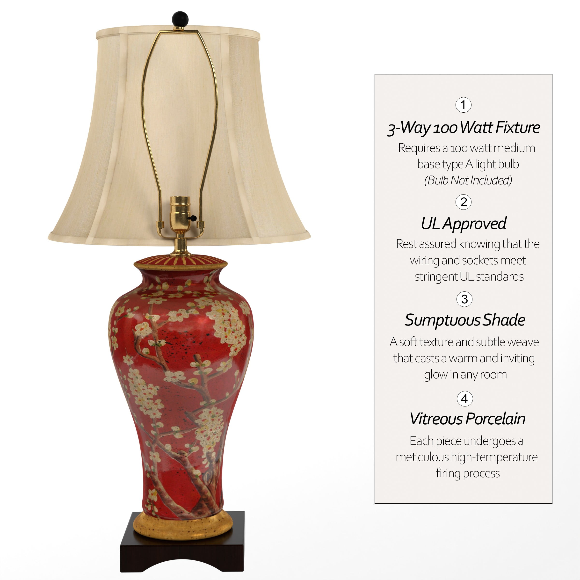 Elevate the ambiance of your living space with the exquisite charm of this handmade Floral Ecru Vase Lamp. Crafted with intricate detailing and subtle exoticism, this lamp is made from high-quality wood and features an ornate floral design in a rich red finish. The brass fixtures and rosewood stand add to its elegance, while the off-white bell-shaped sateen shade softens the light for a beautiful effect. Features: Worldstock Country: China Designed for indoor use Requires 3-way light bulb Works with standard incandescent and fluorescent bulbs Hardware and wiring meets UL standards Off-white sateen shade to soften light 30″H x 16″W x 16″D Includes a socket switch Brass fixture finish Story Behind the Art: This masterpiece is handcrafted by skilled artisans from a third-generation family-run workshop in mainland China. They have inherited the techniques of hand-painting, hand-rubbed lacquering, and hand-tooling from their ancestors. We take pride in supporting them as they strive to keep their age-old traditions alive for future generations. These artisans have earned immense respect for their craftsmanship and their culture, which has survived through many Chinese dynasties. What is Worldstock? The handcrafted touch of artisan skill creates variations in color, size, and design. If buying two of the same item, slight differences should be expected. Note: Color discrepancies may occur between this product and your computer screen. Imported.