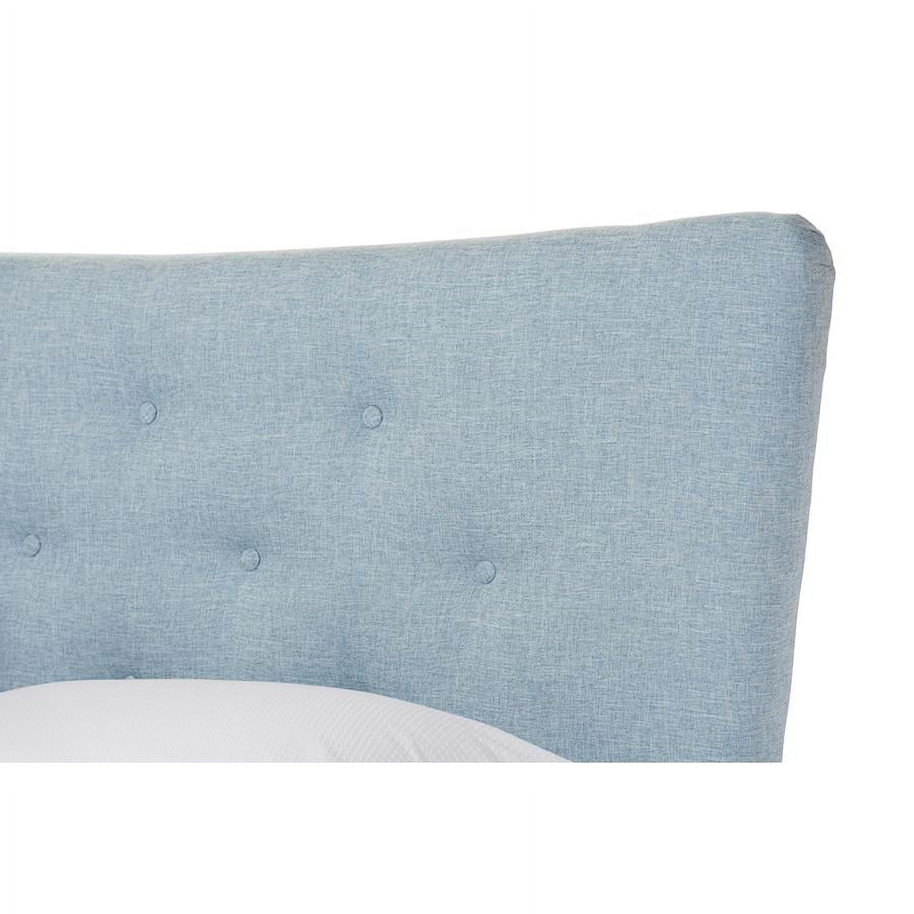 Modern platform bed Sky blue polyester fabric upholstery over padded frame Button-tufting detailing with graceful curved Solid rubberwood straight-tapering legs Self-assembly required Made in Malaysia