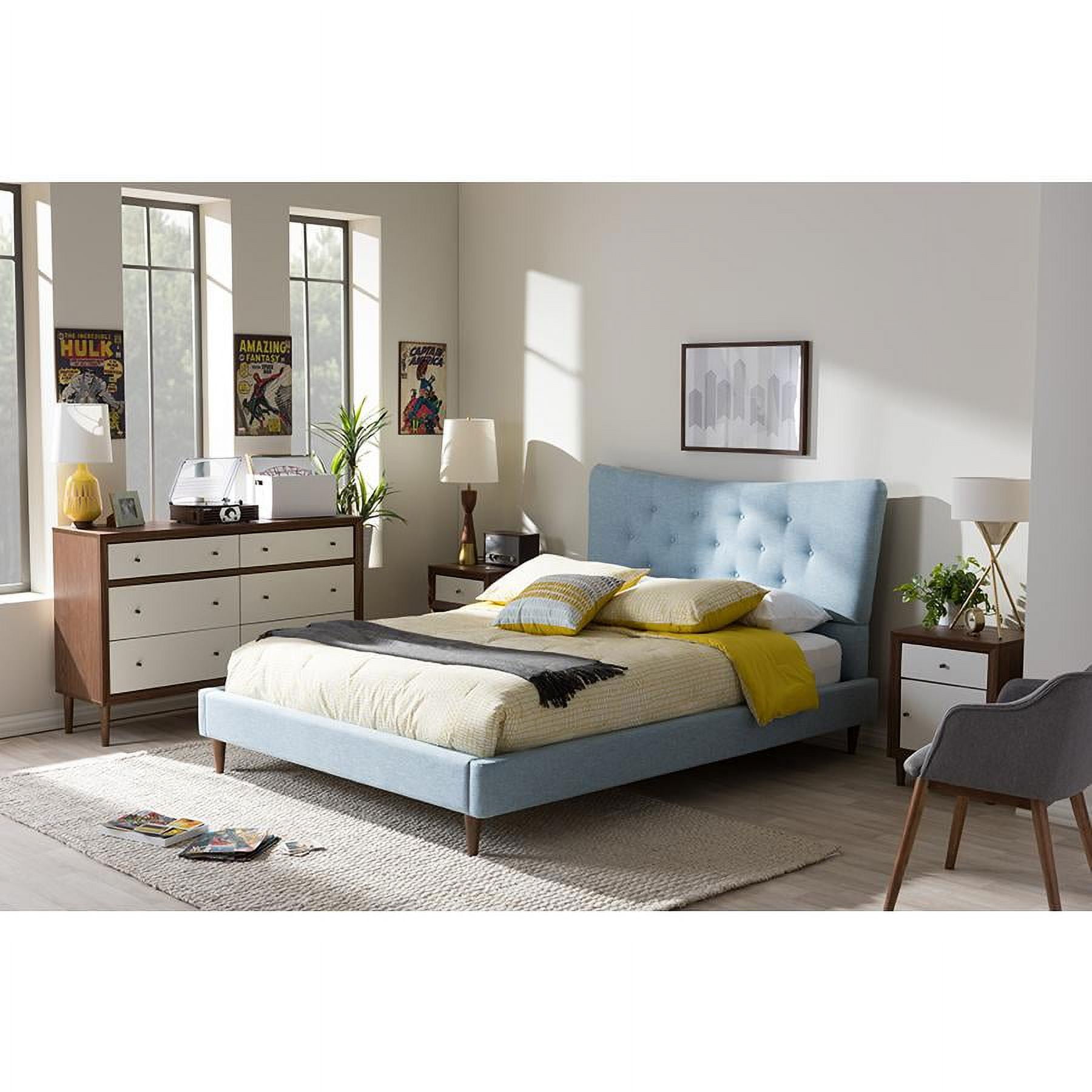 Elegantly and sculpturally designed, the Hannah mid-century modern king size sky blue fabric platform bed features graceful curves with button-tufting detailing. Constructed of solid rubberwood and plywood frame, matching with walnut finishing solid rubberwood straight-tapering legs, the clean silhouette that define mid-century modern furniture, the Hannah will support a solid structure for your every night’s sweet dream. Buttoned, padded headboard in a soft, tactile and durable fabric consisting of a mix of polyester and viscose provides a cozy appeal to the bed, allowing you to prop up and read while remaining stylish in its framing. The bed has a high quality build and benefits from a strong sprung slatted wooden base that acts as a flexible and supportive platform for your mattress. These curved slats adjust to your body`s movement, providing pressure sensitive support to keep your spine in good alignment and increase your comfort levels. To provide additional stability to the fram Features: Finish: Light Blue Material: Fabric (Polyester 100%) / Rubberwood / MDF / Plywood / LVL / Wood / Foam Modern platform bed Sky blue polyester fabric upholstery over padded frame Button-tufting detailing with graceful curved Solid rubberwood straight-tapering legs Self-assembly required Specifications: Product Dimensions: 45.44″ H x 83.07″ W x 87.56″ D Product Weight: 122 lbs