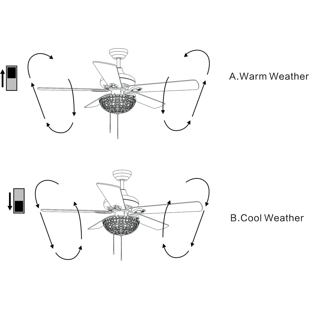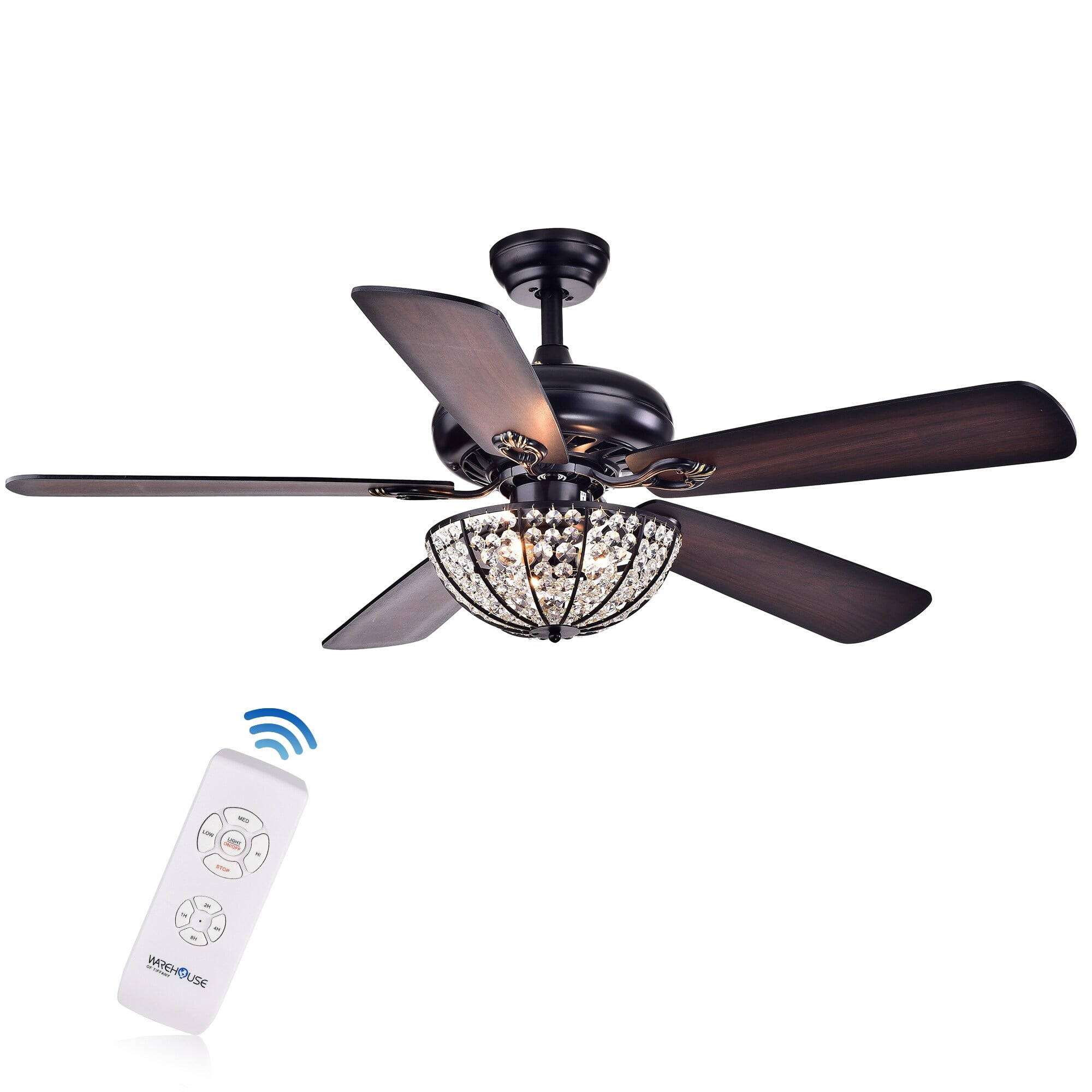 Cool down your living room while flaunting your eye for traditional design with this Hannele ceiling fan by Warehouse of Tiffany. The clear crystals on the bowl-style shade reflect illumination from the three lights throughout your space for an enchanting ambiance. Rely on this fan’s durable metal and wood construction for lasting utility. Chandelier Ceiling fan Crystal bowl Shade Pull Chain OR Remote Control Fixture finish: Black metal Shades: Crystal and metal Number of lights: Three (3) Requires Three (3) E26 @ 60-watt bulbs (not included) Dimensions: Overall dimensions: Ø 52 in x H 21.1 in Motor size: 6 x 0.6 inches Motor house size: 11.4 x 8.7 inches Downrod Length(s): 4.9 in / 9.8 in Max Shade: 12.2 x 7.2 inches Blade Length: 20.5 inches Blade Width: Head-6.3 in; Tail-4.7 in Blade Thickness: 0.2 in Blade Pitch: 12.5° Canopy: Ø 5.9 x H 2.25 inches Fan Efficiency: 166 RPM (Level 1) 5146 CFM 116 RPM (Level 2) 3596 CFM 65 RPM (Level 3) 990 CFM Motor Power: 68W Note: This product requires a Professionally Licensed Electrician for installation.